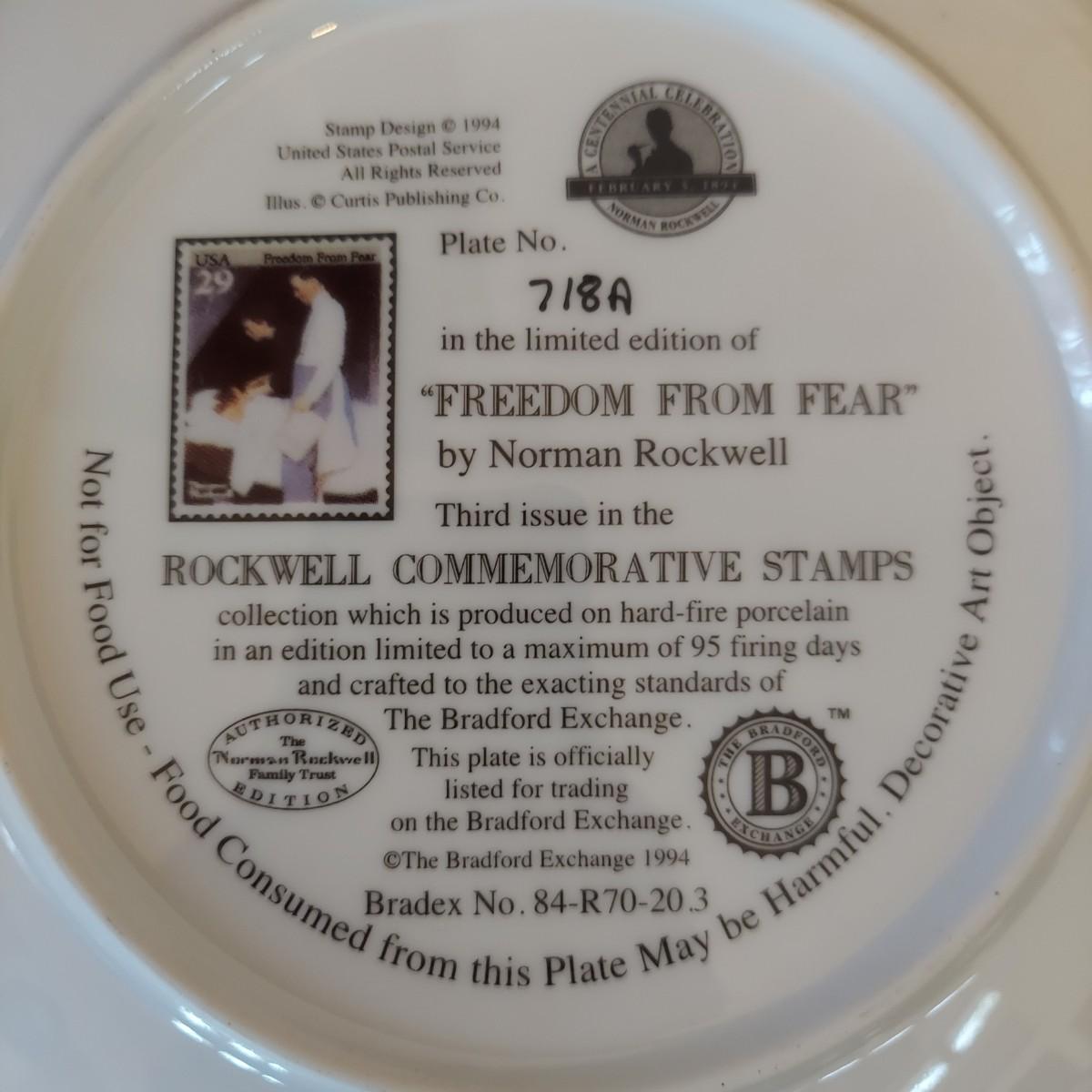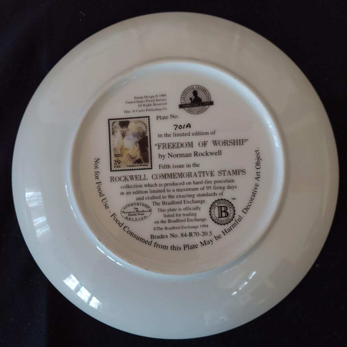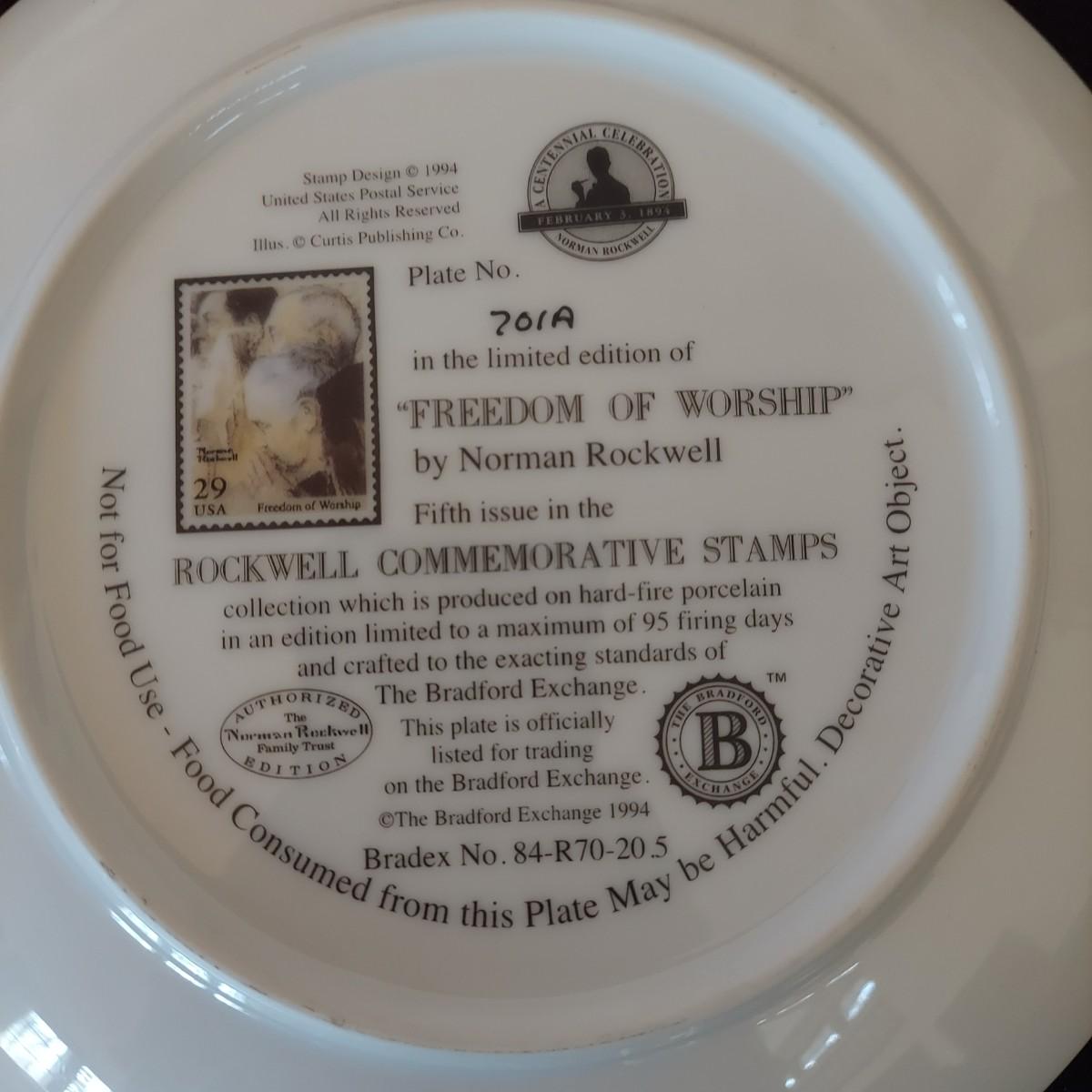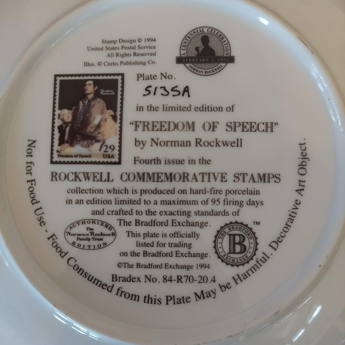 Lot of five collectible Norman Rockwell plates featuring works by the artist that were featured on commemorative stamps. The Bradford Exchange 1994. Plates are 8"D. Also includes seven collectible plate frames. Frame measures approximately 11"D. Made for an 8-8.5"D plate. Some have scratches. Please see photos. Shipping available. Shipping can be costly. We suggest contacting our preferred local shipping provider, Postage Express, with dimensions and getting an estimate before bidding: (828) 670-5501 or postageexpress@yahoo.com.