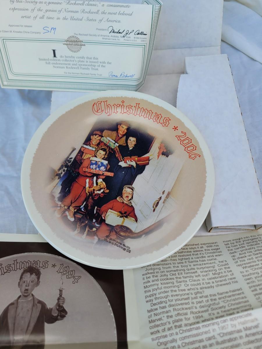 This specific plate, dated 2006, is part of a series of Norman Rockwell Christmas collector plates.