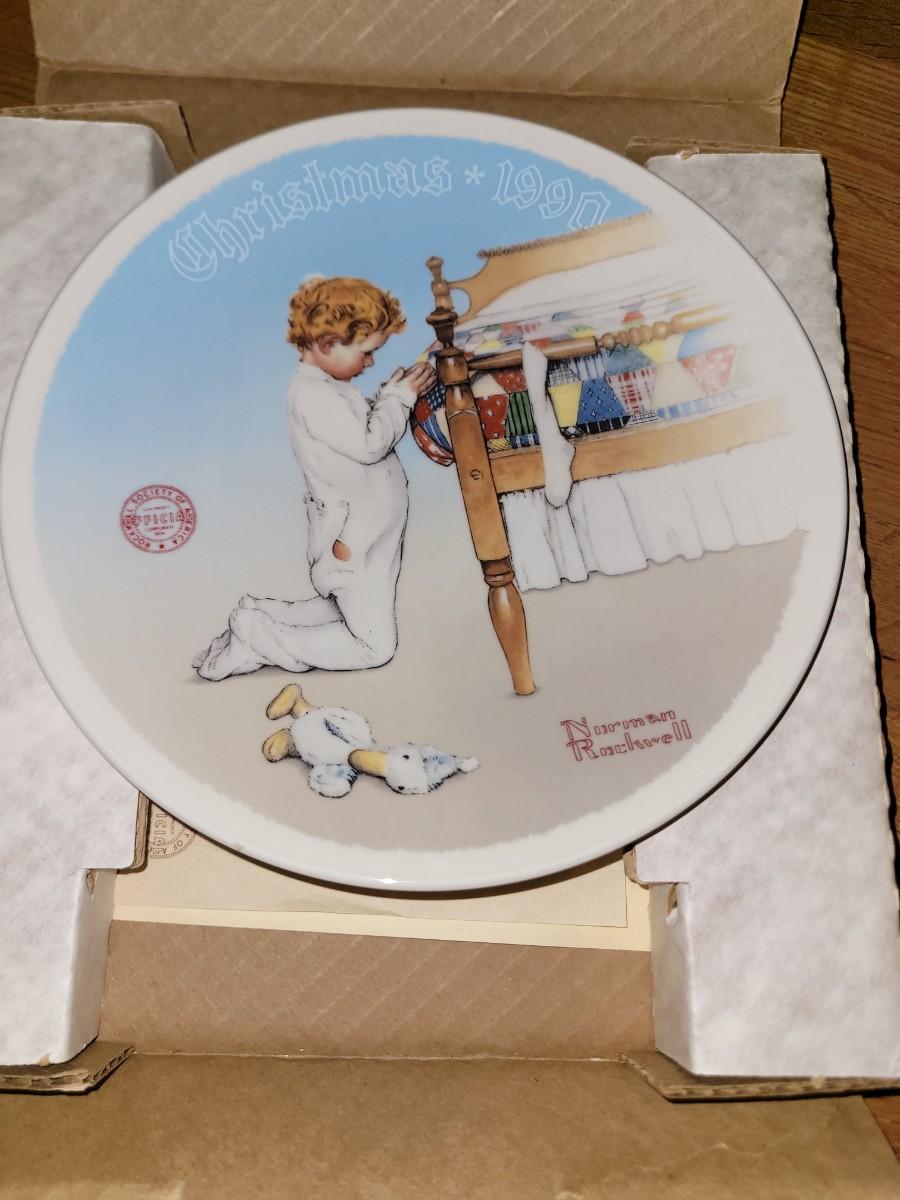 It features an image of a young boy kneeling by his bed in prayer, with the text "Christmas * 1990" and "Norman Rockwell" on the plate face.