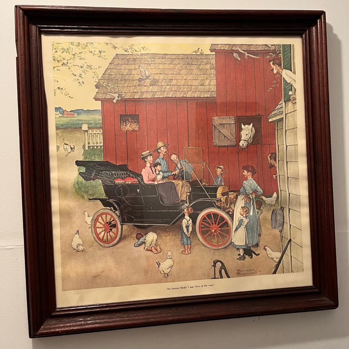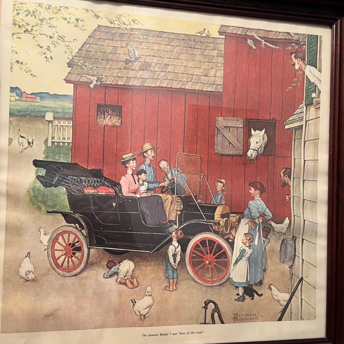 Lot includes a wooden framed Norman Rockwell print titled “The Famous Model T was Boss of the Road”. Frame measures 23.5” x 23.5”.