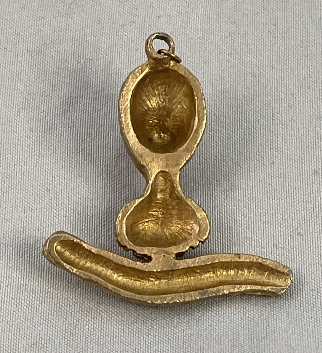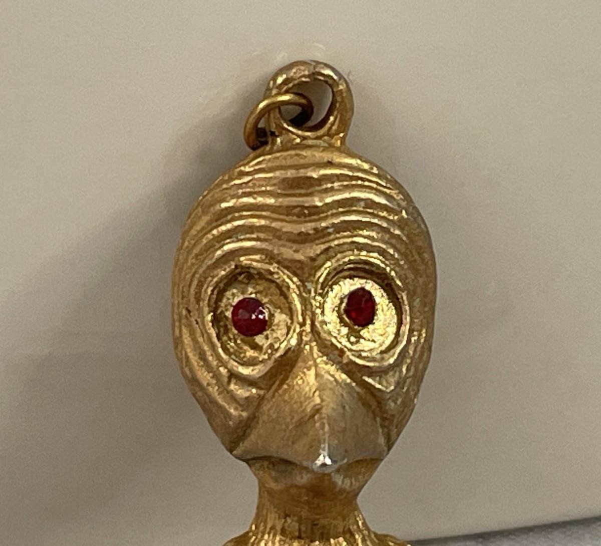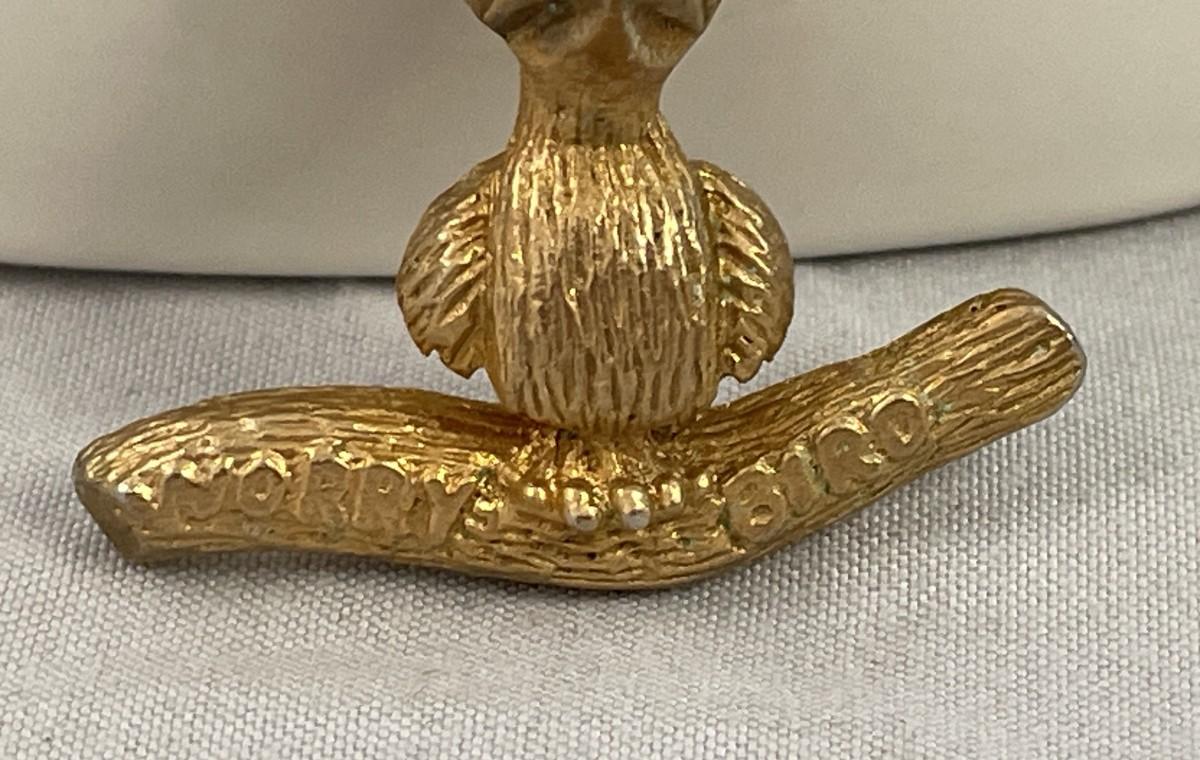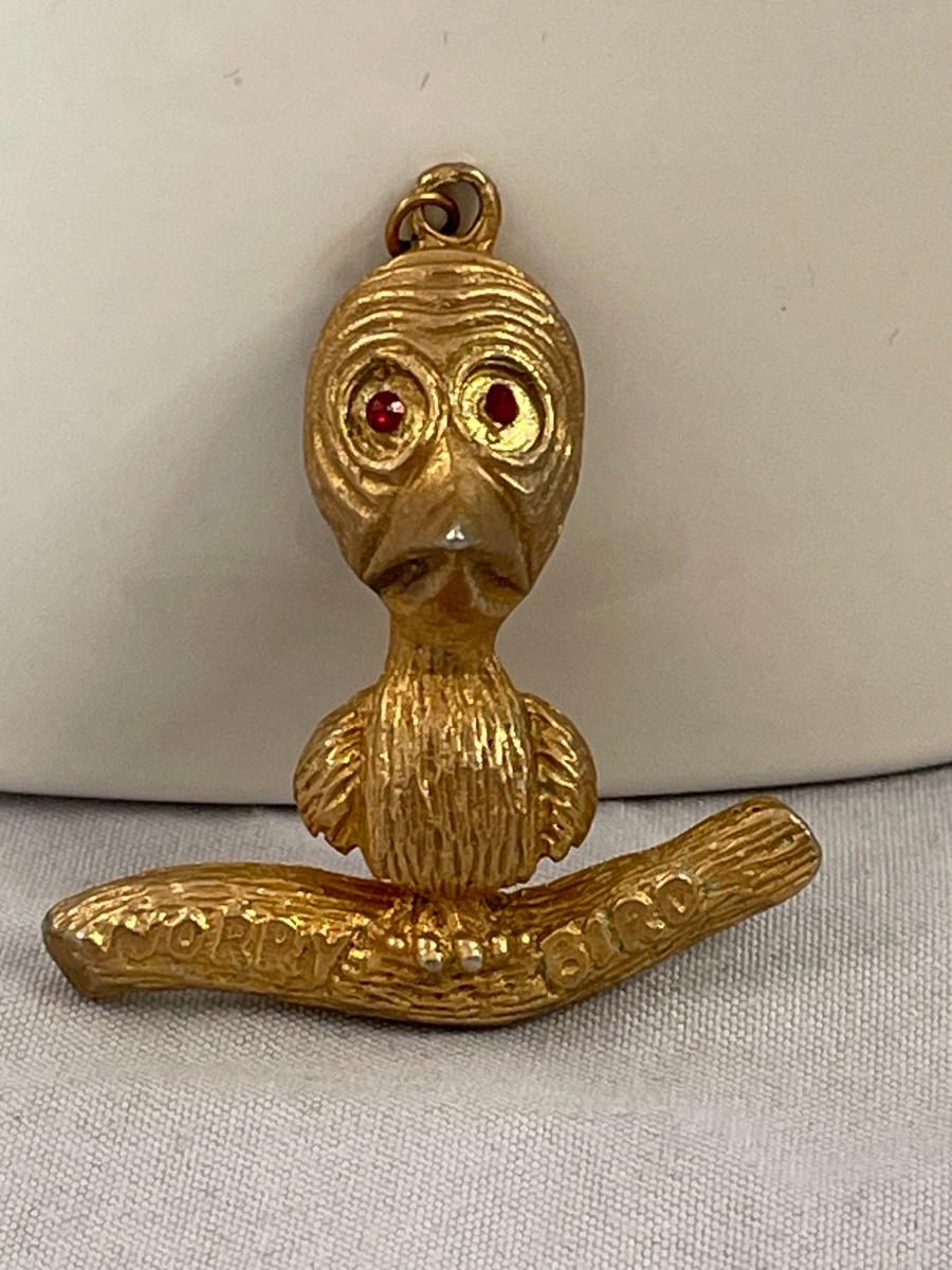 This pendant is made from a gold tone metal and has red glass eyes. It is marked NORRY BIRD on the front and is about 1.5 inches by 1.5 inches.