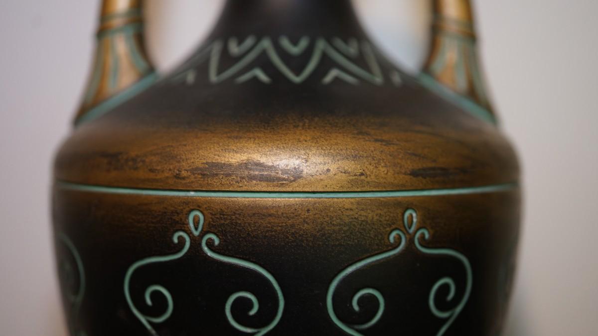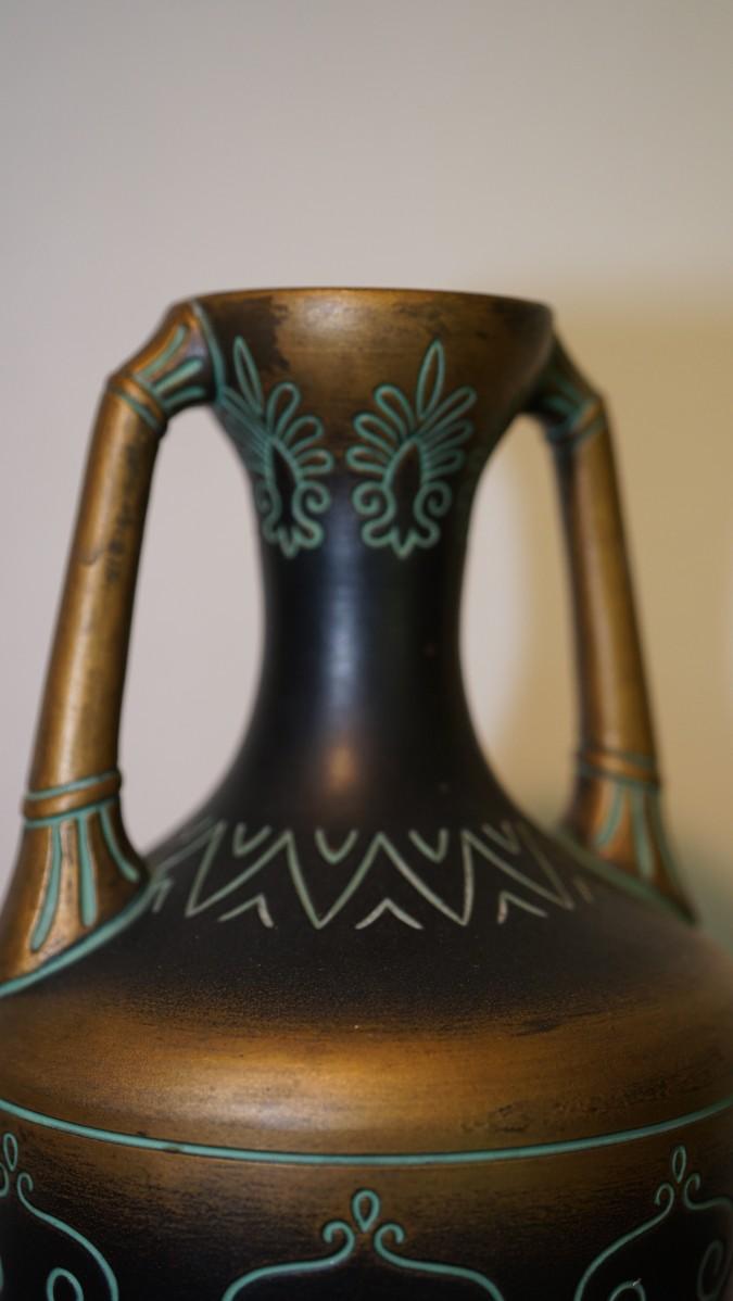 NORSE HANDLED VASE / INCISED DECORATION/ BRONZE UNDERTONES 14"