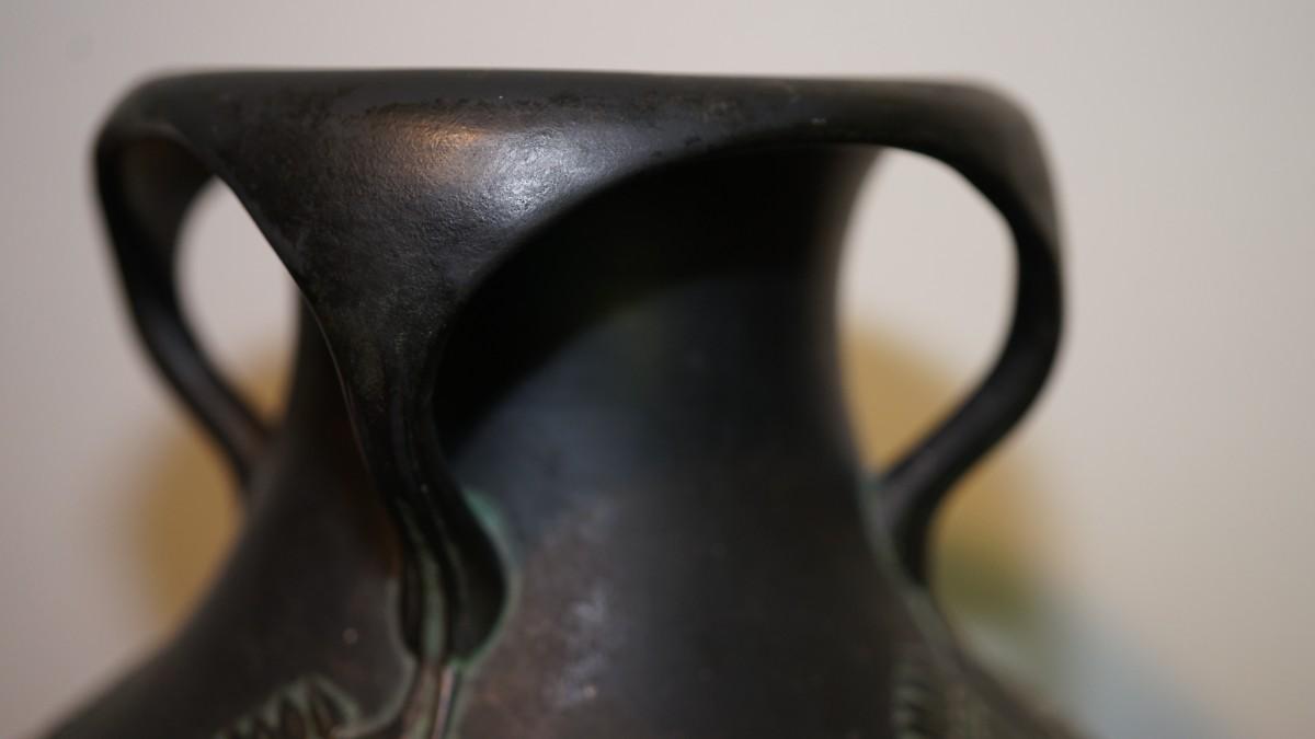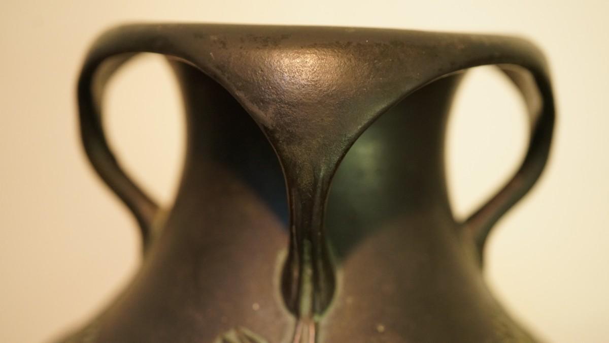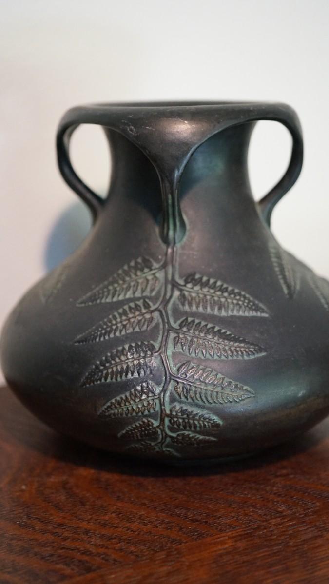NORSE POTTERY FOUR HANDLED VASE FERN PATTERN , BRONZE UNDERTONE AS IS