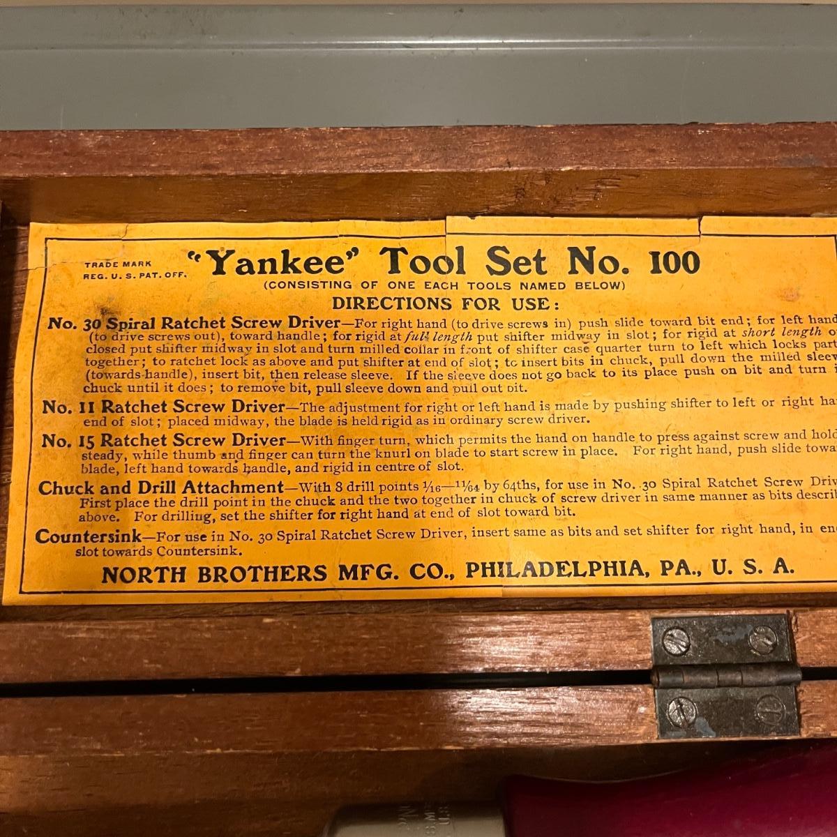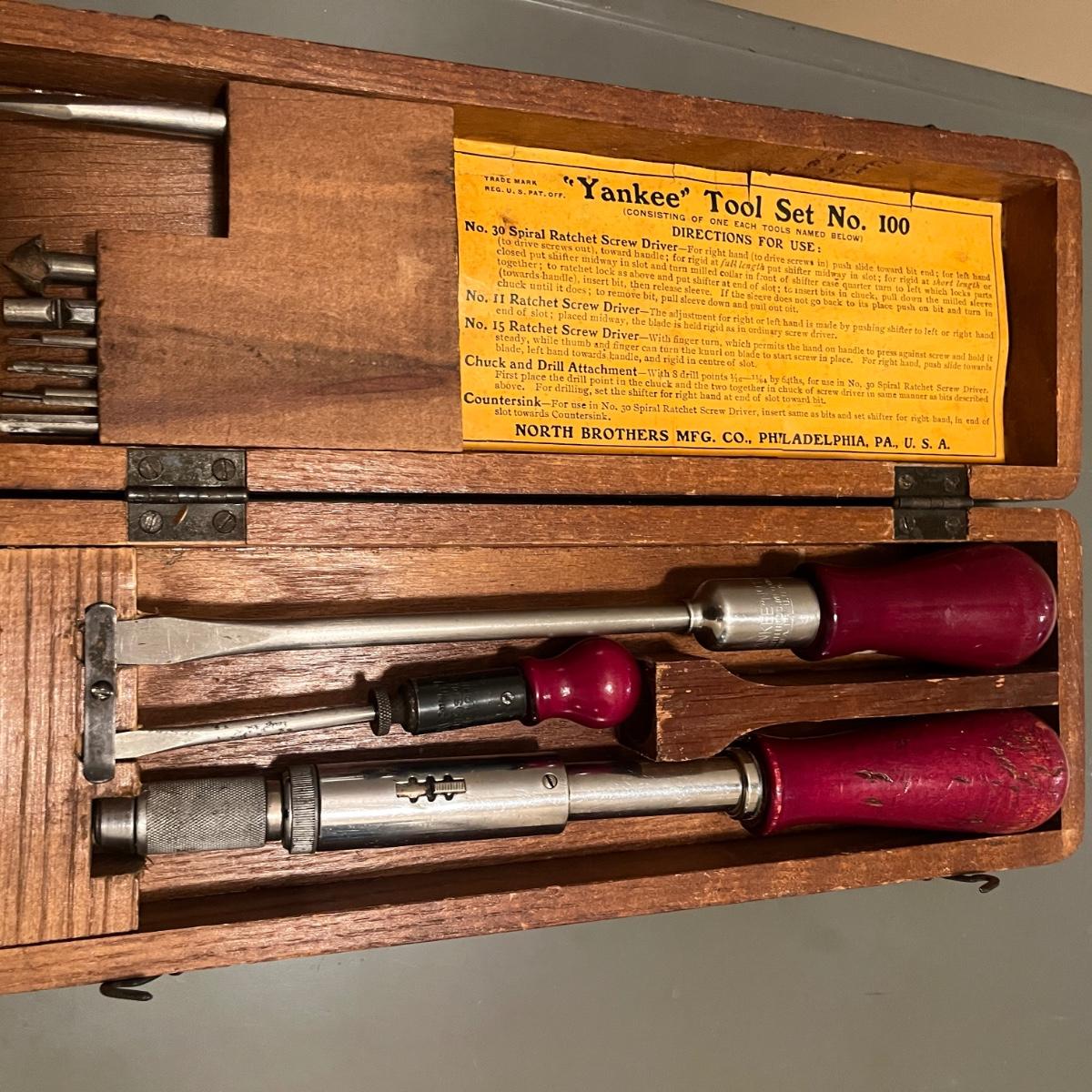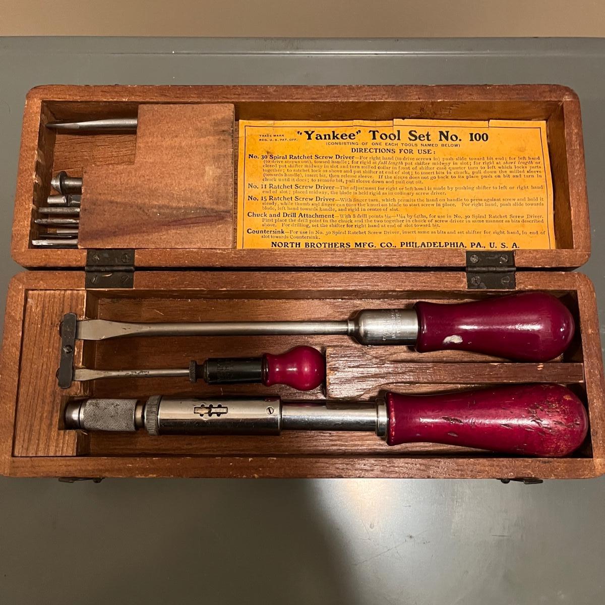 Lot includes a North Brothers Yankee Tool Set #100 in original wooden box. Box measures 12” x 4” x 2.5”H. Set appears to be missing two screwdriver tips and one screwdriver has broken tip, see pictures. Also includes a Yankee Automatic Drill # 47 in original box.
