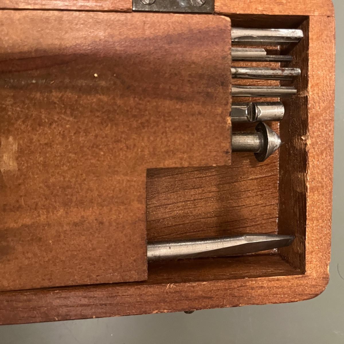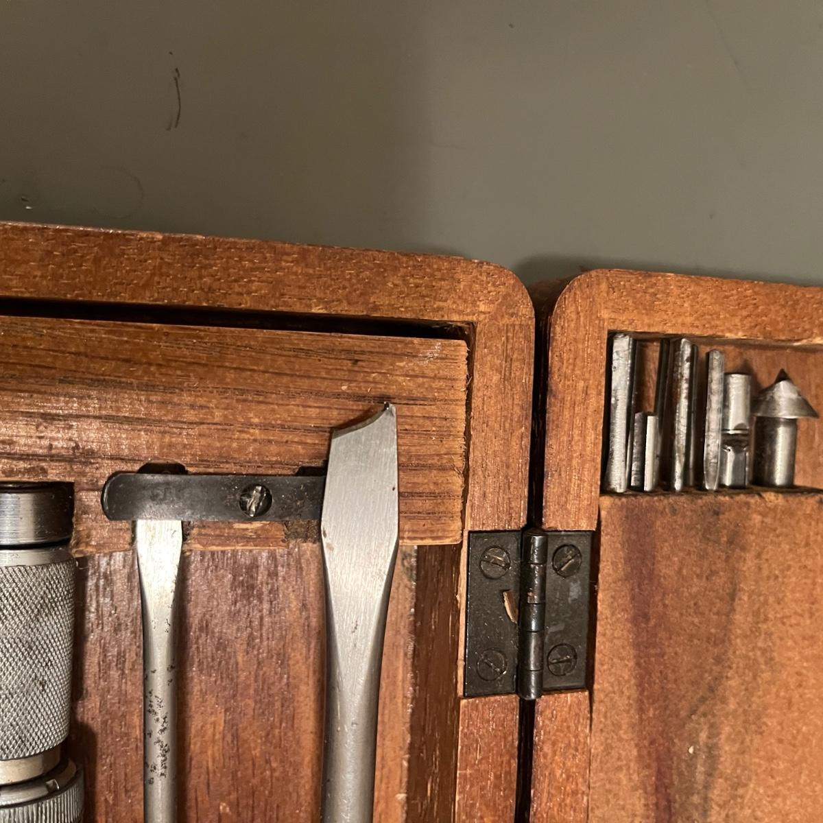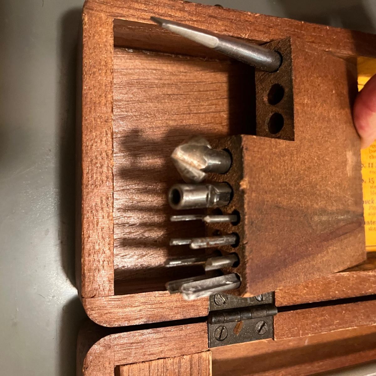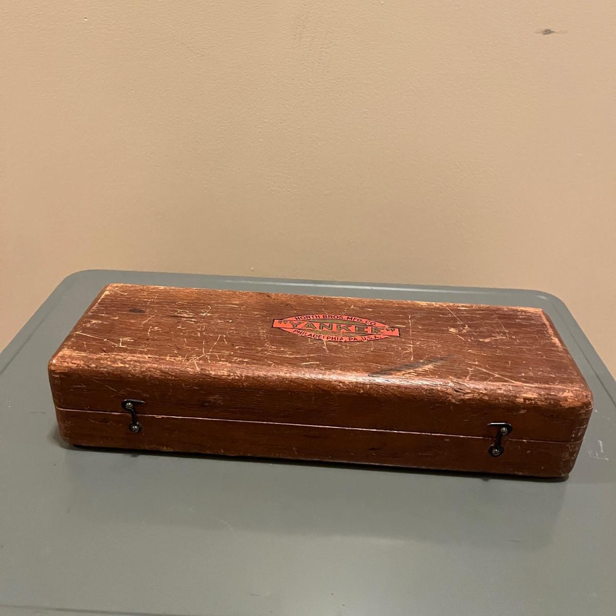 Lot includes a North Brothers Yankee Tool Set #100 in original wooden box. Box measures 12” x 4” x 2.5”H. Set appears to be missing two screwdriver tips and one screwdriver has broken tip, see pictures. Also includes a Yankee Automatic Drill # 47 in original box.