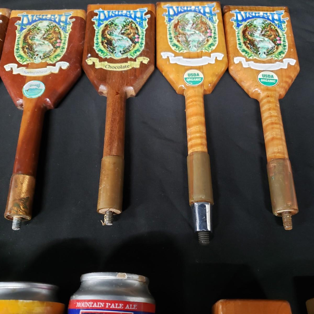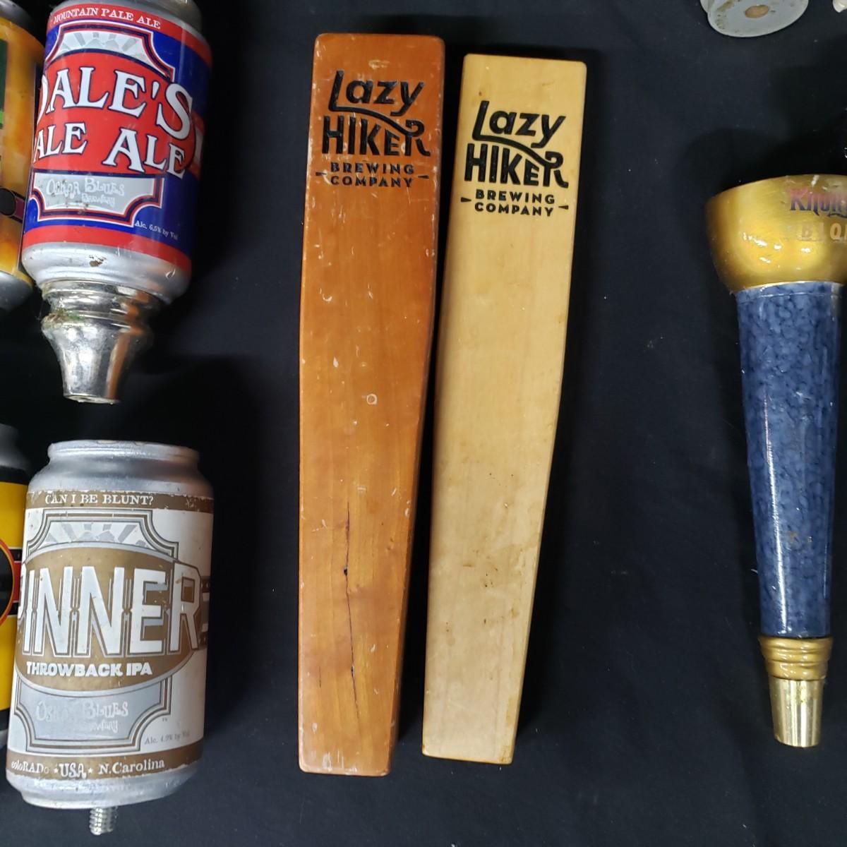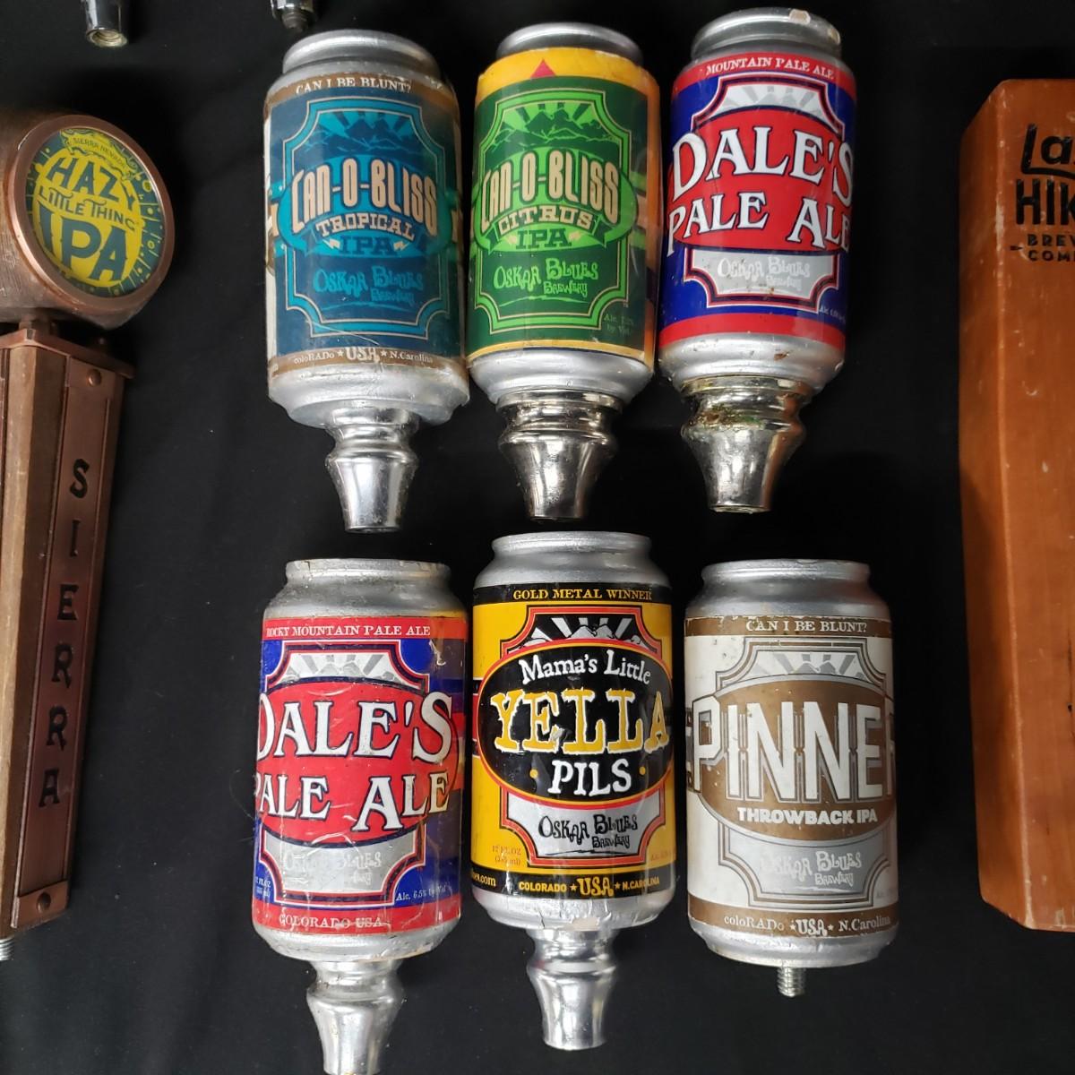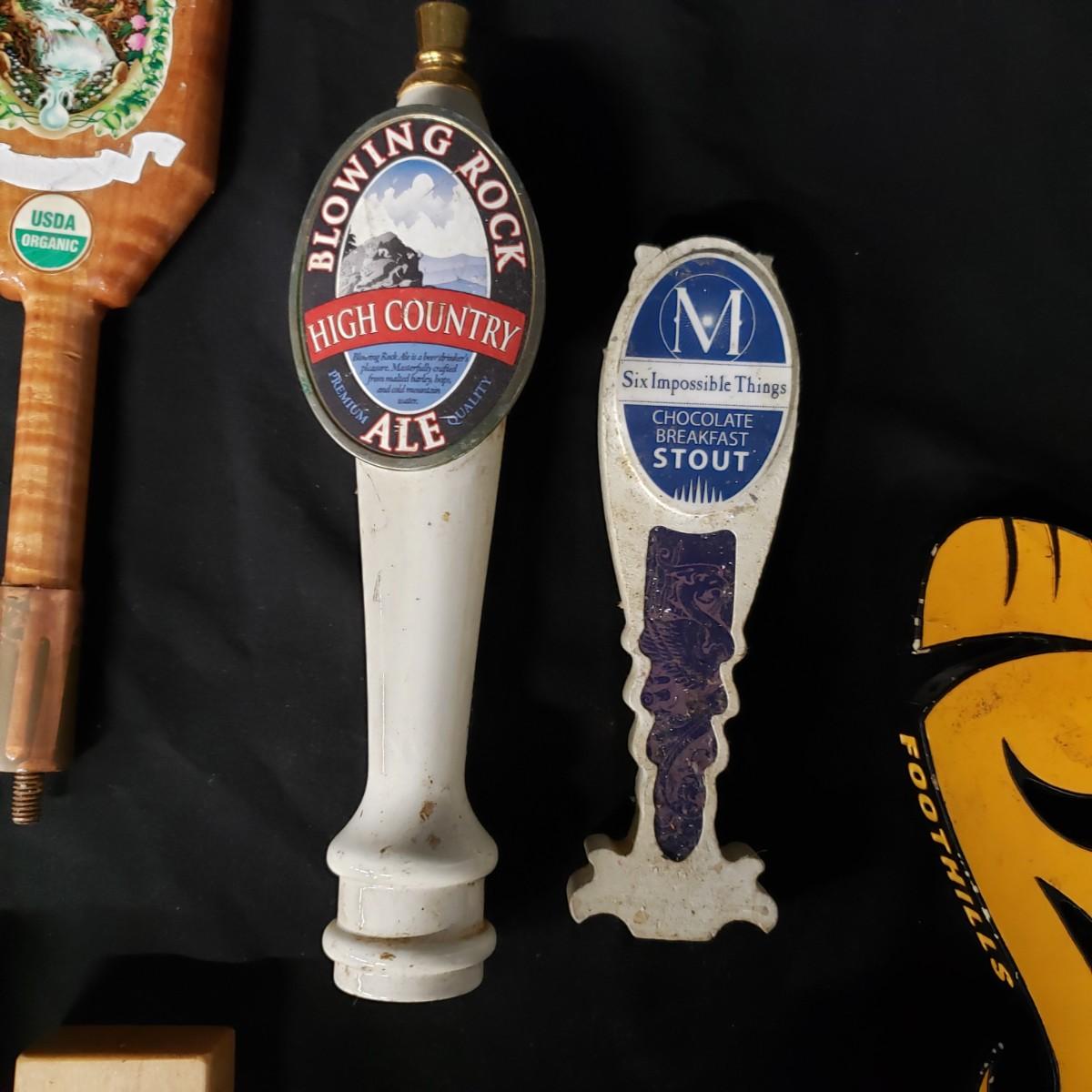 26 various beer taps from North Carolina Breweries. 6 Oskar Blues (6.5"x 3"), 3 Sierra Nevada (3"x11.5"), 2 Lazy Hiker (2"x11"), 2 Granite Falls (2.5"x8.5"), 2 Foothills (1"x12"), 1 High Country (2"x10"), 9 Pisgah (.5"x11") and 1 Mystery (1"x7.5", has a broken top piece). All taps are primarily made of wood. Shipping available.