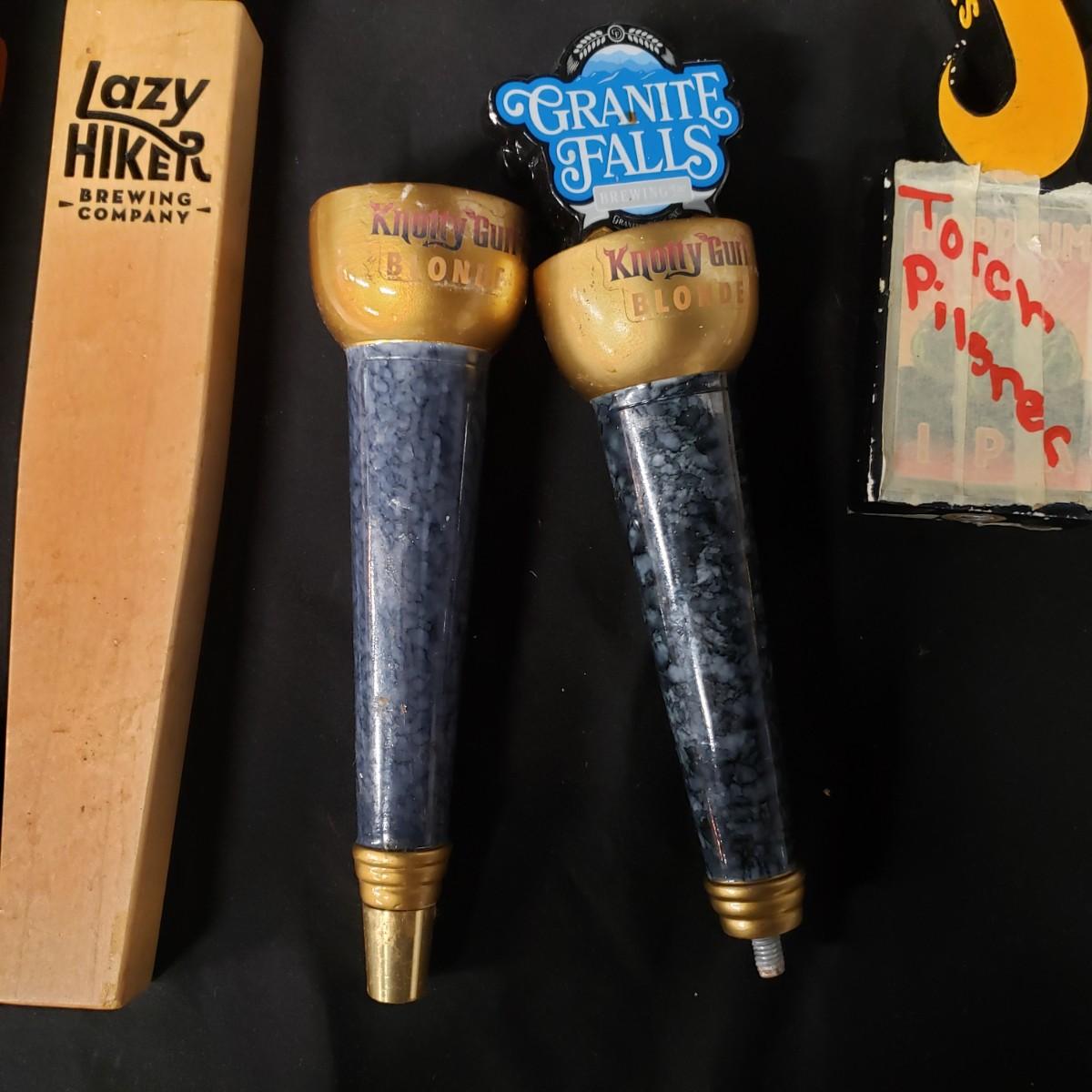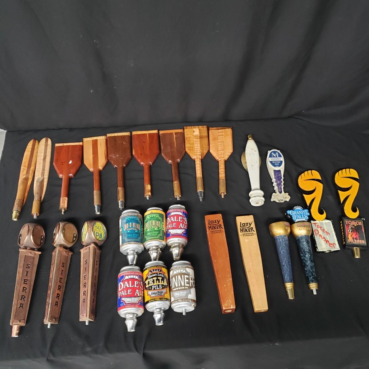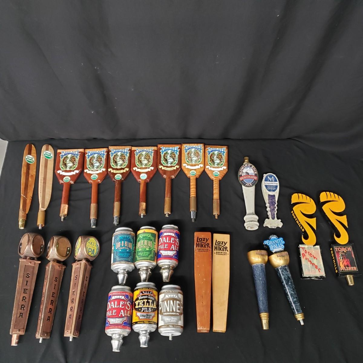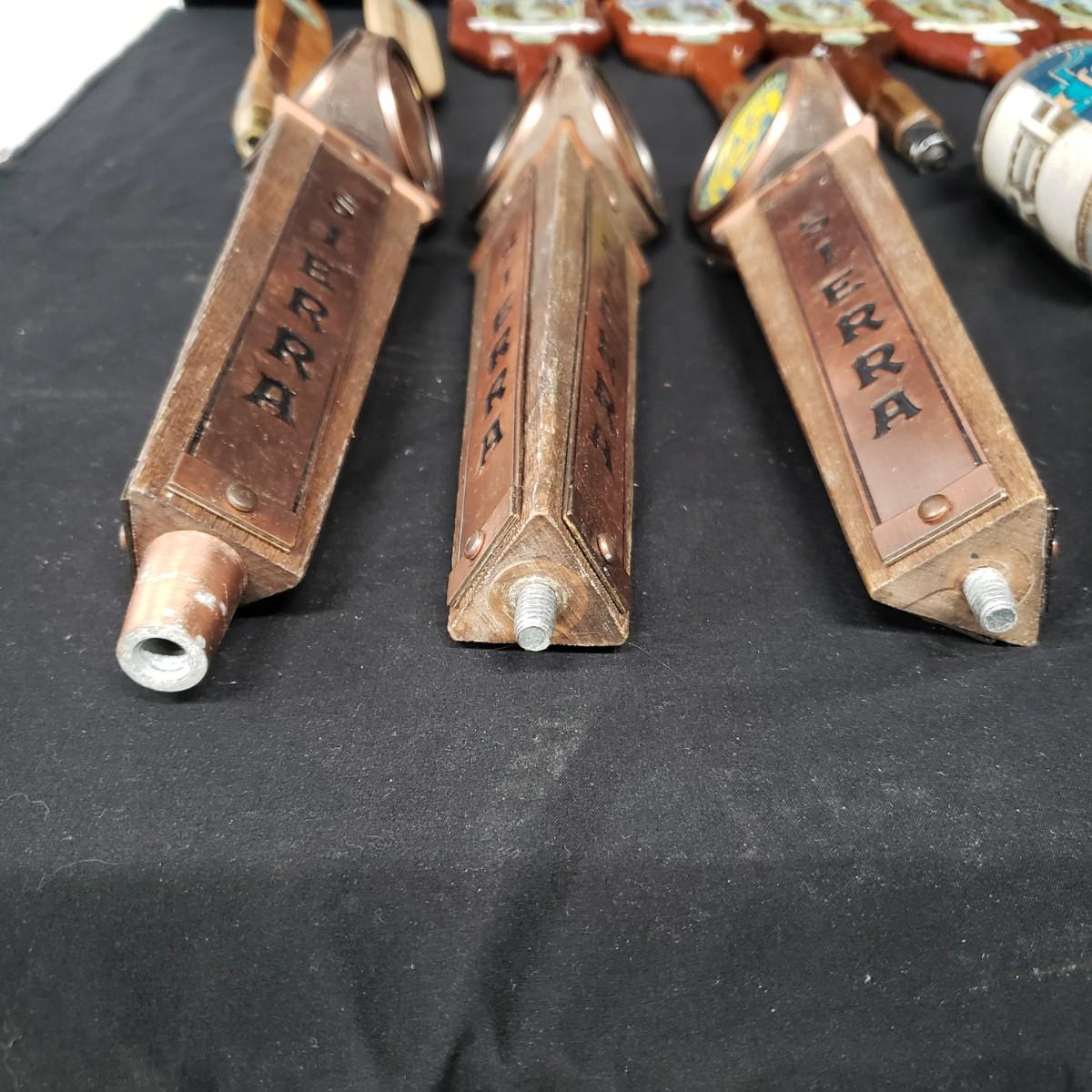 26 various beer taps from North Carolina Breweries. 6 Oskar Blues (6.5"x 3"), 3 Sierra Nevada (3"x11.5"), 2 Lazy Hiker (2"x11"), 2 Granite Falls (2.5"x8.5"), 2 Foothills (1"x12"), 1 High Country (2"x10"), 9 Pisgah (.5"x11") and 1 Mystery (1"x7.5", has a broken top piece). All taps are primarily made of wood. Shipping available.