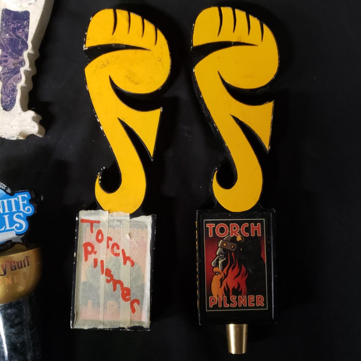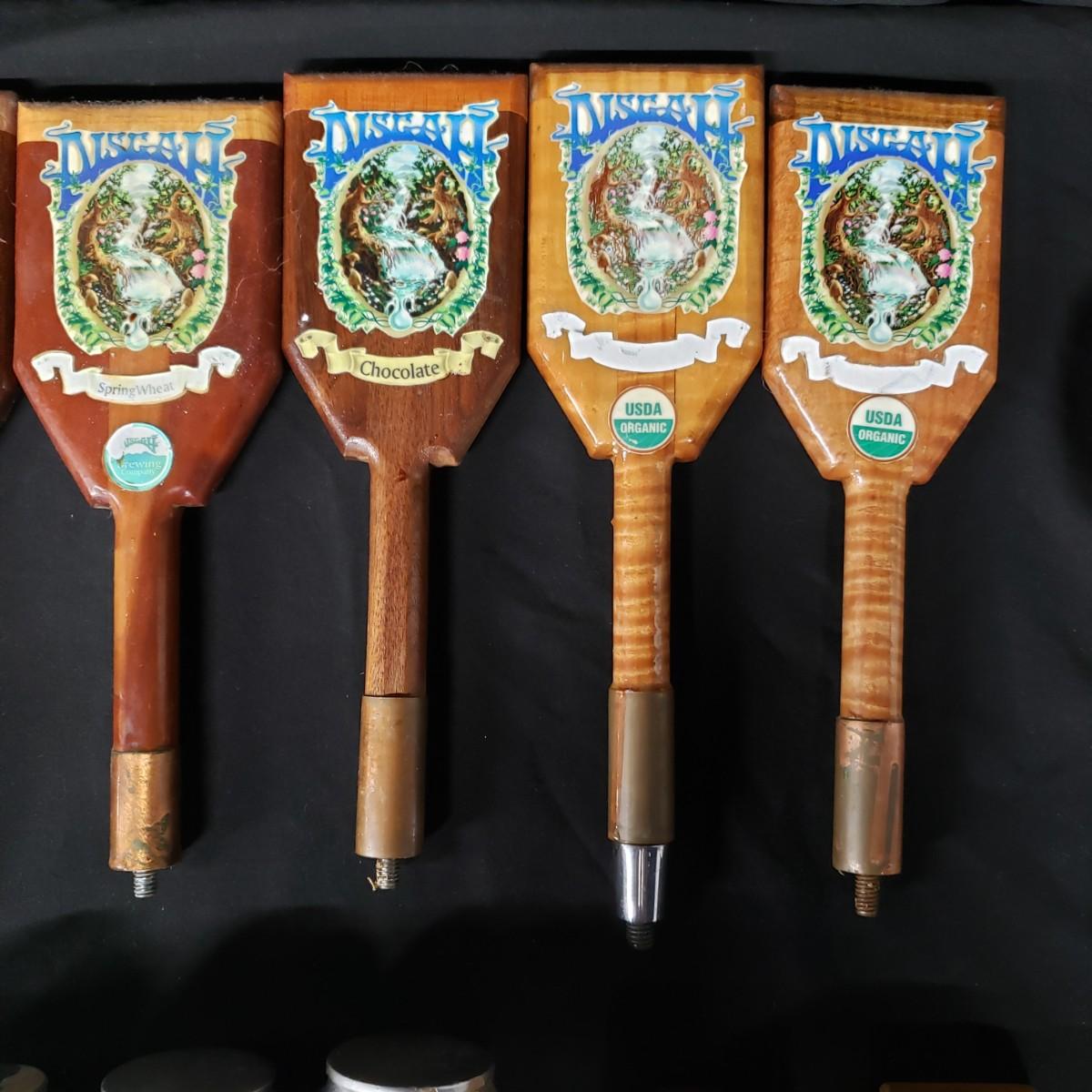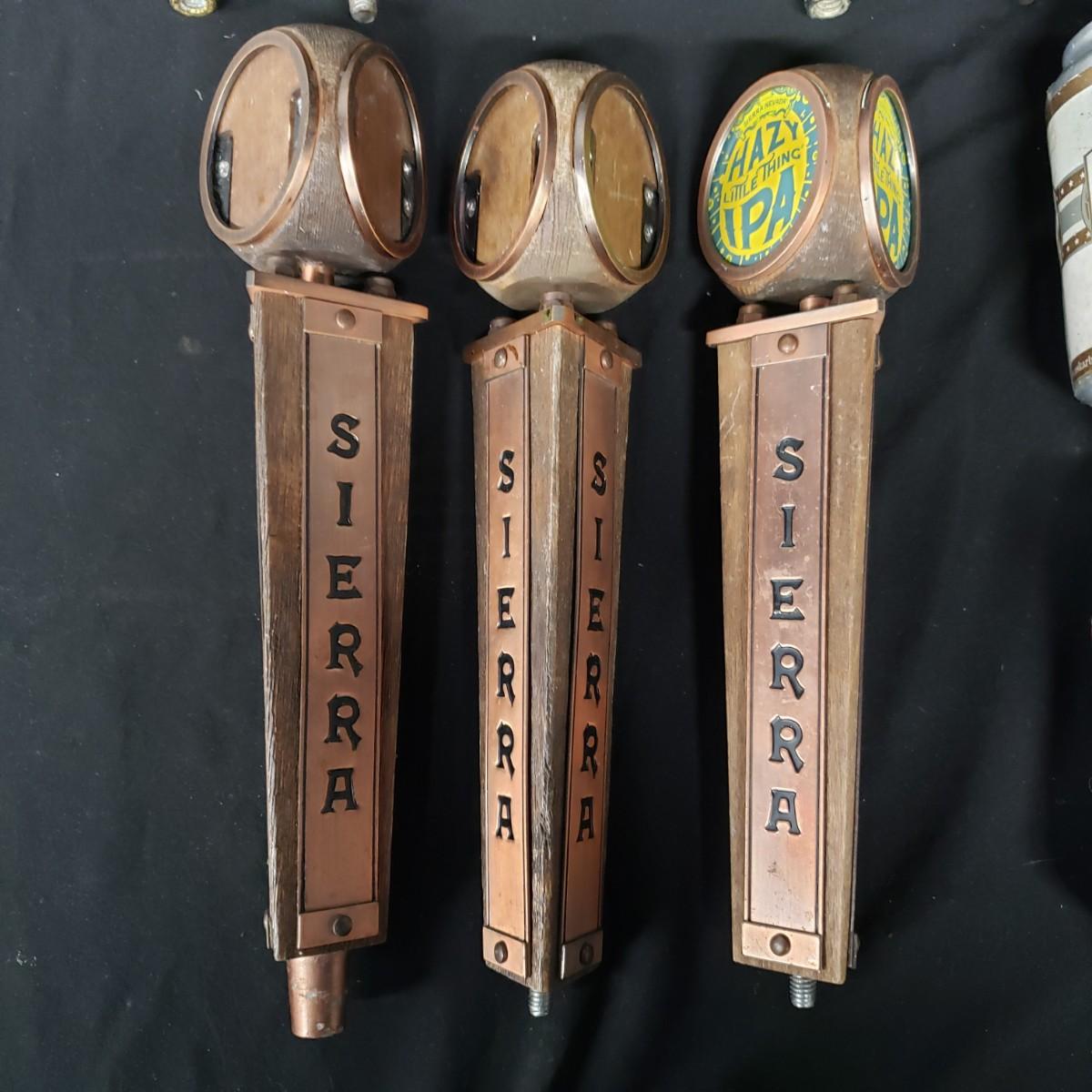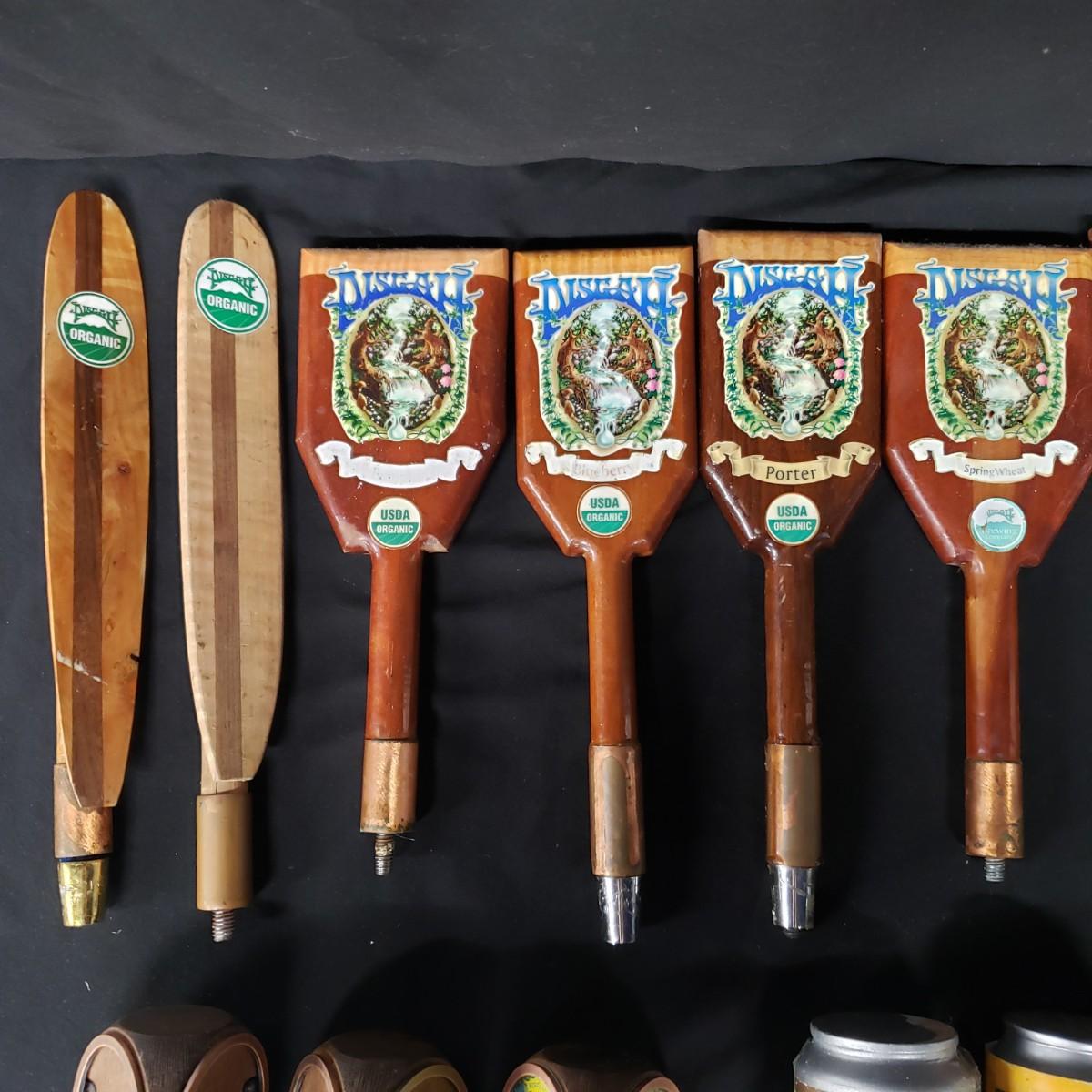 26 various beer taps from North Carolina Breweries. 6 Oskar Blues (6.5"x 3"), 3 Sierra Nevada (3"x11.5"), 2 Lazy Hiker (2"x11"), 2 Granite Falls (2.5"x8.5"), 2 Foothills (1"x12"), 1 High Country (2"x10"), 9 Pisgah (.5"x11") and 1 Mystery (1"x7.5", has a broken top piece). All taps are primarily made of wood. Shipping available.