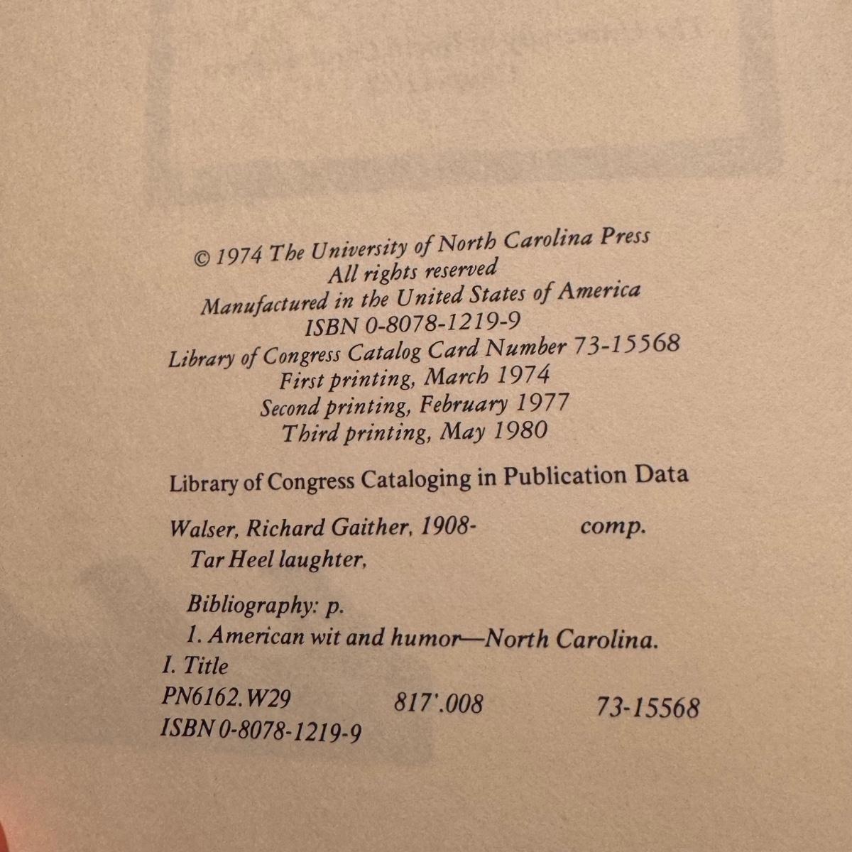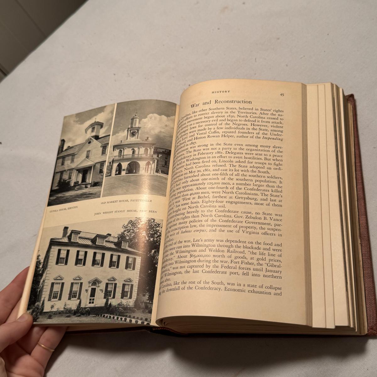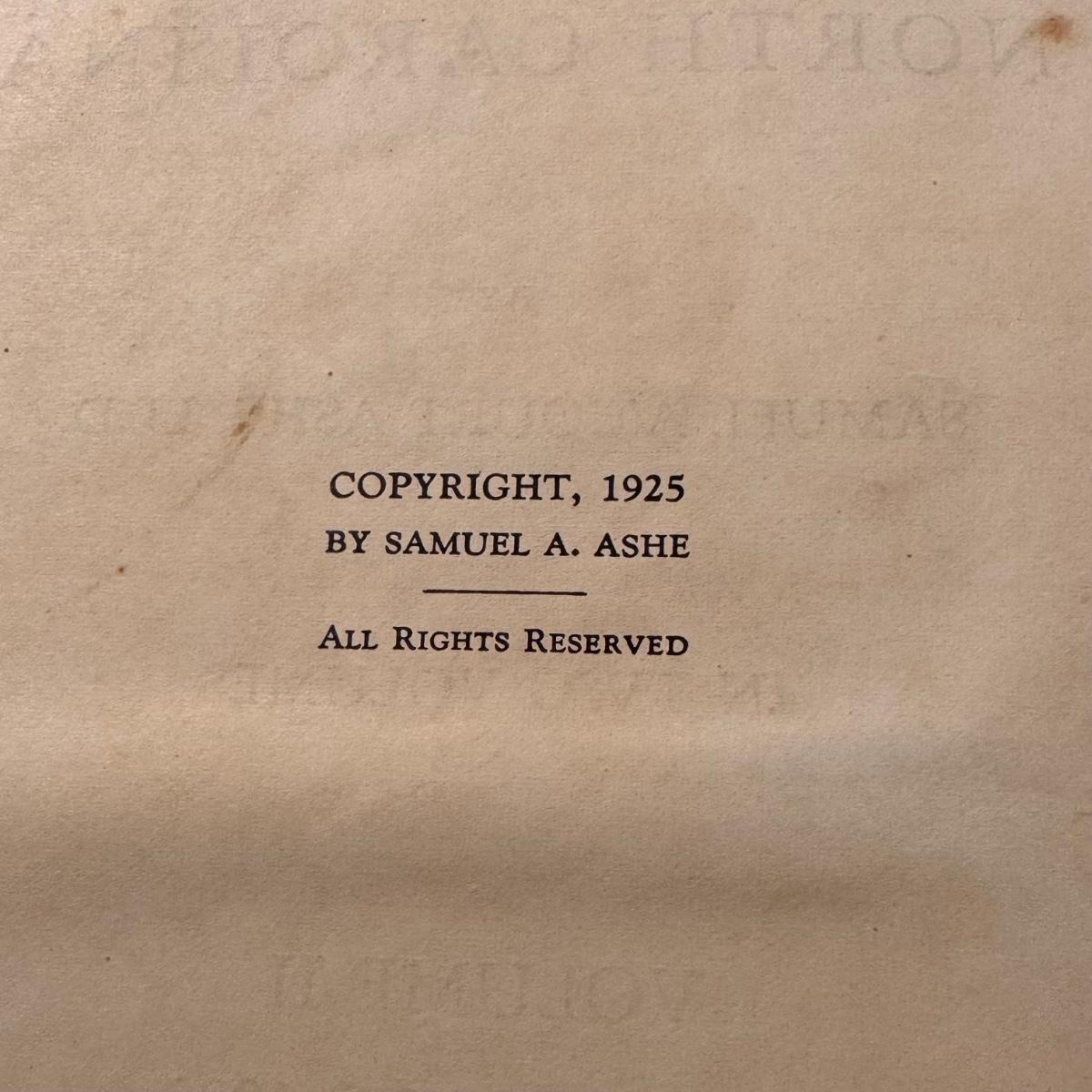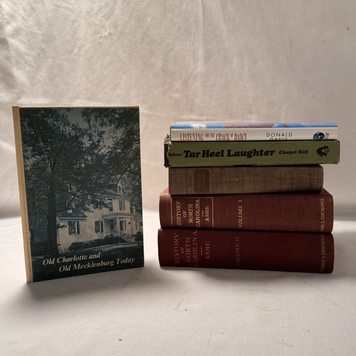 This book lot includes History of North Carolina Volume I and II, American Guide Series - North Carolina, Tar Heel Laughter, Listening for the Crack of Dawn by Donald Davis, and Old Charlotte and Old Mecklenburg Today. The Old Charlotte and Old Mecklenburg Today book is signed by the author and photographer. The Tar Heel Laughter book measures 6.25” x 9.25” x 1”H. Shipping available.