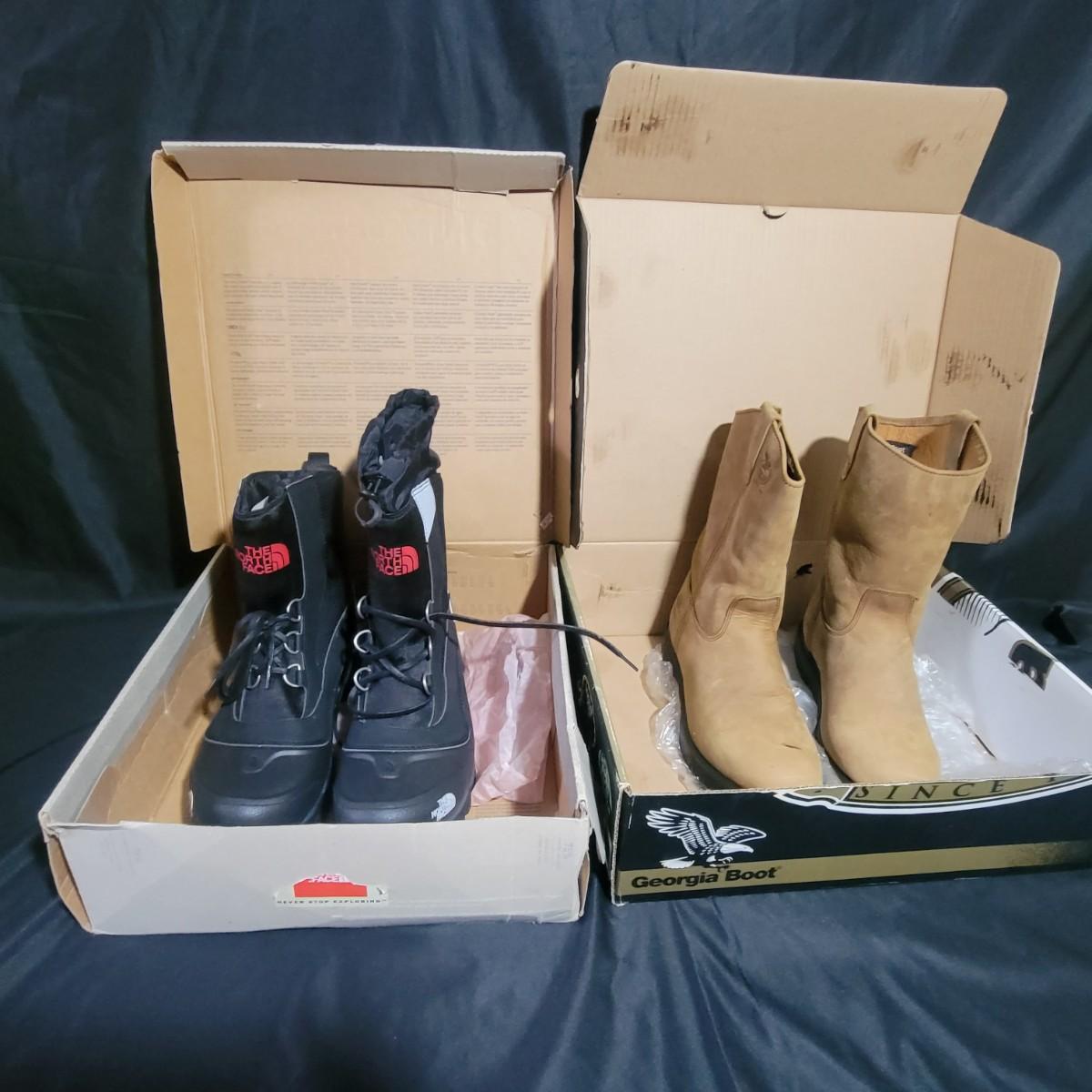 Sz 12 North Face Vodstock boots in new condition. Georgia Boot Wellington boots in tan Cheyenne color. There is a small smudge on these. Also new. Shipping Available