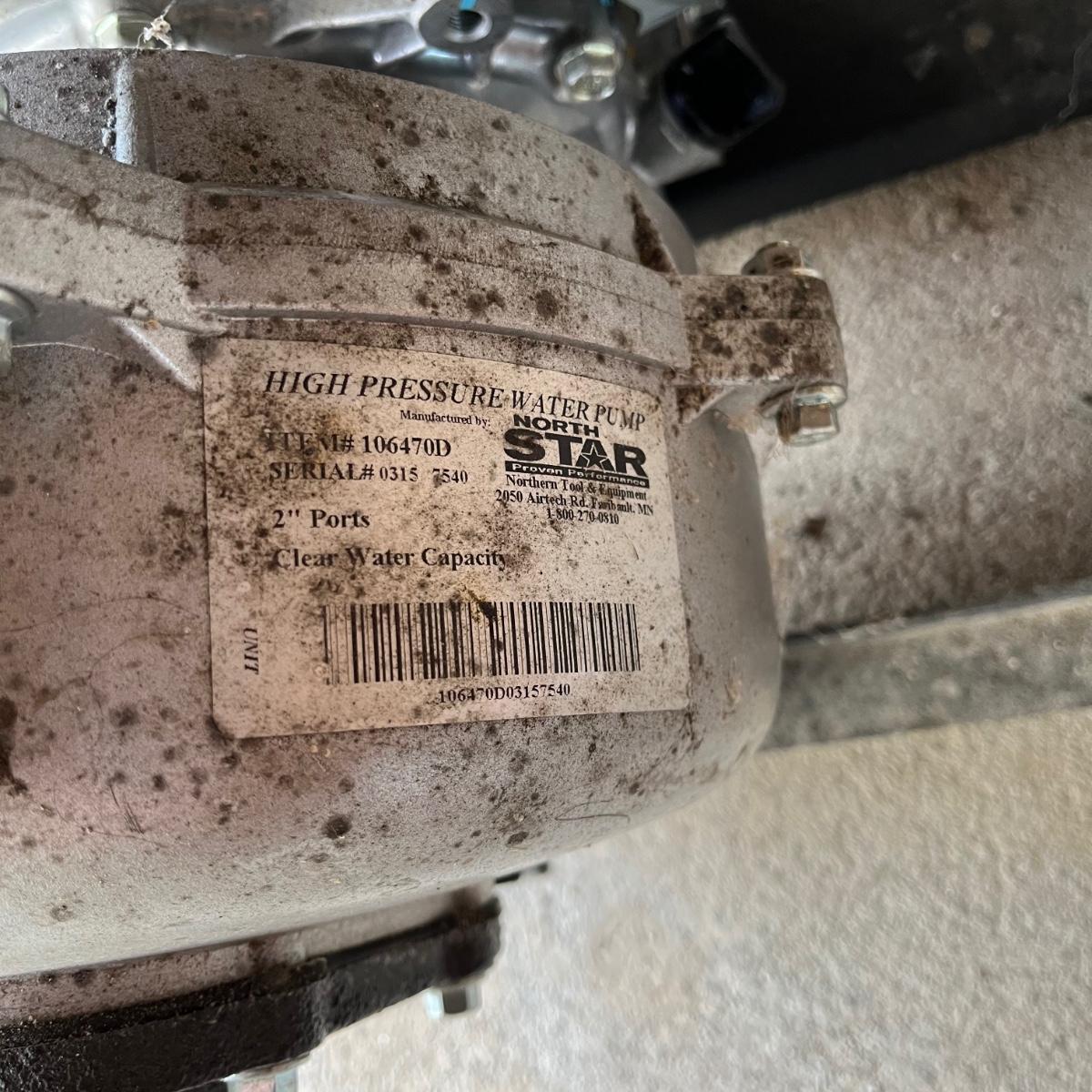 Lot includes a North Star High Pressure water pump model # 106470D with a Honda GX-160 motor. Engine worked when tested. Pump has 2” outlets.