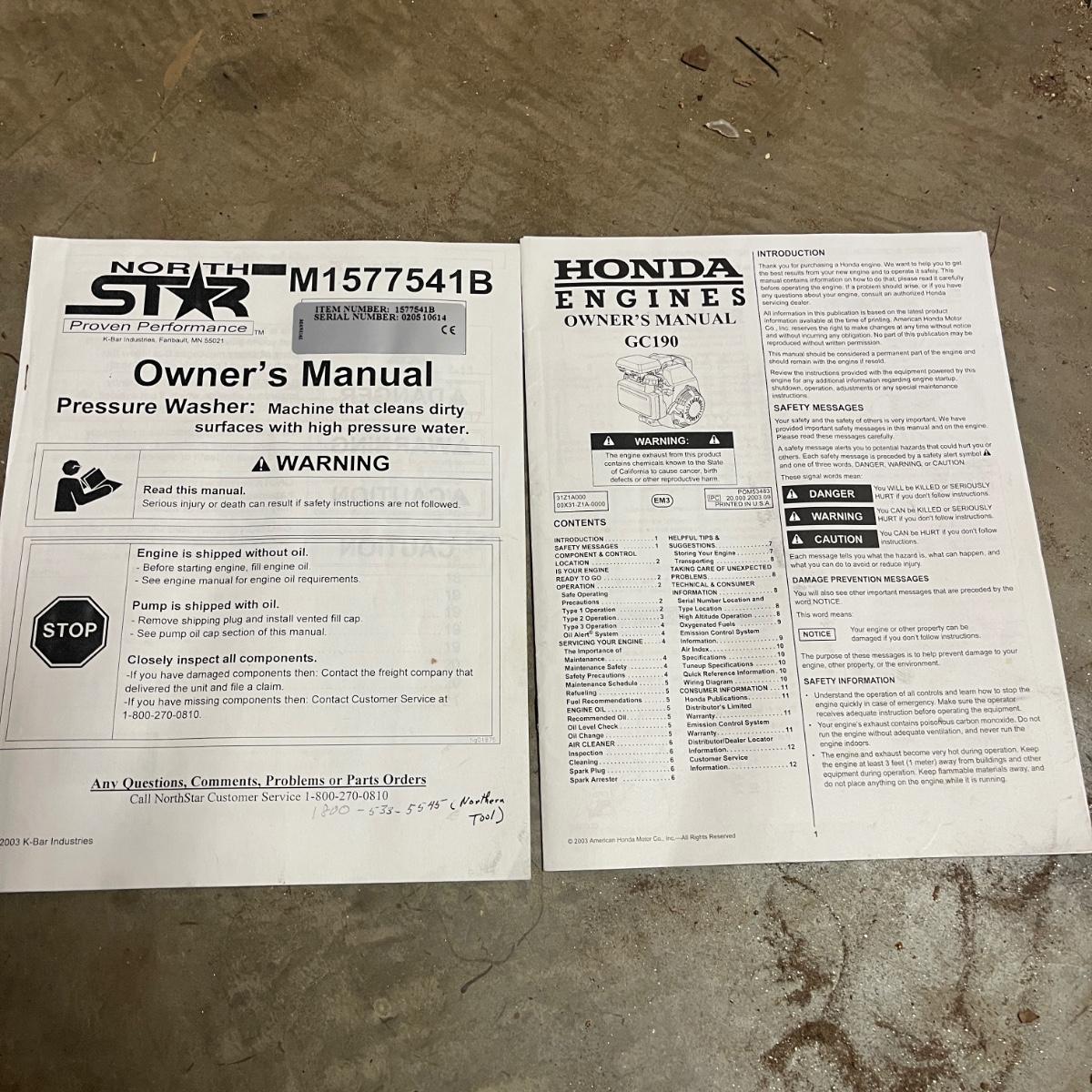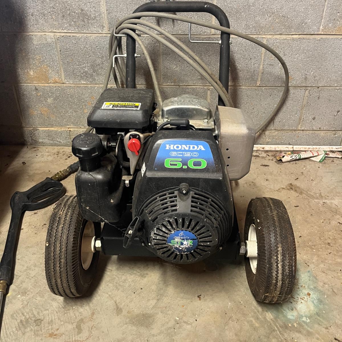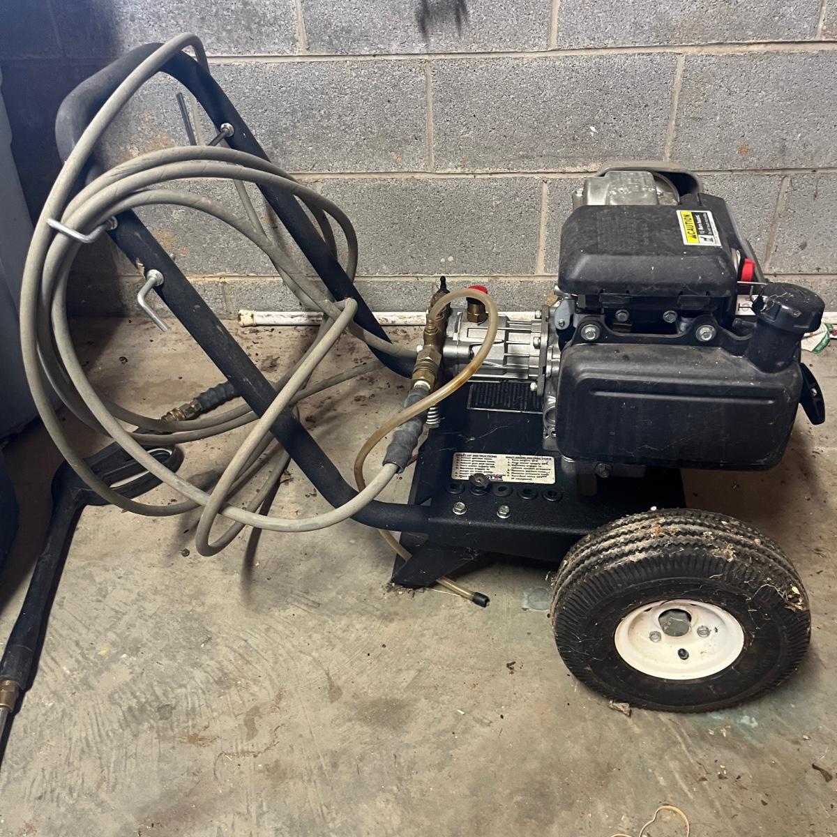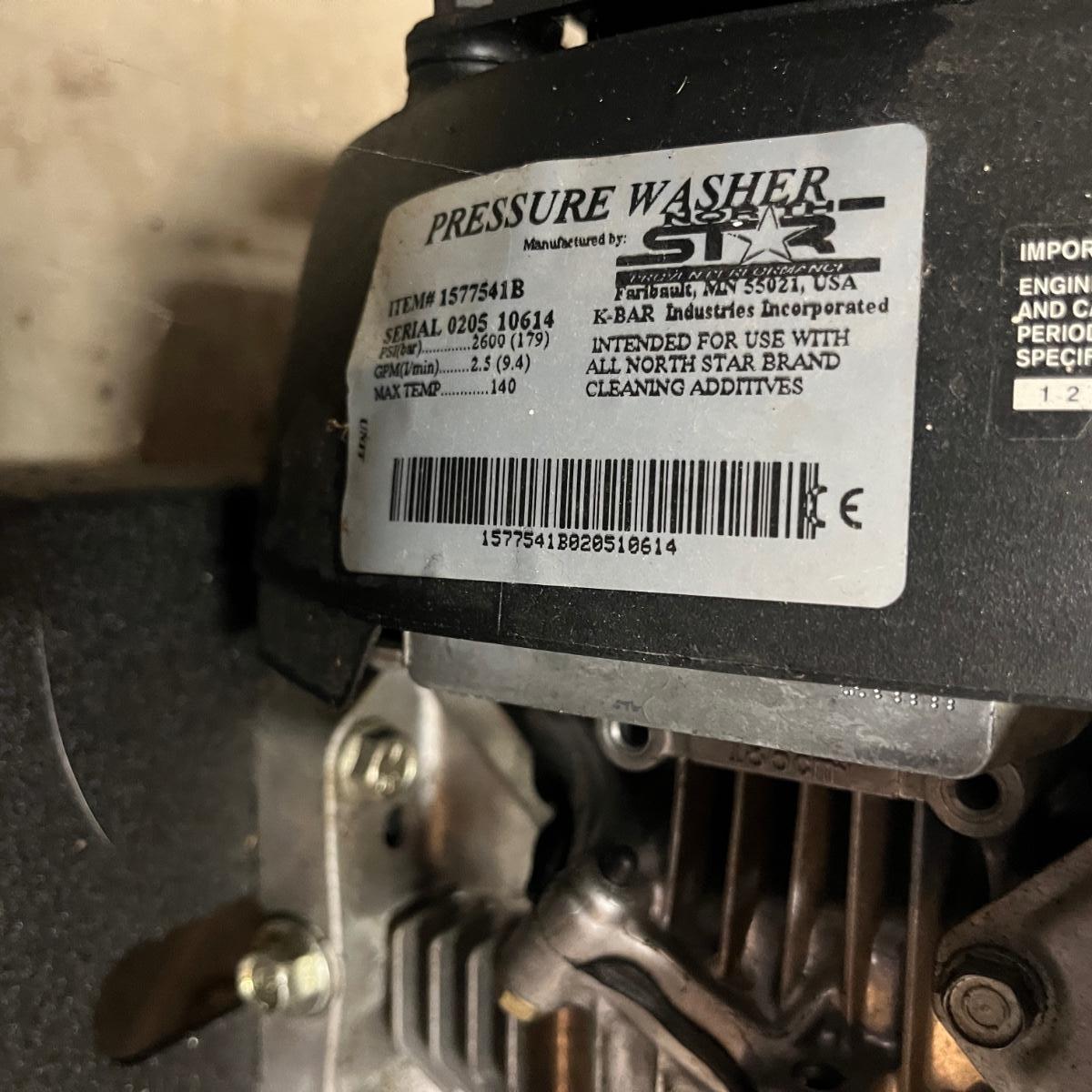 Lot includes a North Star Pressure washer with a 6 HP Honda motor. Engine turned over when starter cord pulled , but has no gas to test. Machine measures 22” x 27” x 24”H. Both pneumatic tires are flat.