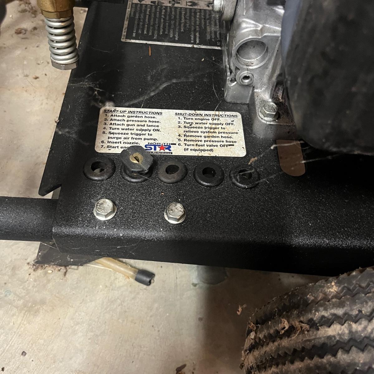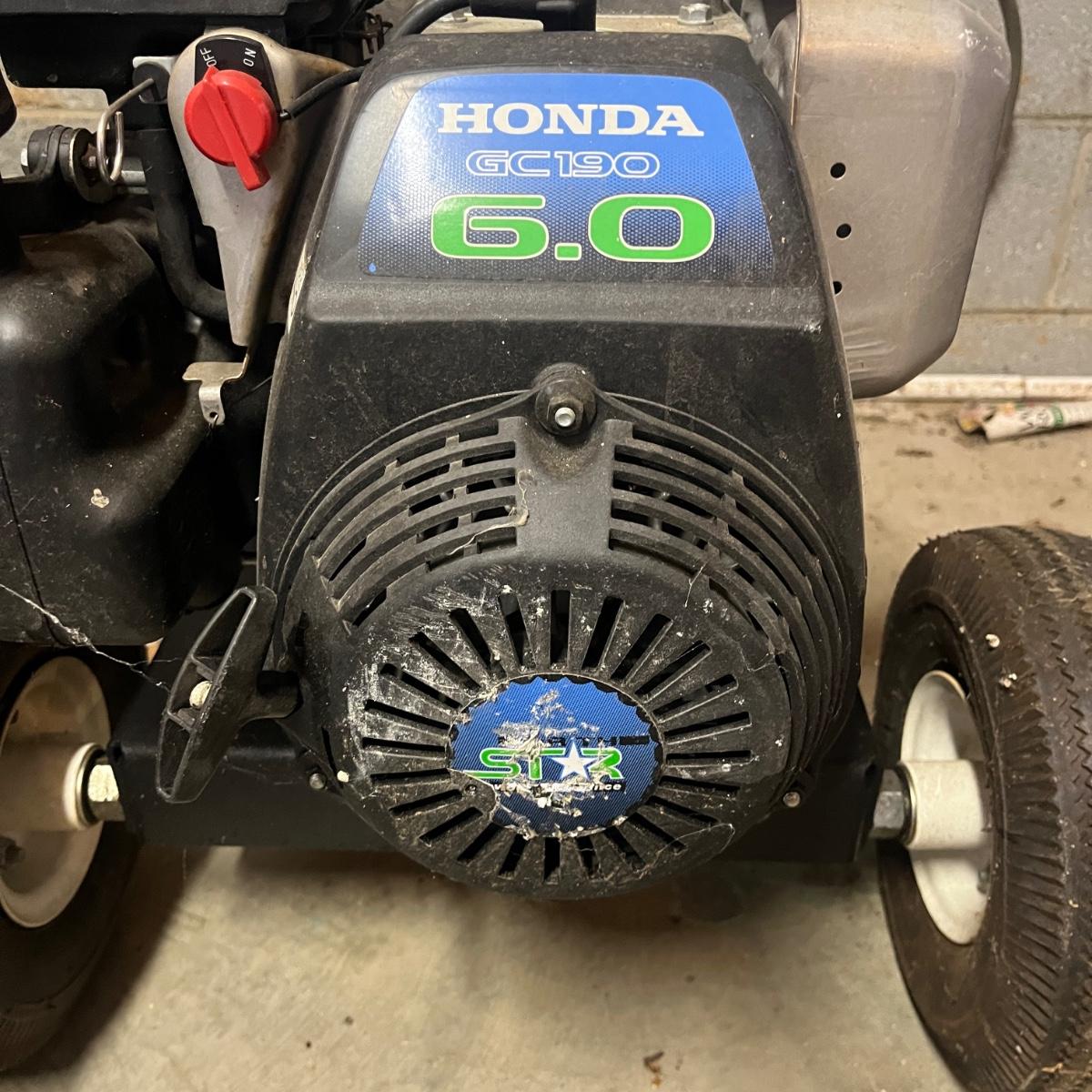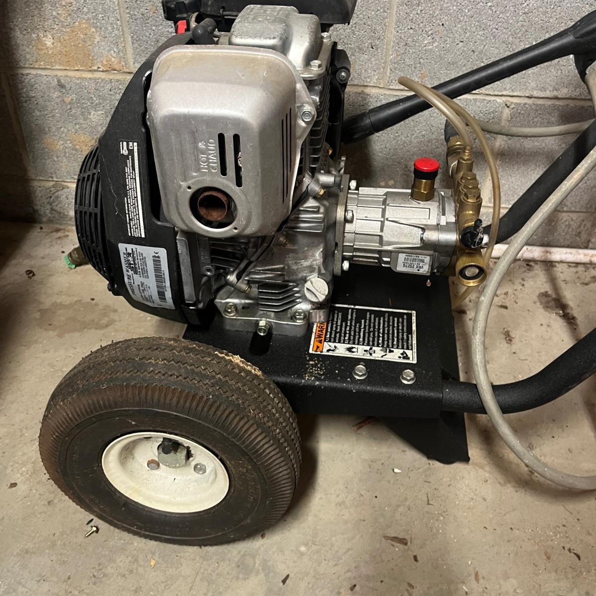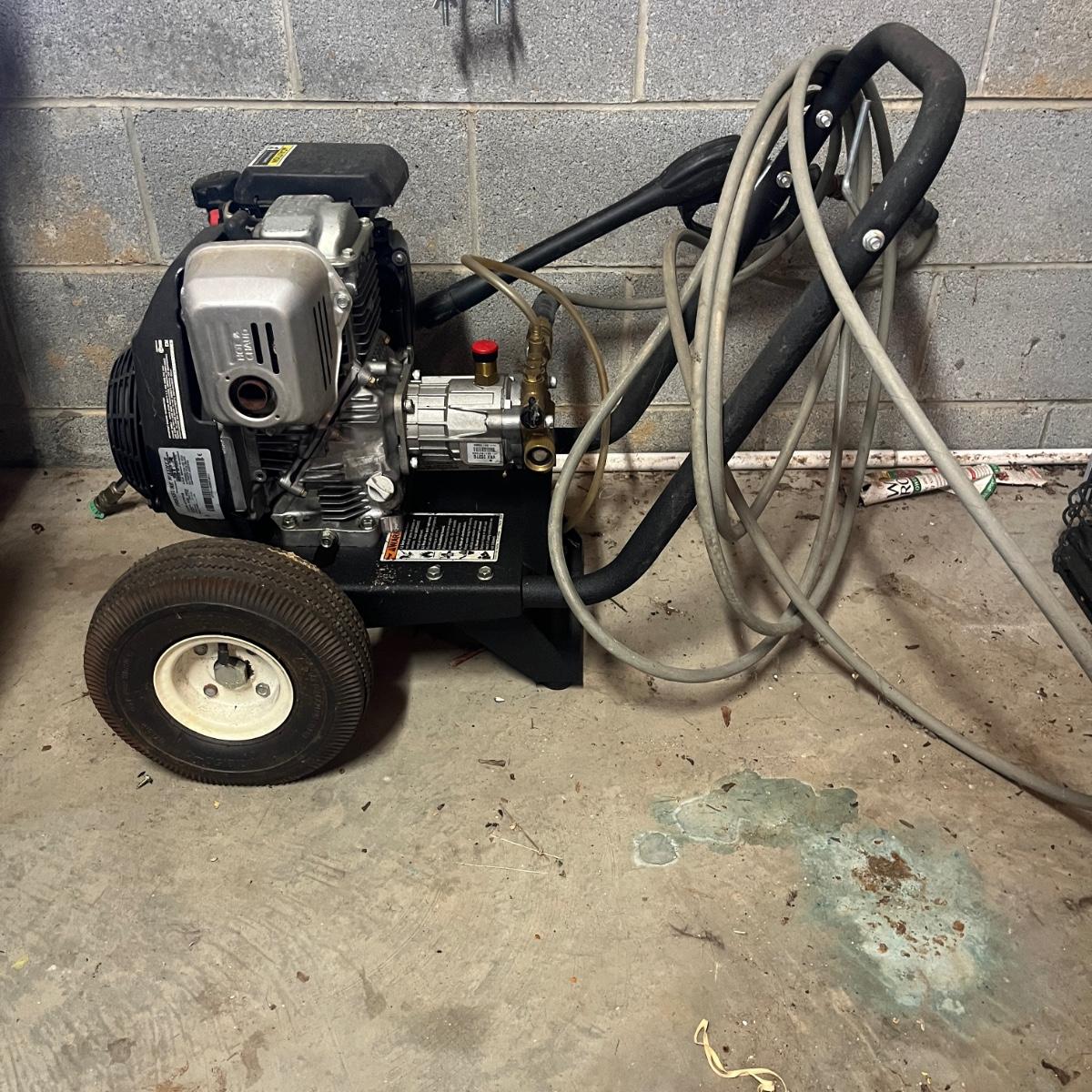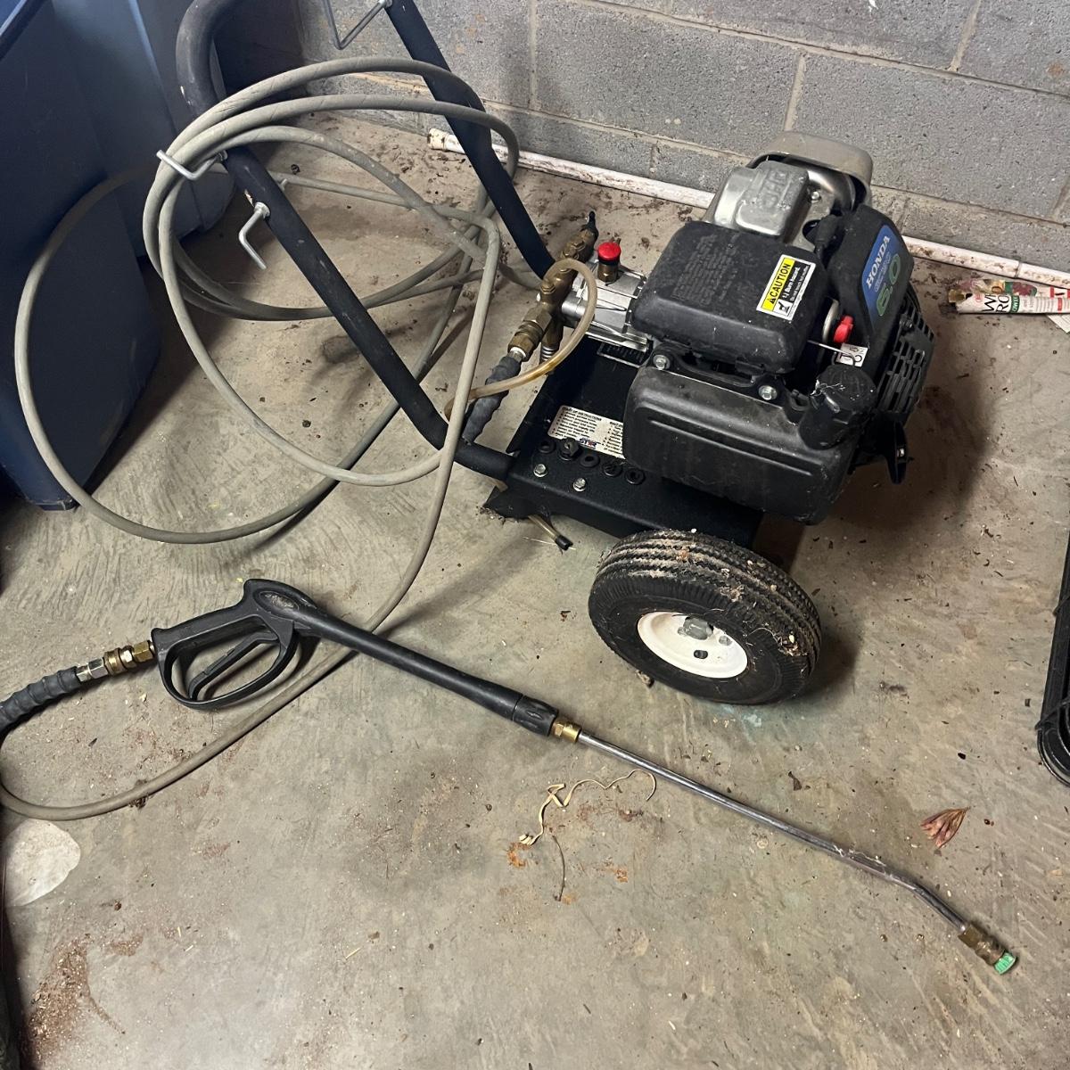Lot includes a North Star Pressure washer with a 6 HP Honda motor. Engine turned over when starter cord pulled , but has no gas to test. Machine measures 22” x 27” x 24”H. Both pneumatic tires are flat.