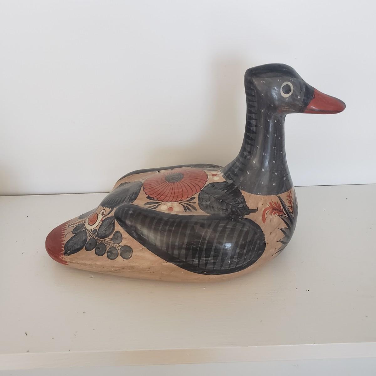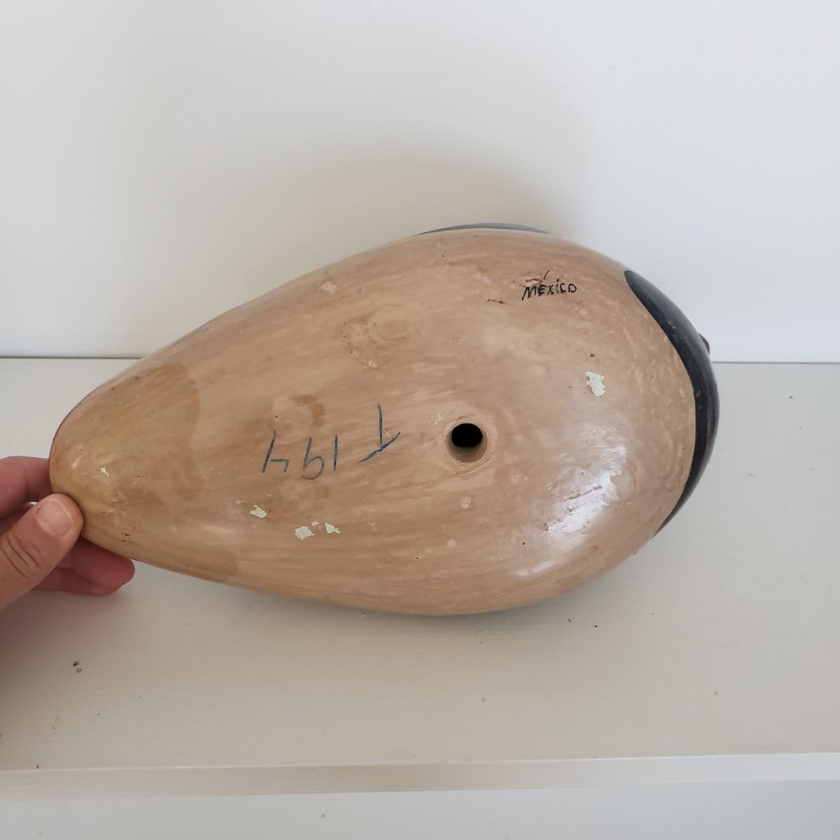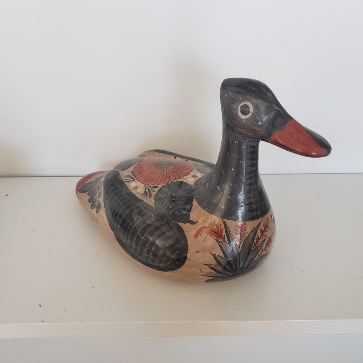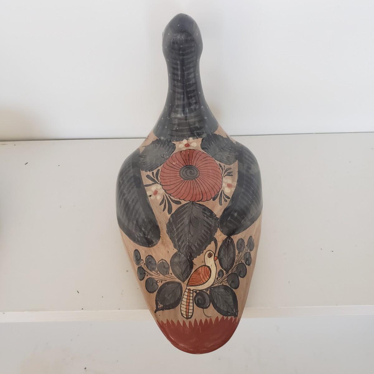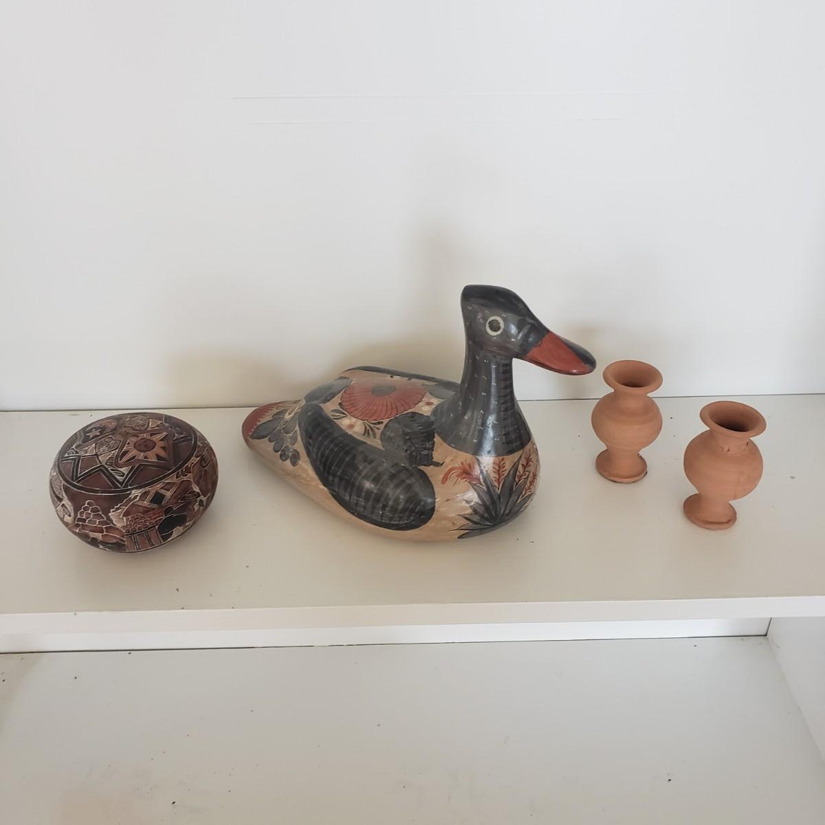 The hand painted duck measures 10" x 8"H and is marked with Mexico on the bottom. The two terra cotta vases measure 4" x 2"H. One of the vases has a chip under the rim, see picture. The bottoms of the vases are covered in green felt. The painted gourd does rattle when shaken and measures 5" x 3"H.