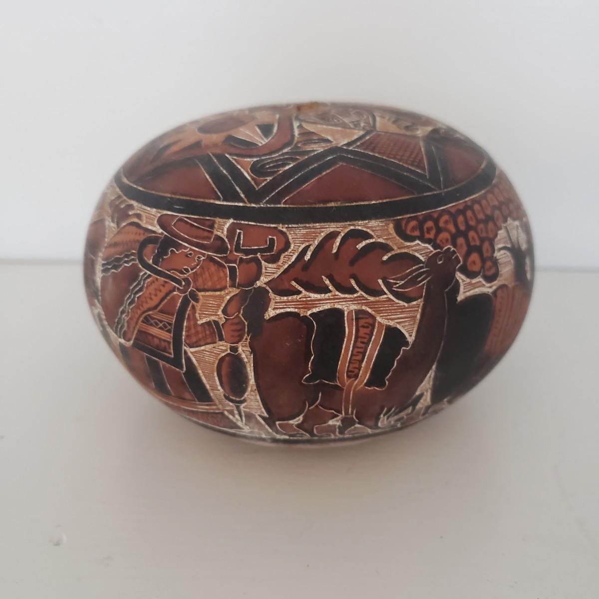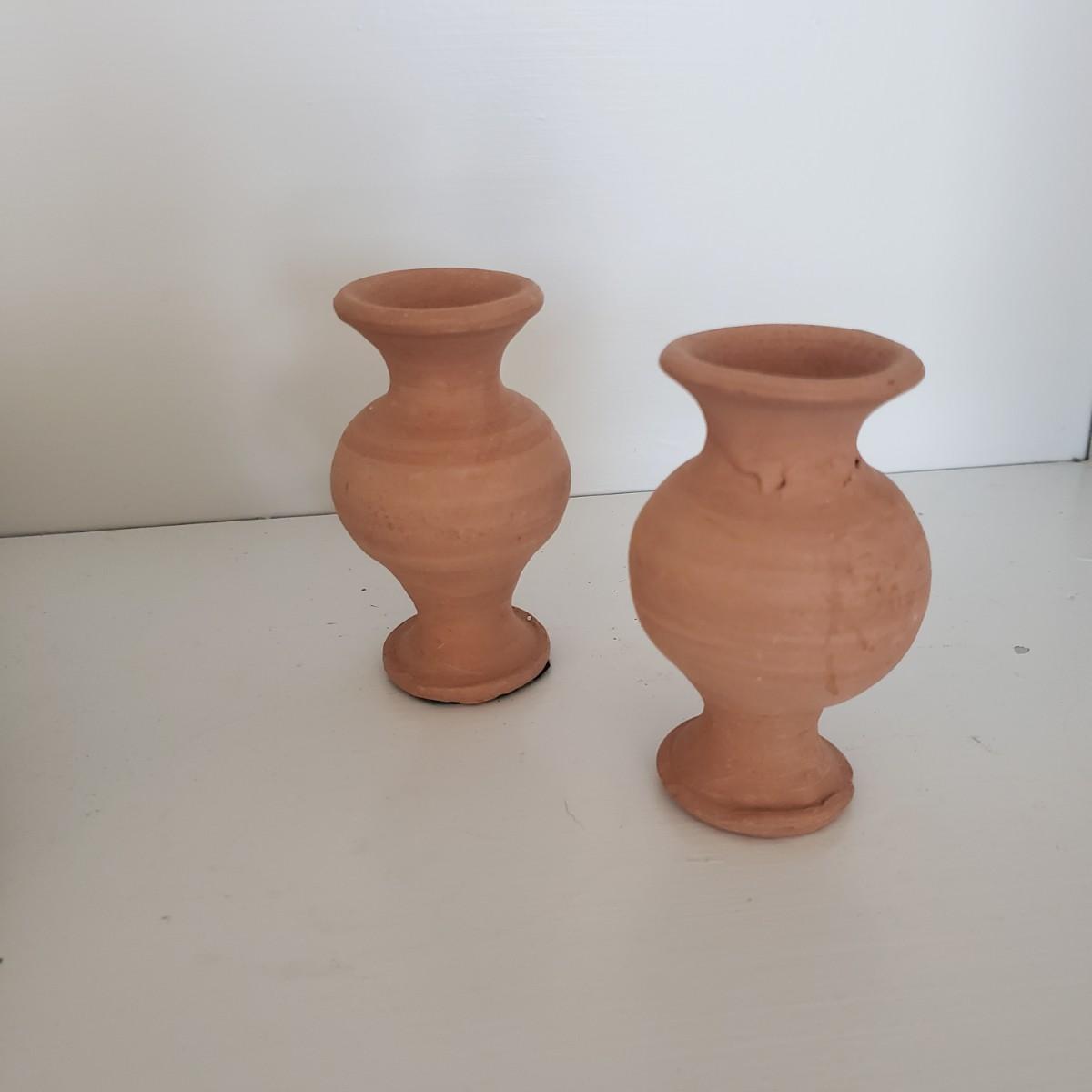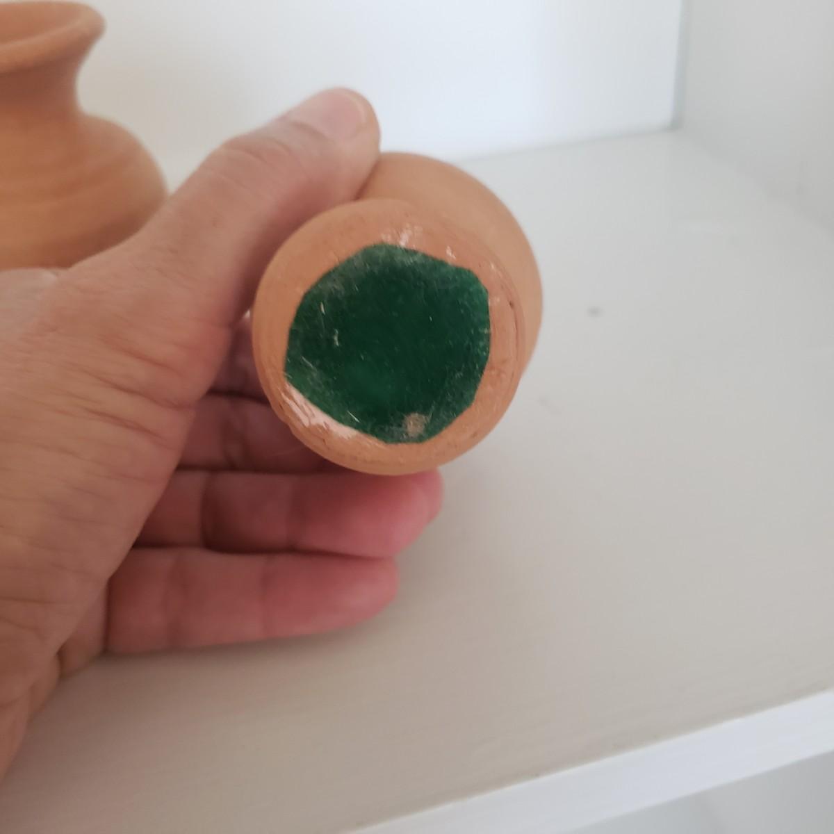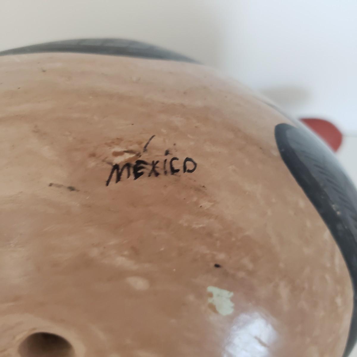 The hand painted duck measures 10" x 8"H and is marked with Mexico on the bottom. The two terra cotta vases measure 4" x 2"H. One of the vases has a chip under the rim, see picture. The bottoms of the vases are covered in green felt. The painted gourd does rattle when shaken and measures 5" x 3"H.