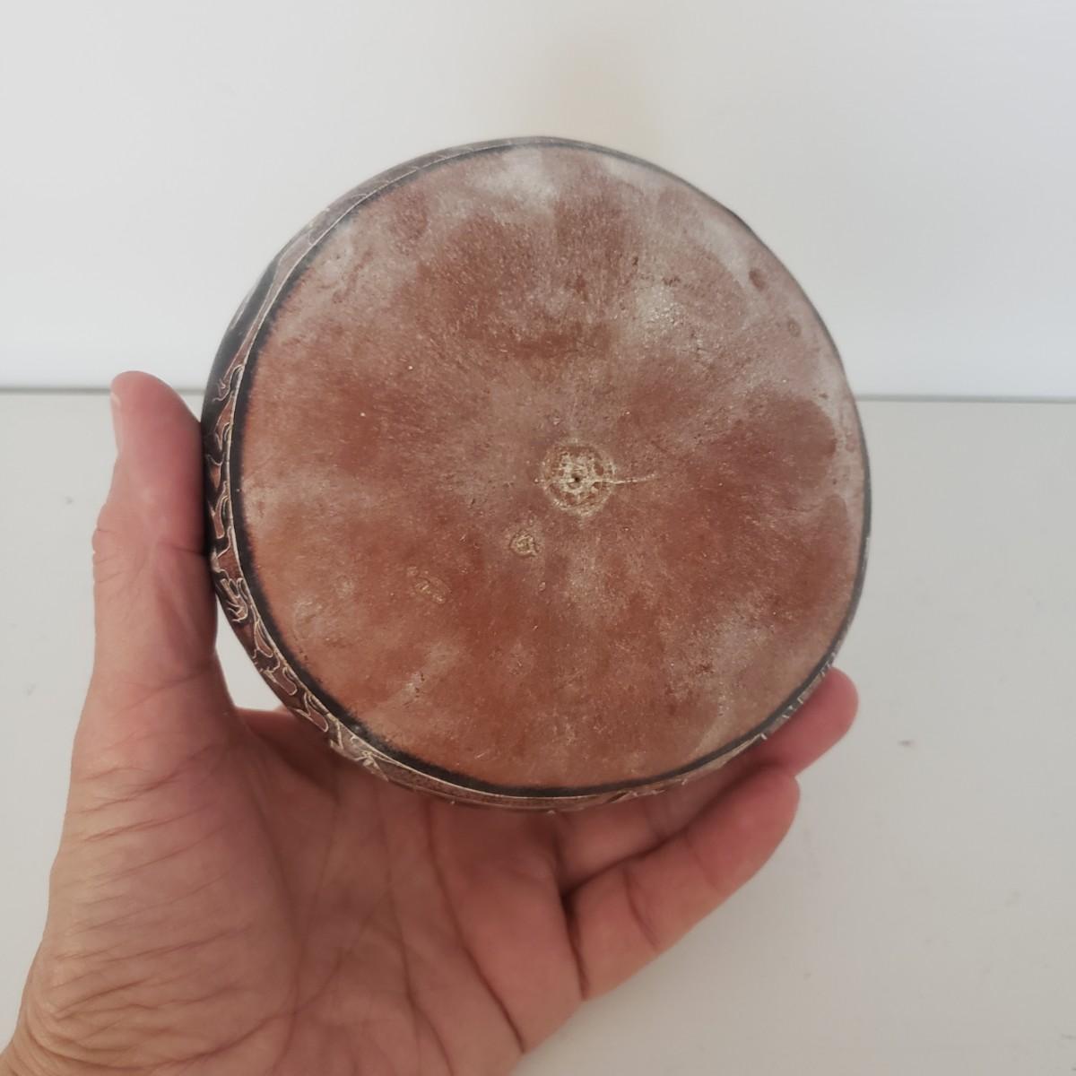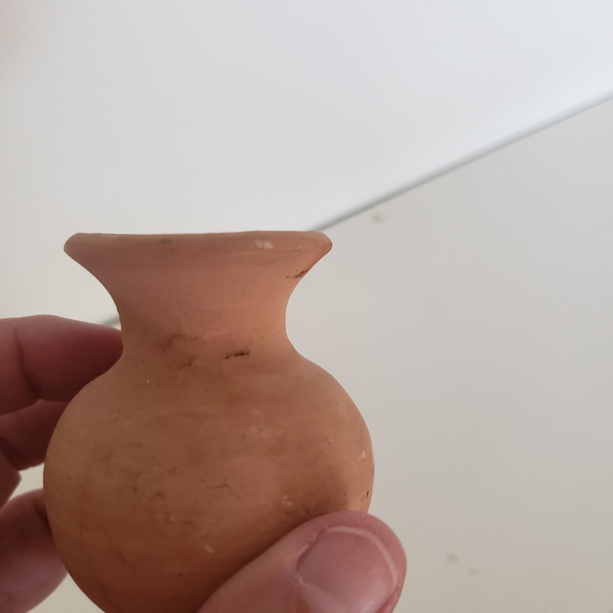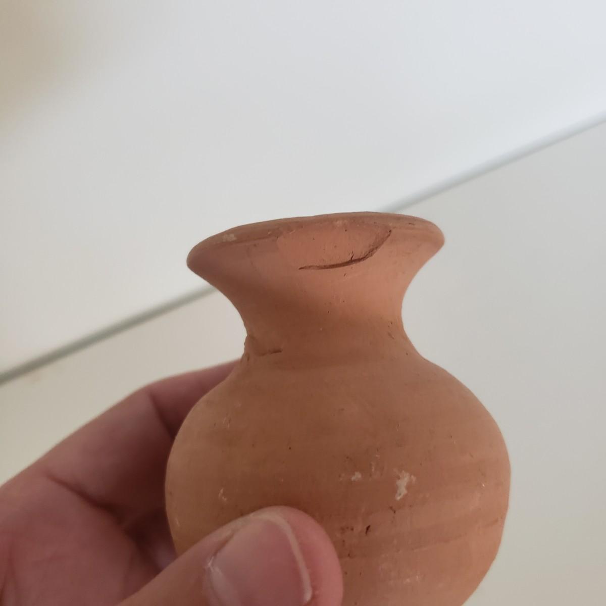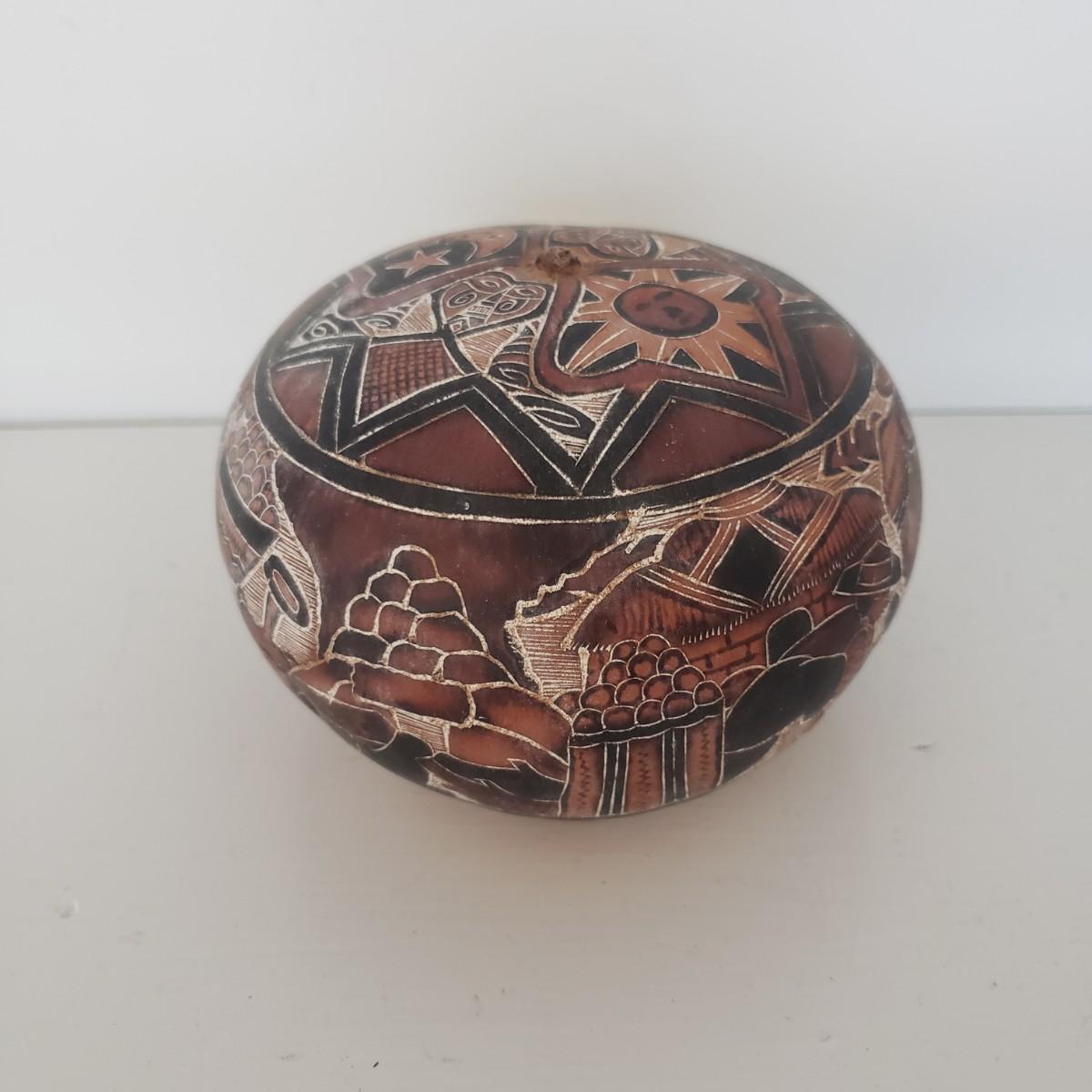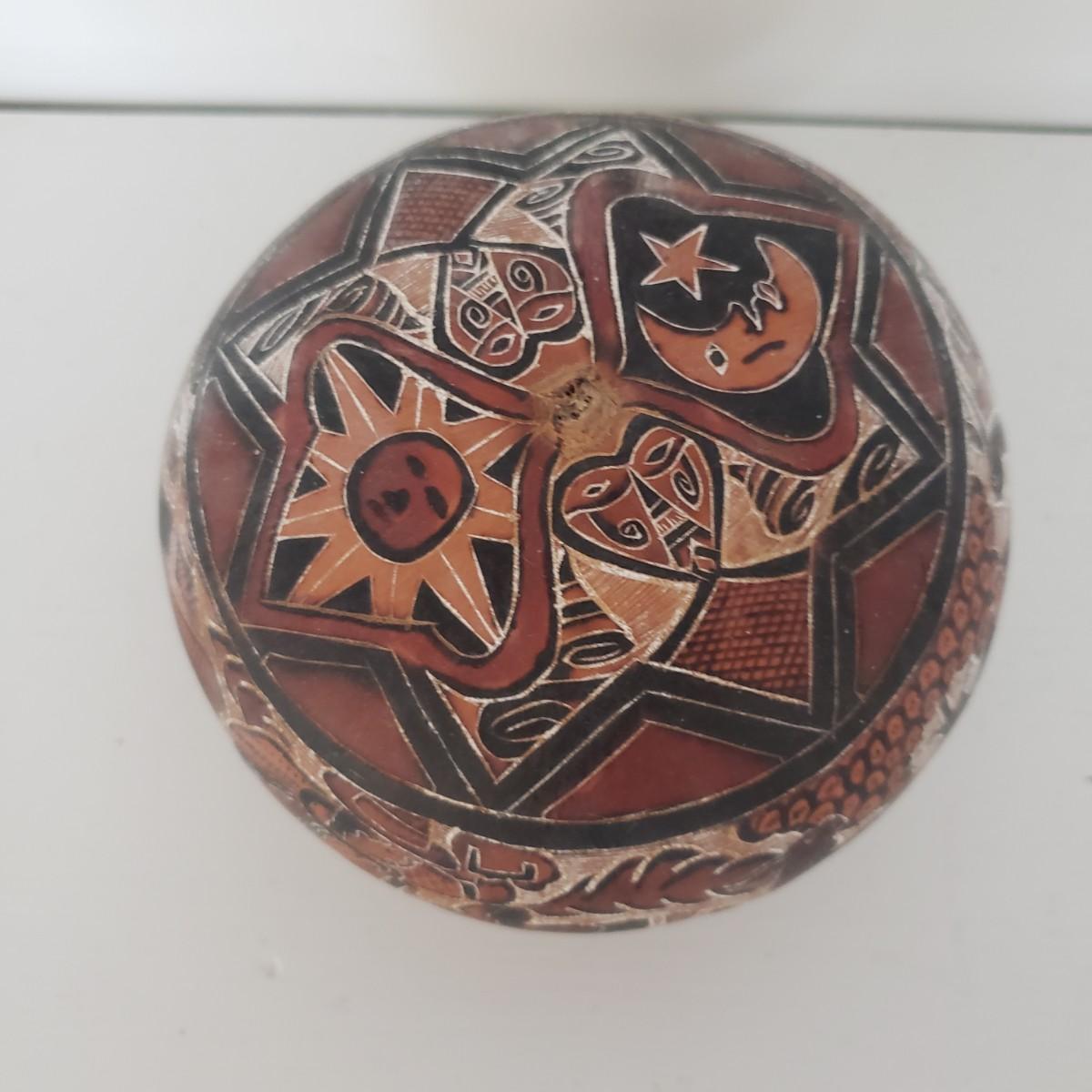 The hand painted duck measures 10" x 8"H and is marked with Mexico on the bottom. The two terra cotta vases measure 4" x 2"H. One of the vases has a chip under the rim, see picture. The bottoms of the vases are covered in green felt. The painted gourd does rattle when shaken and measures 5" x 3"H.