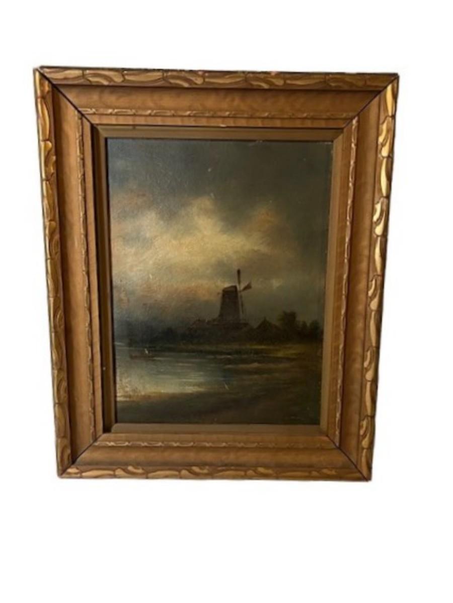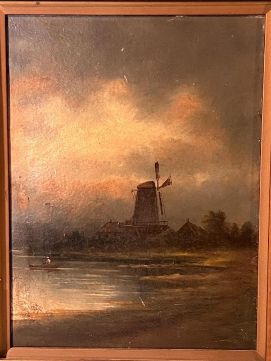 Depicts a windmill and possibly a fisherman. Unsigned. Measurement: 16" x 14".