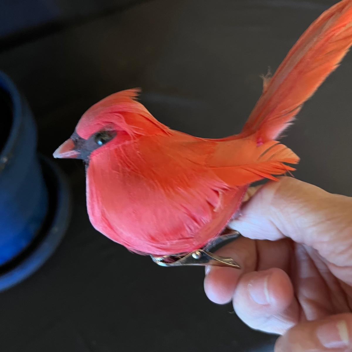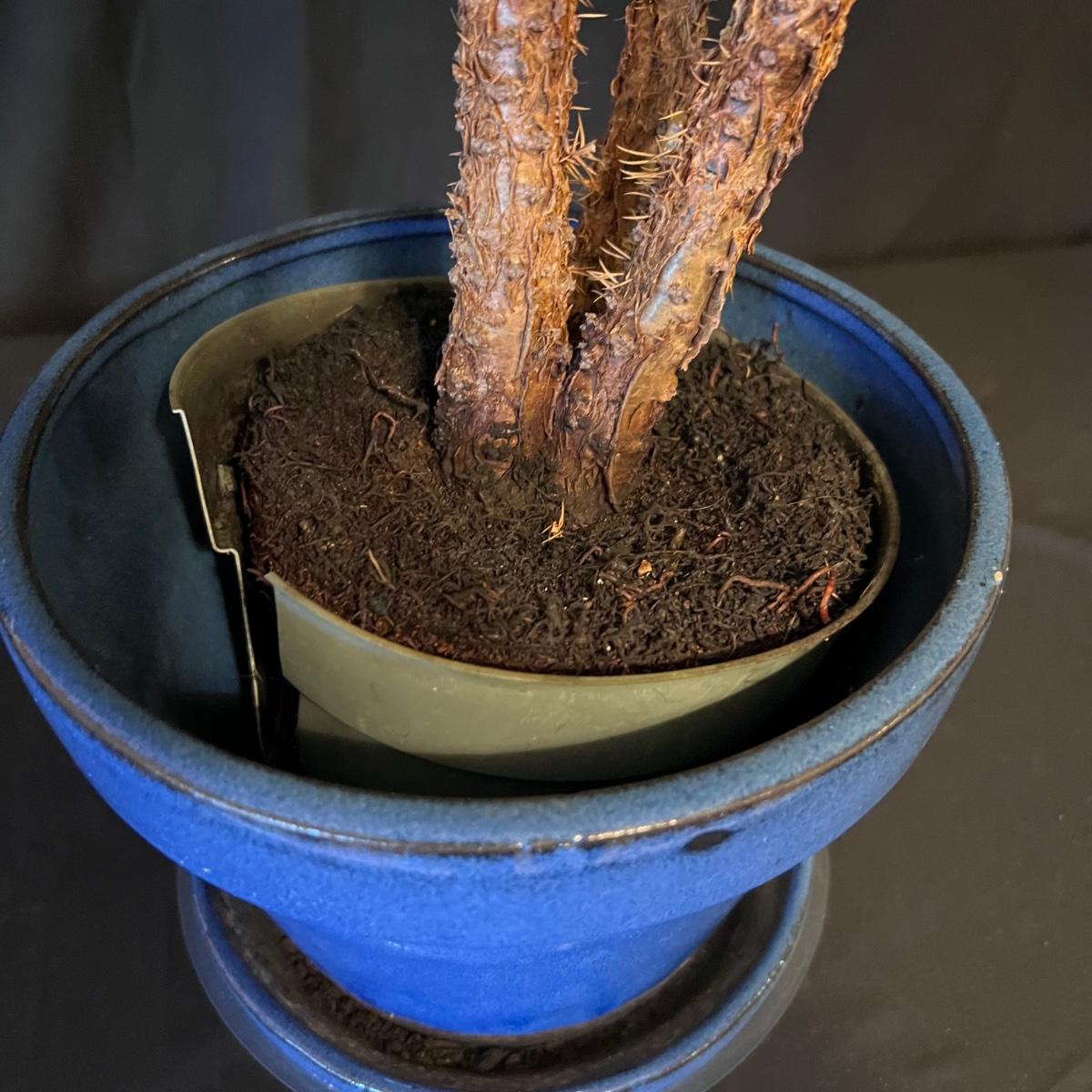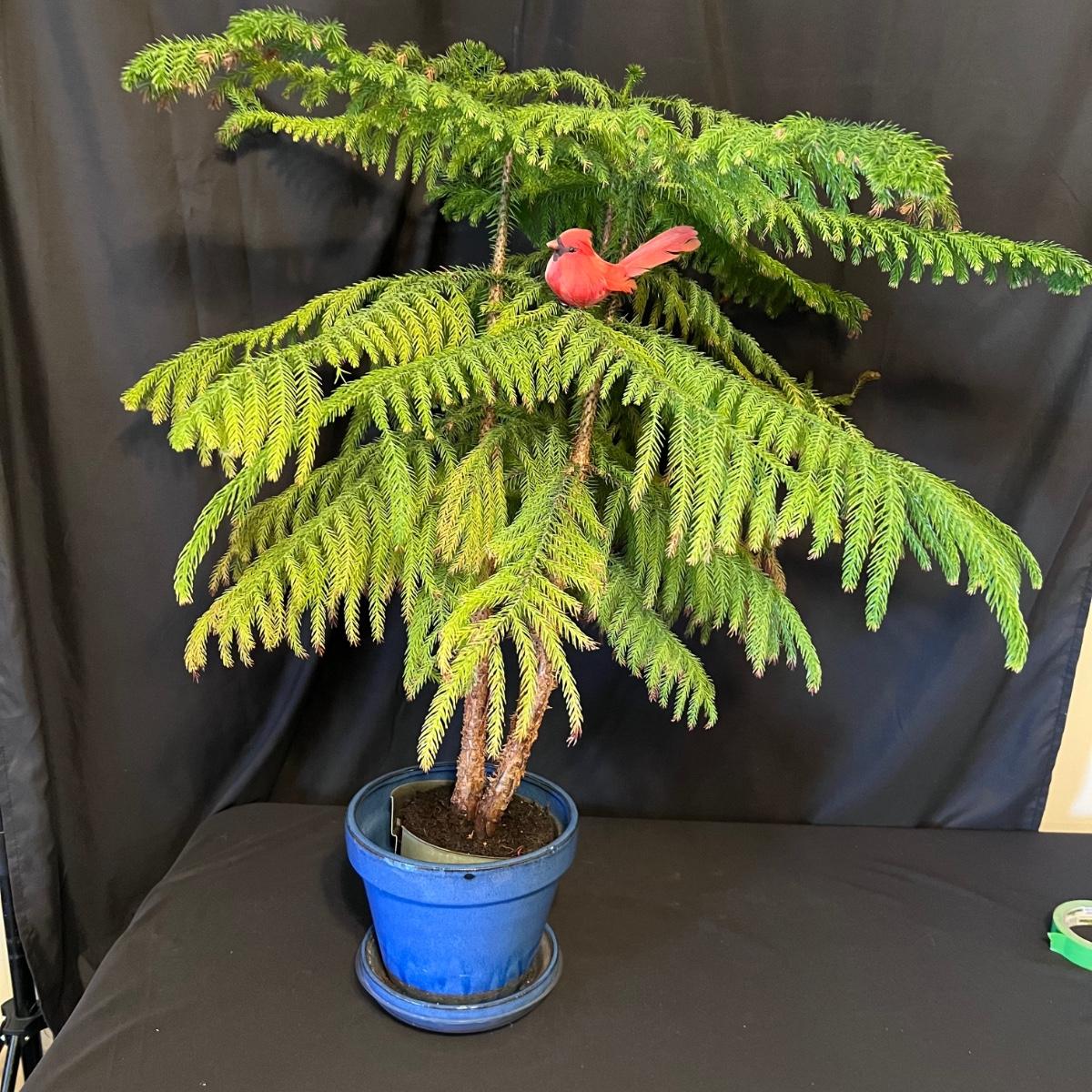 This Northfolk Island Pine plant comes with a blue ceramic pot with built-in drip tray. Plant is currently in nursery pot and is ready to be repotted and have a good shot of fertilizer. Some browning on its needles. Small clip on bird ornament is included.