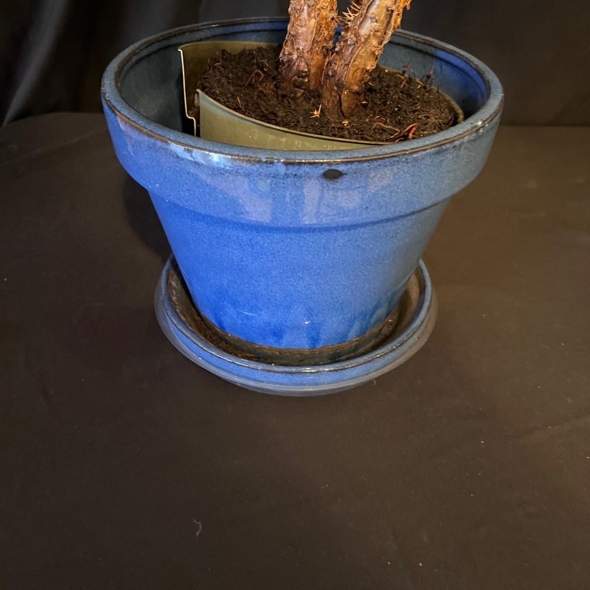 Blue pot measures 8.5”D x 8”H. Plant is 36” tall.