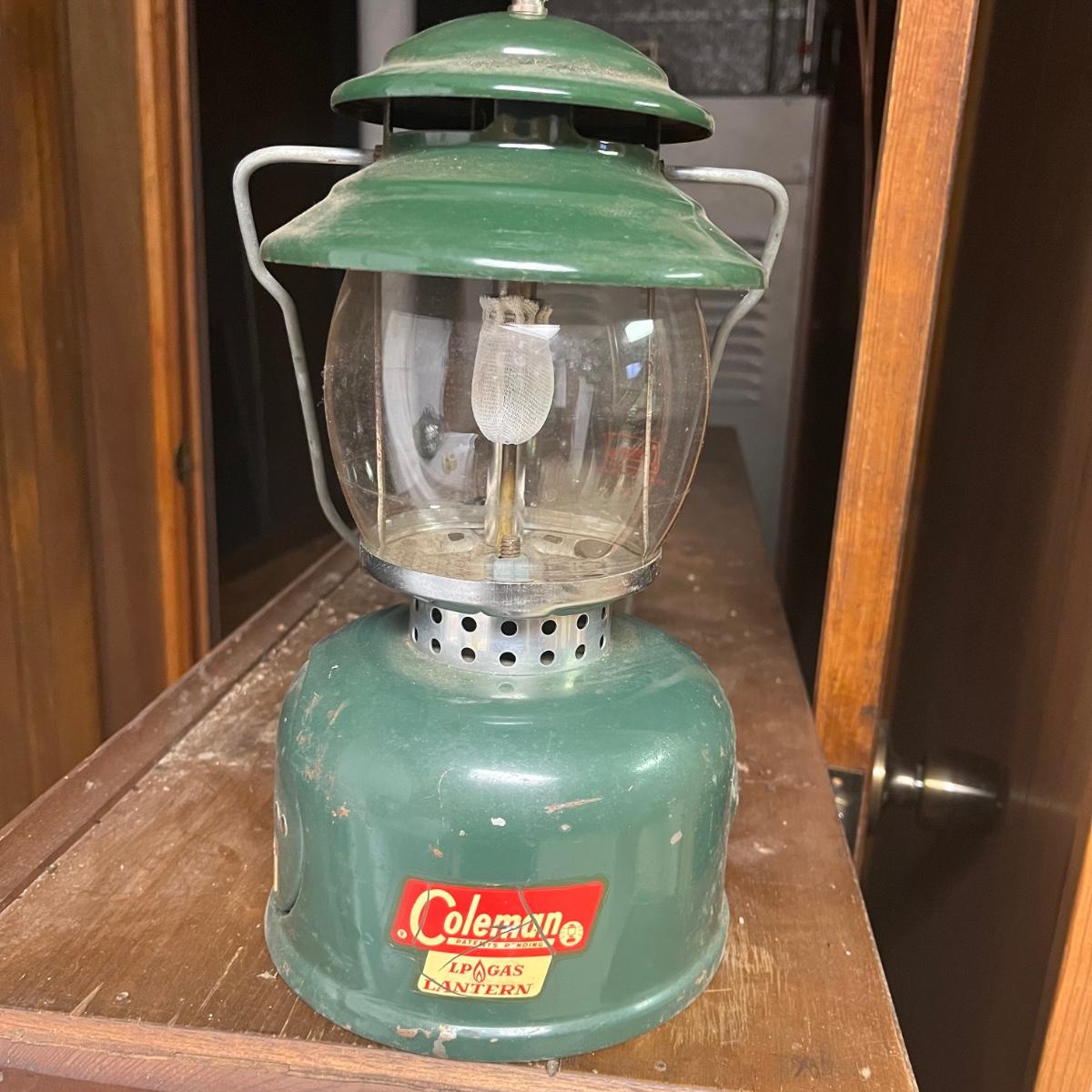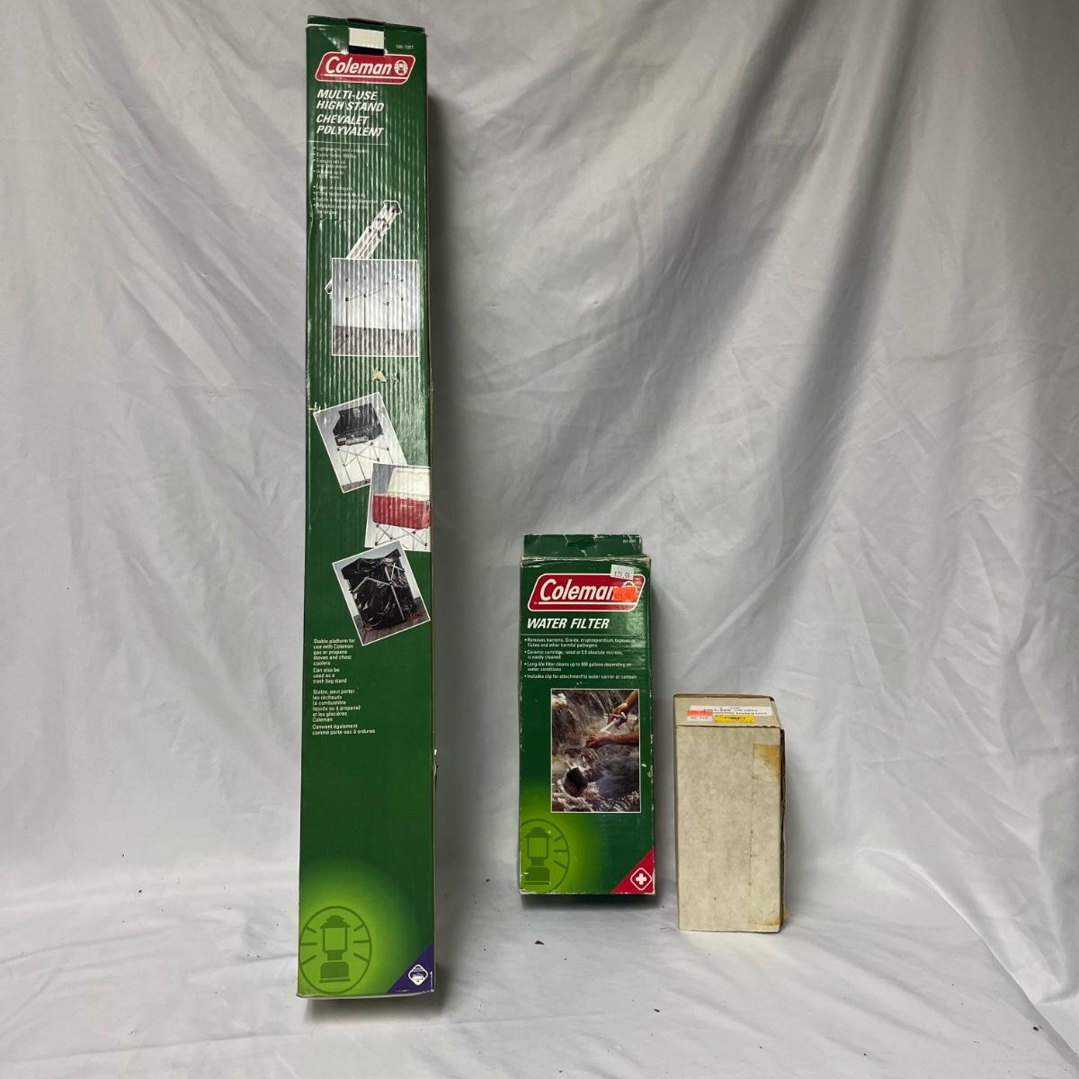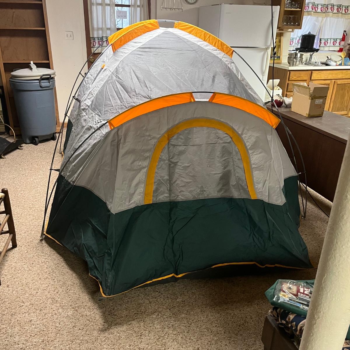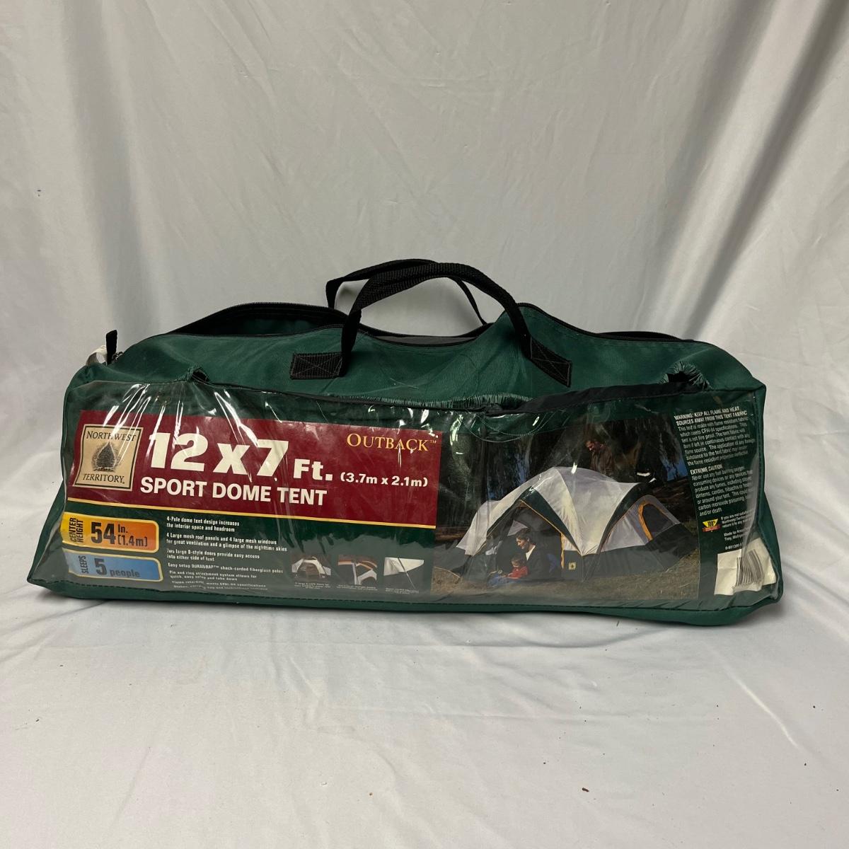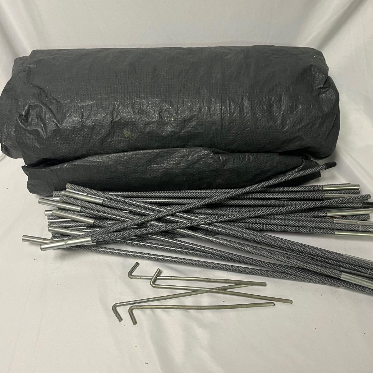 Lot includes a Northwest Territory 12’x 7’ tent, vintage Coleman LP gas lantern, Coleman water filter, multi use stand, adjustable walking stick, bug jackets and more. Also includes a set of horseshoes with stakes and two five gallon plastic jugs.
