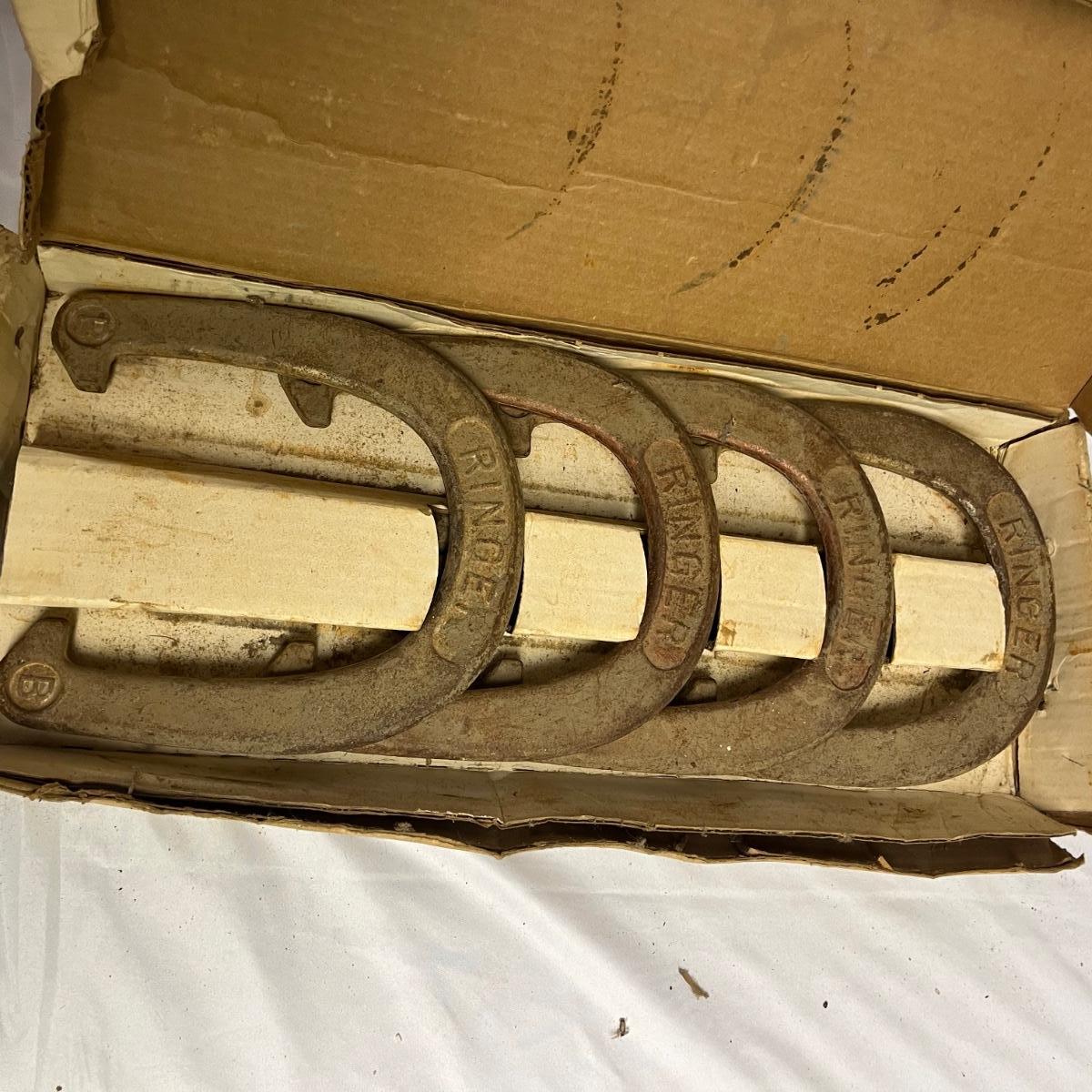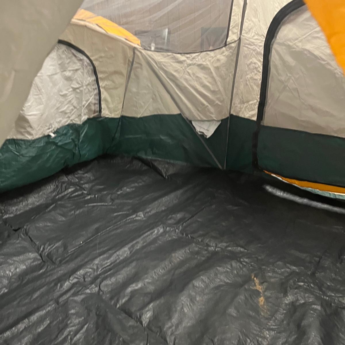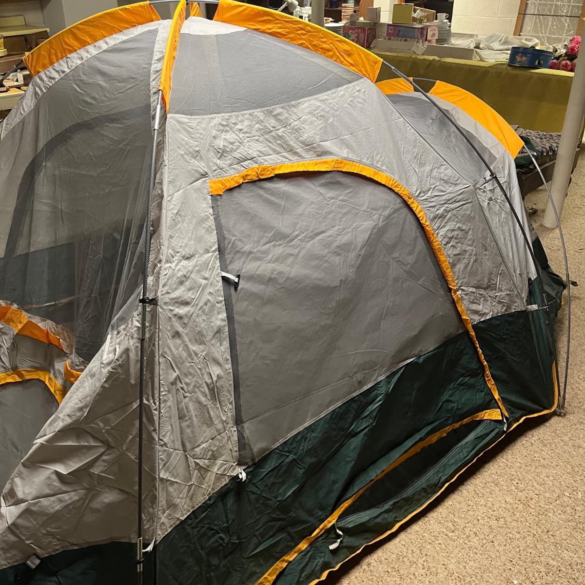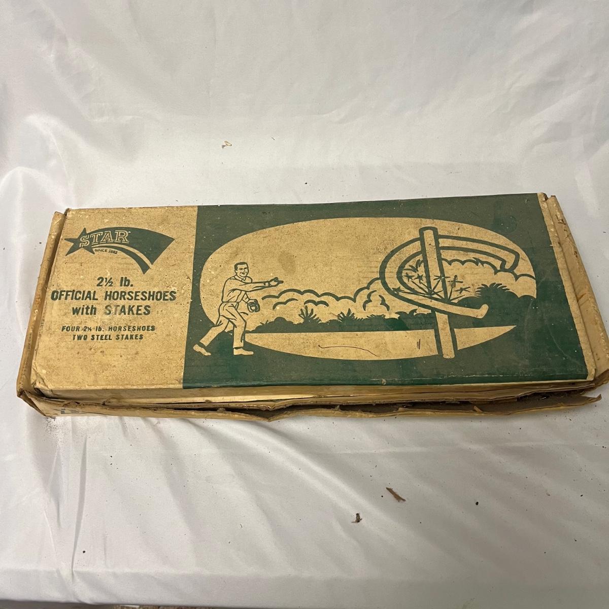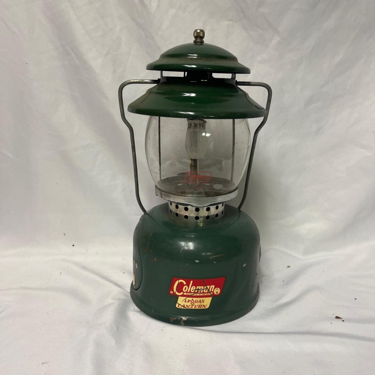 Lot includes a Northwest Territory 12’x 7’ tent, vintage Coleman LP gas lantern, Coleman water filter, multi use stand, adjustable walking stick, bug jackets and more. Also includes a set of horseshoes with stakes and two five gallon plastic jugs.