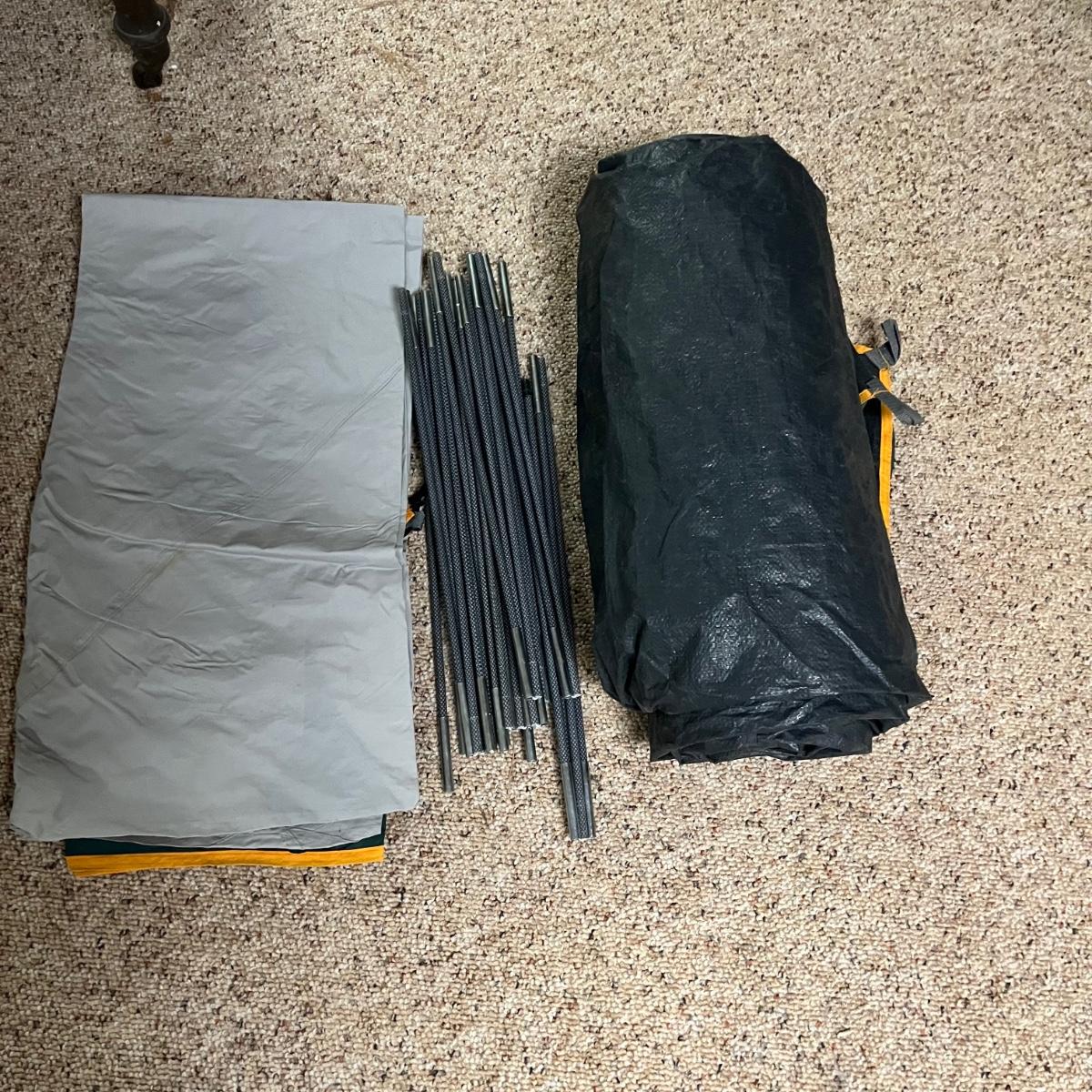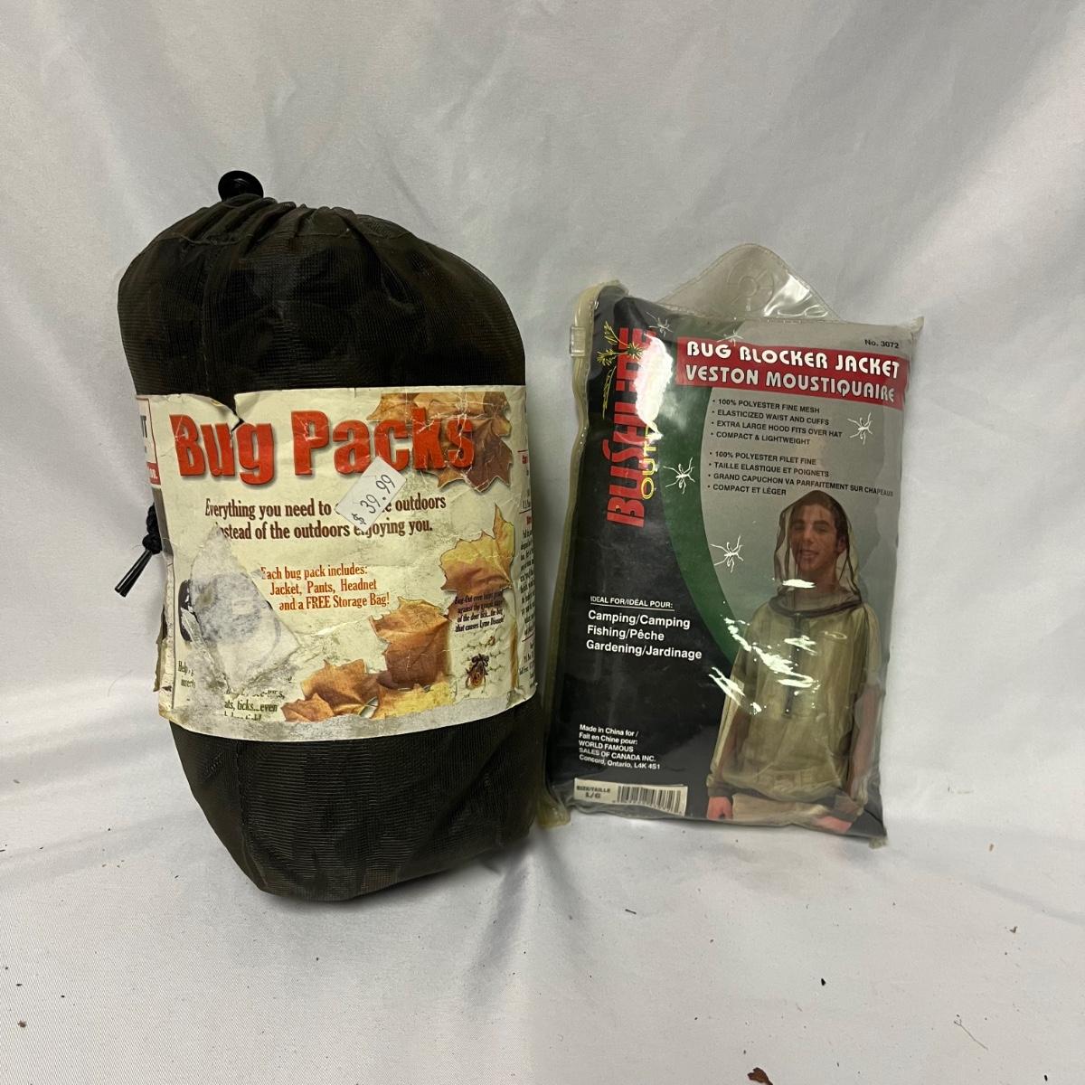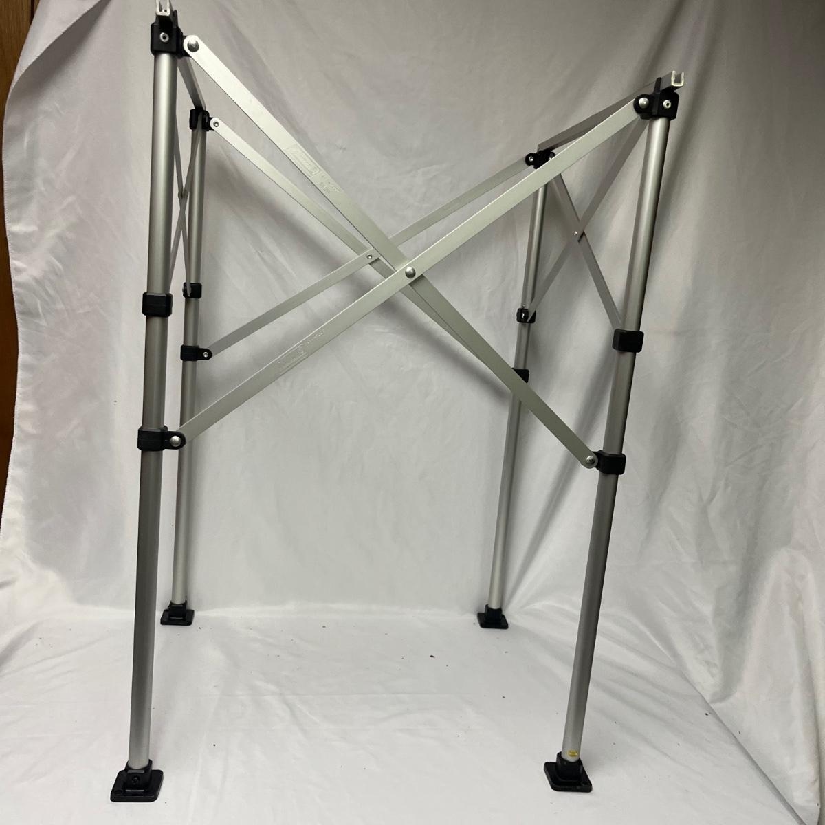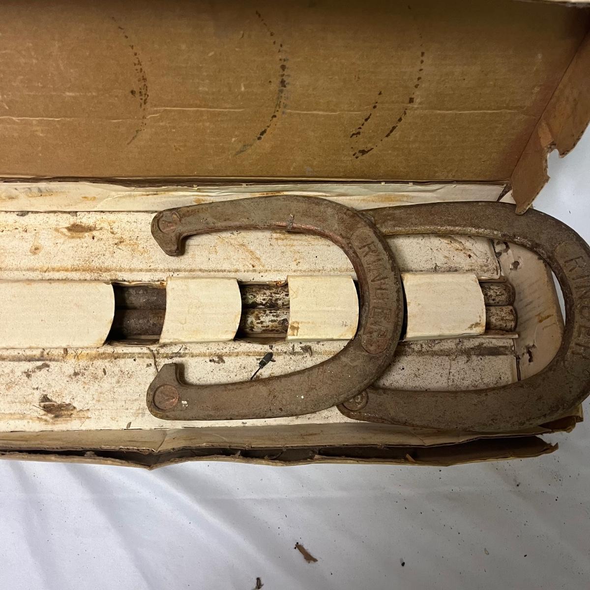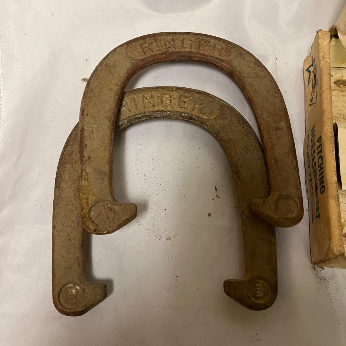 Lot includes a Northwest Territory 12’x 7’ tent, vintage Coleman LP gas lantern, Coleman water filter, multi use stand, adjustable walking stick, bug jackets and more. Also includes a set of horseshoes with stakes and two five gallon plastic jugs.