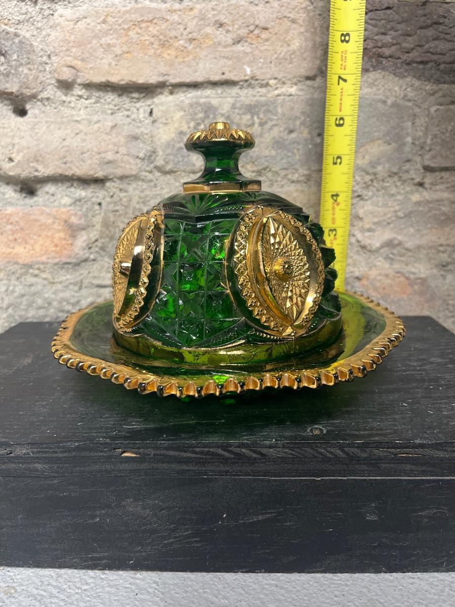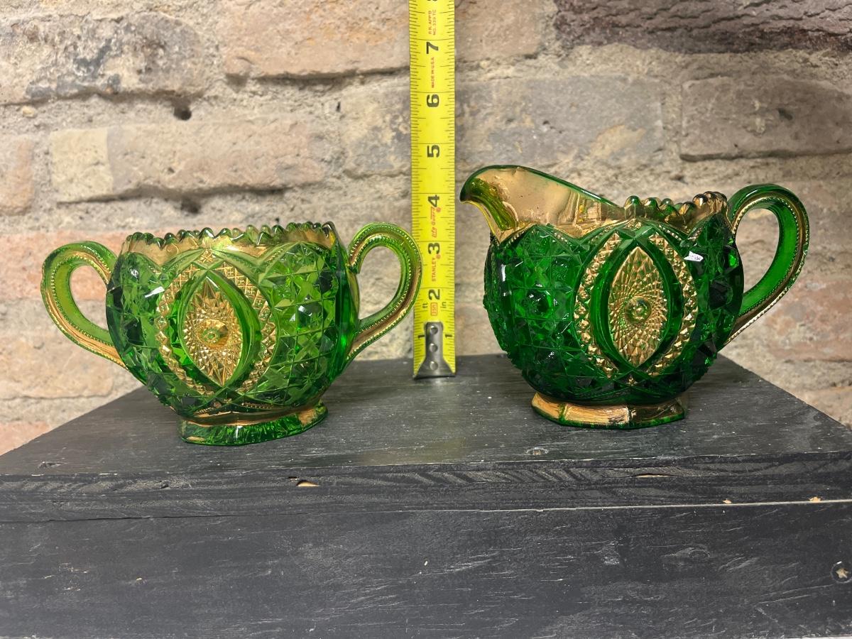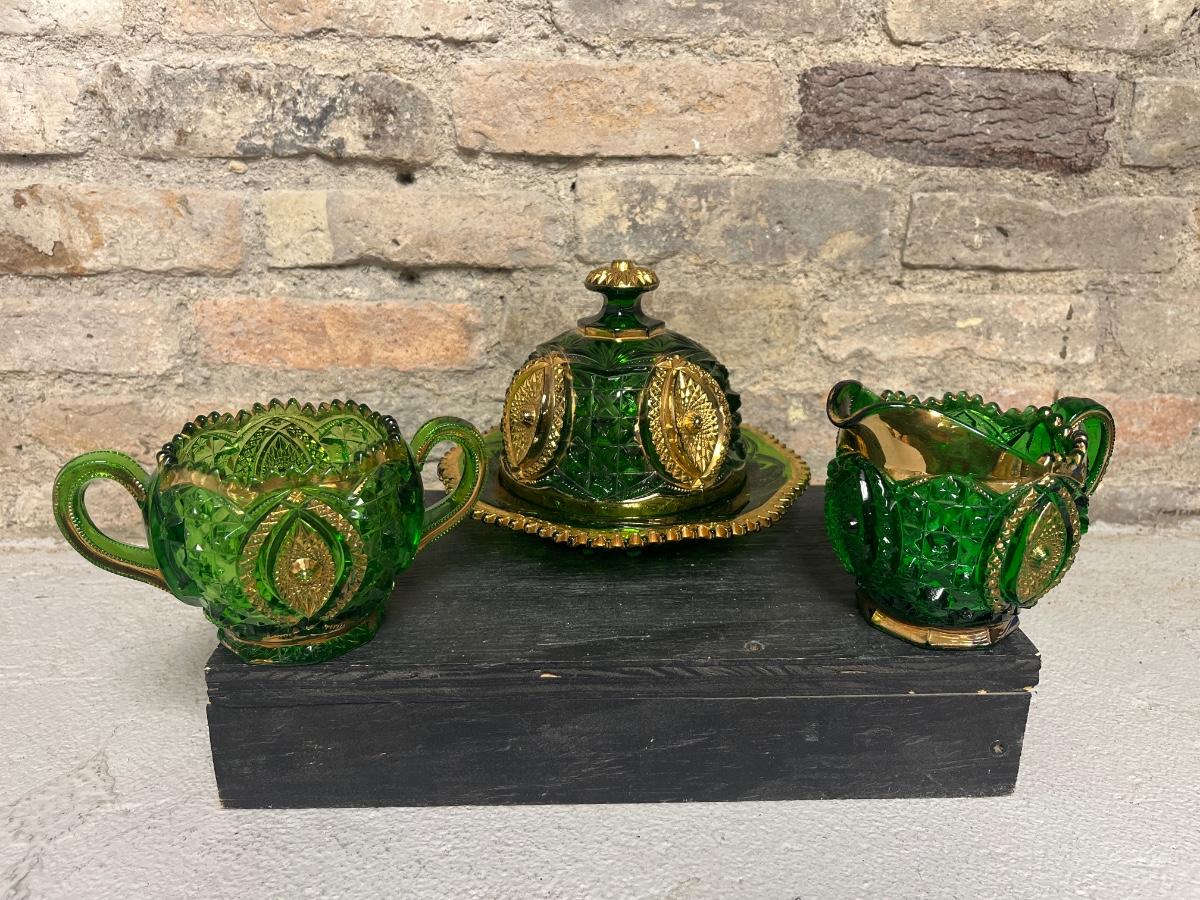 Beautiful antique emerald green covered butter dish and cream & sugar set