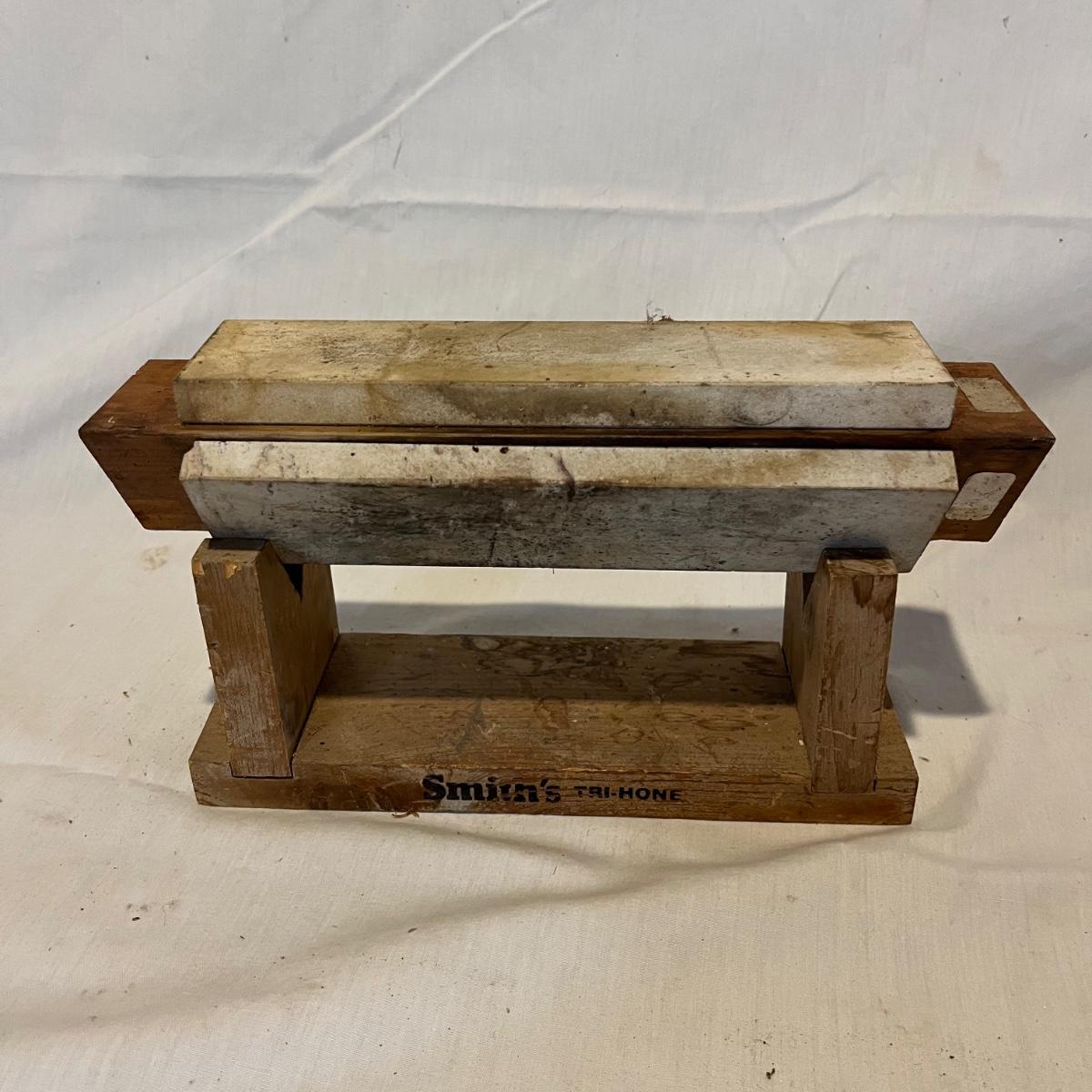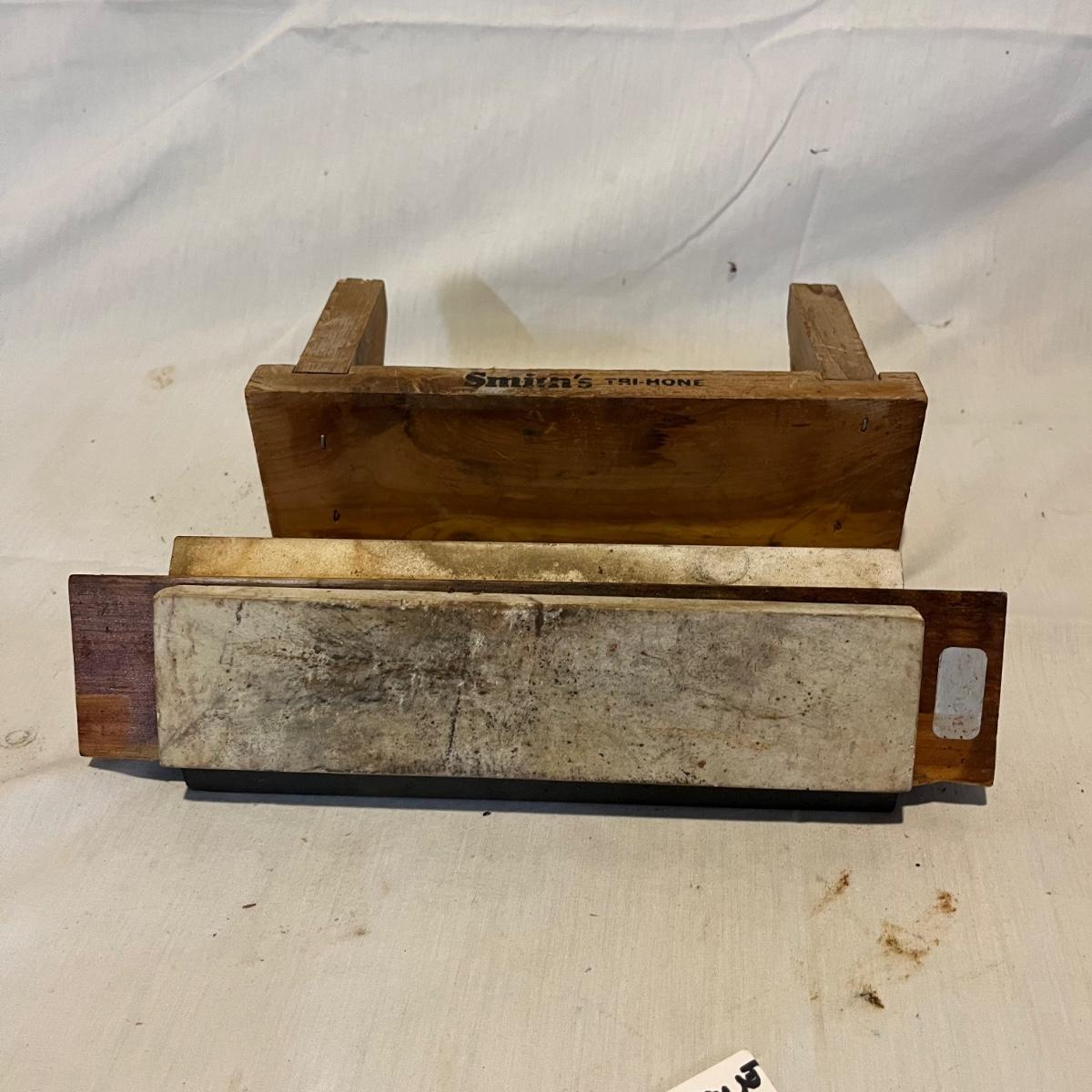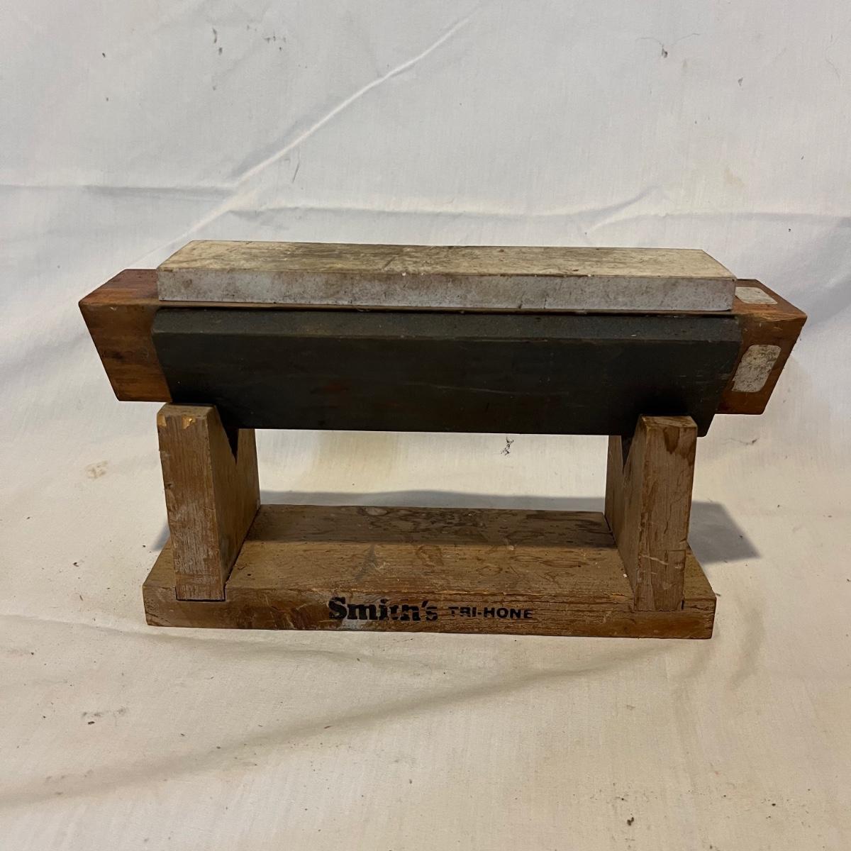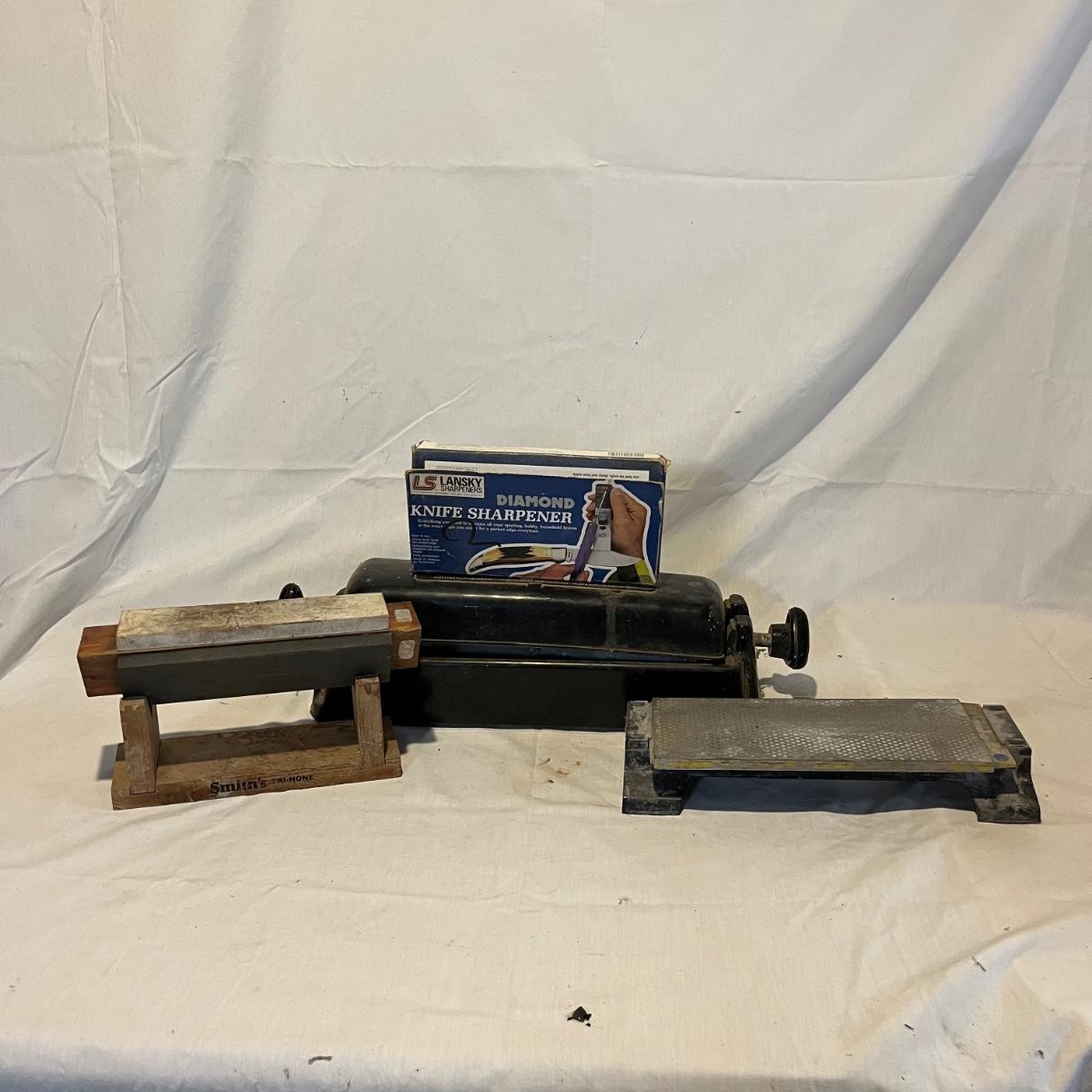 Lot includes Norton multi-oil stone, Lansky Diamond sharpener system, Smiths Tri Hone and a Diamond sharpener stone. Multi oilstone measures 5.5” x 19” x 5”.