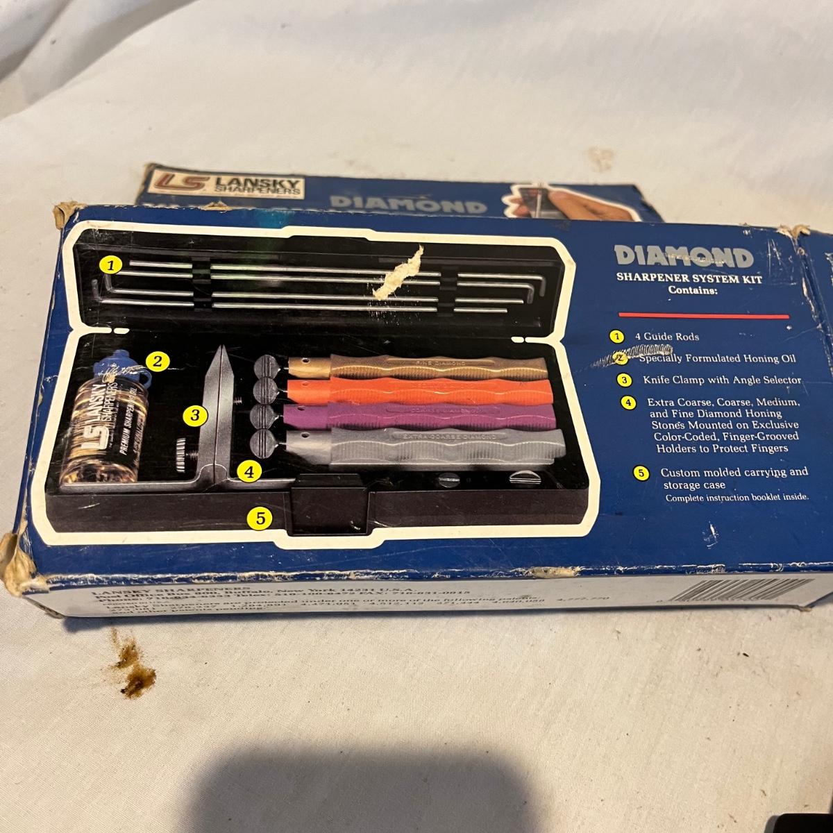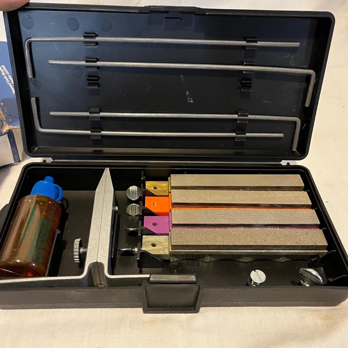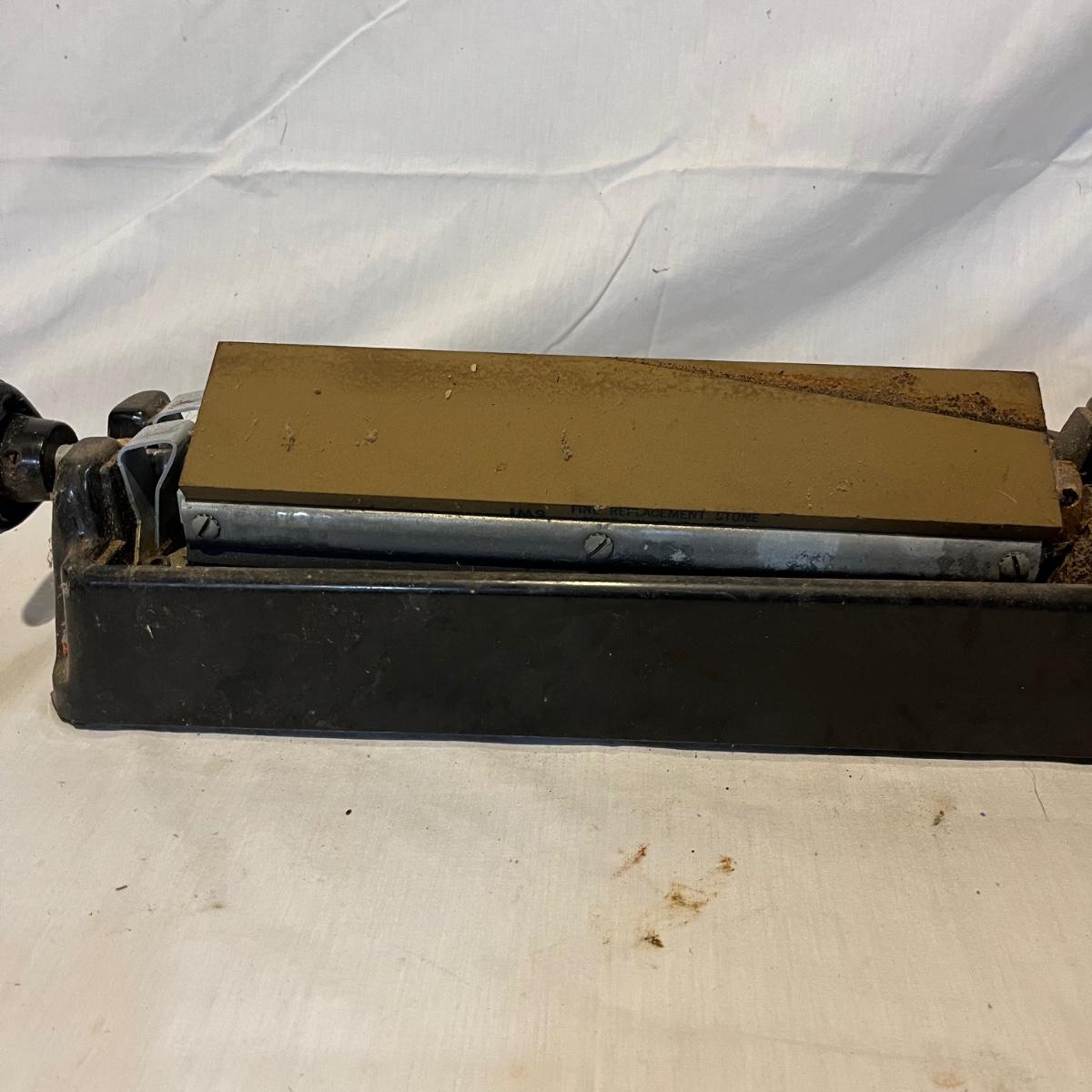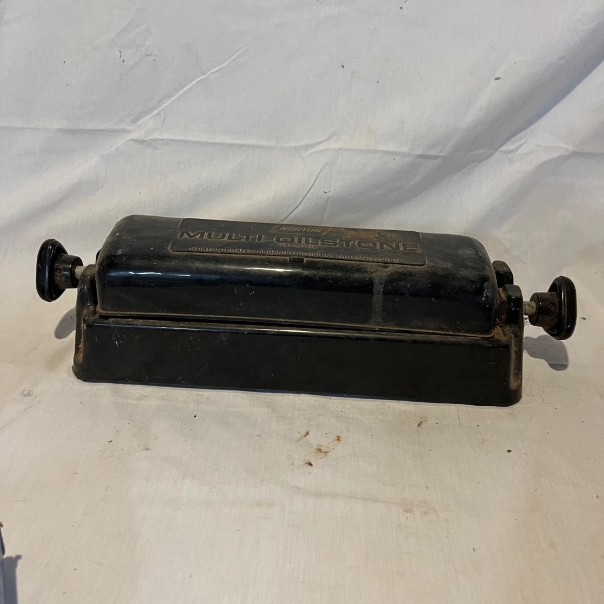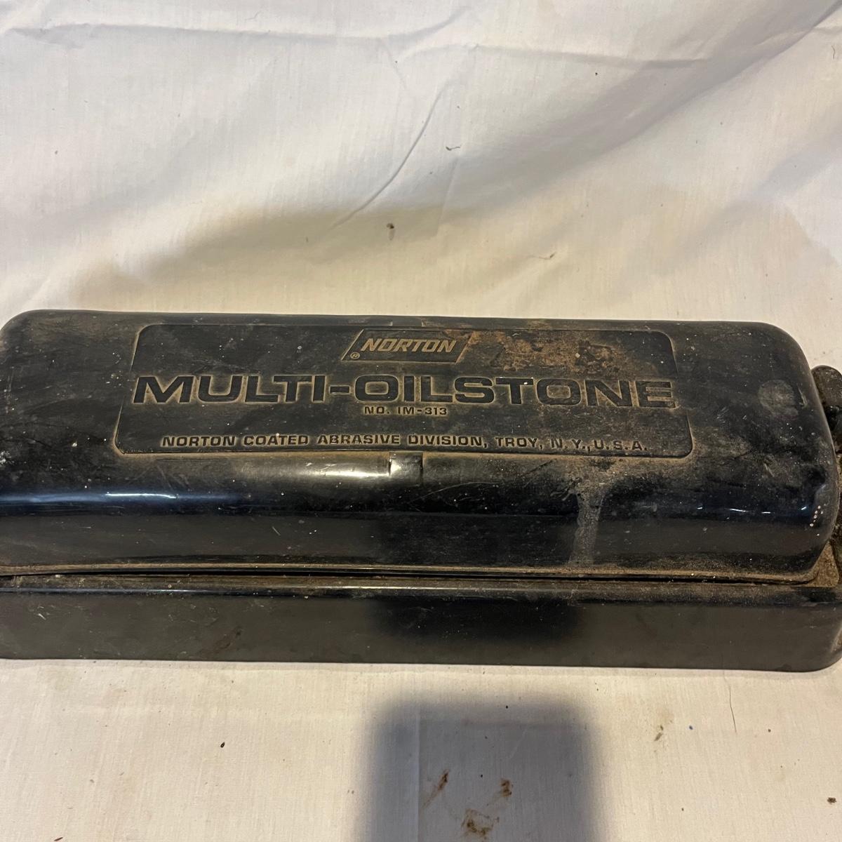 Lot includes Norton multi-oil stone, Lansky Diamond sharpener system, Smiths Tri Hone and a Diamond sharpener stone. Multi oilstone measures 5.5” x 19” x 5”.