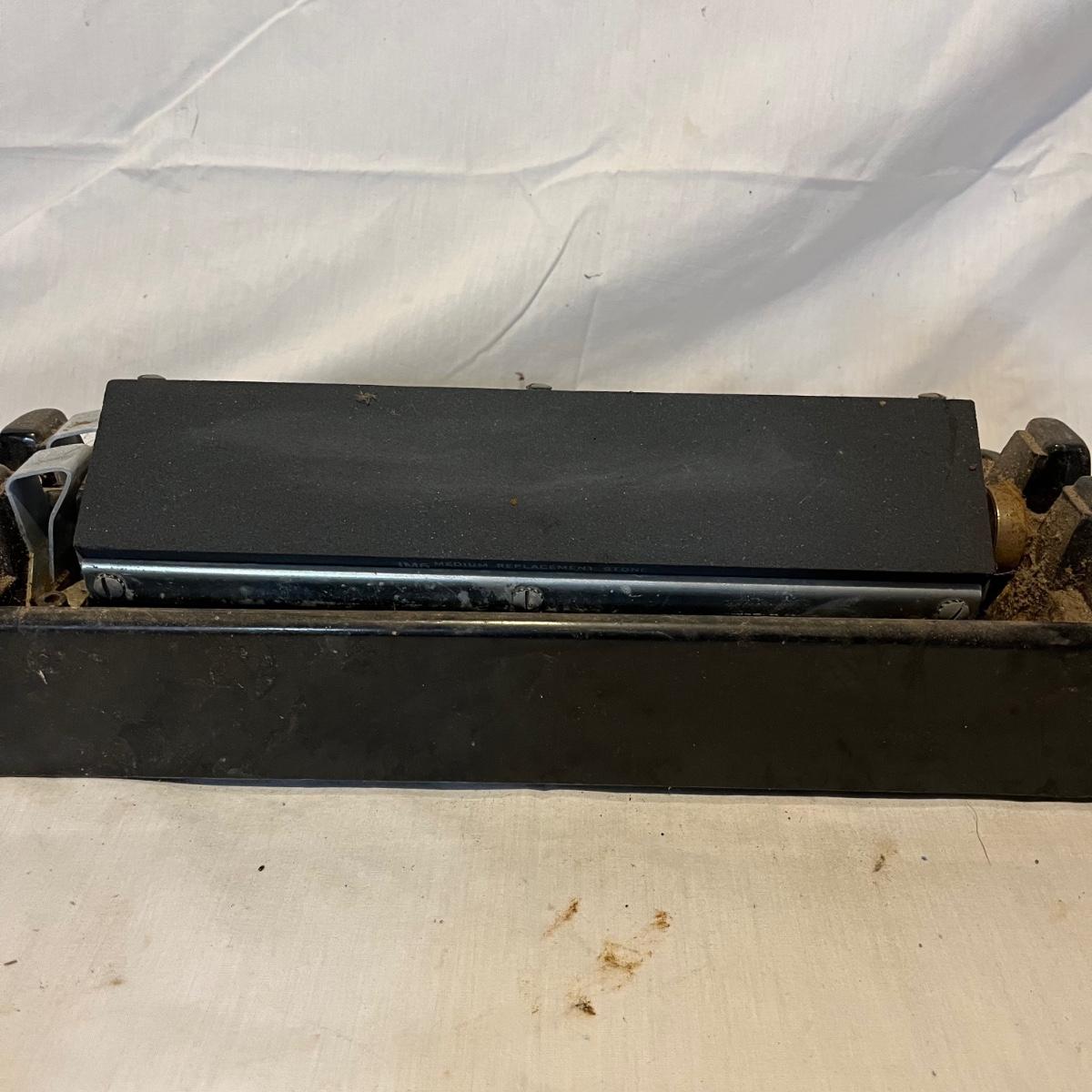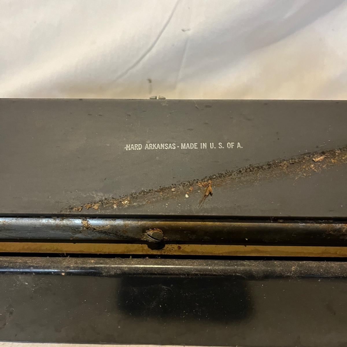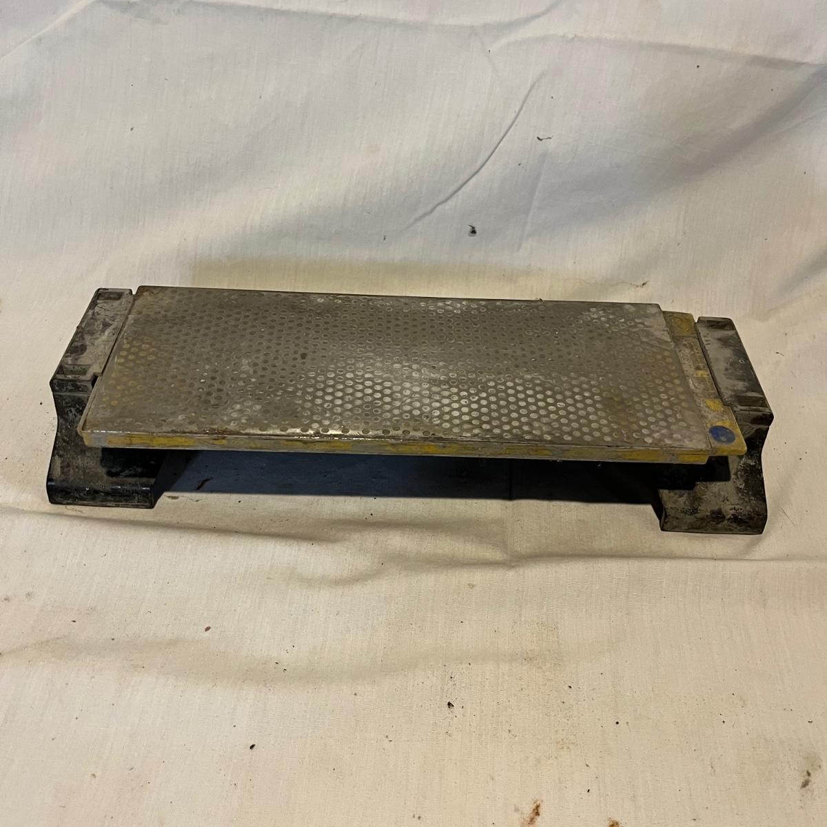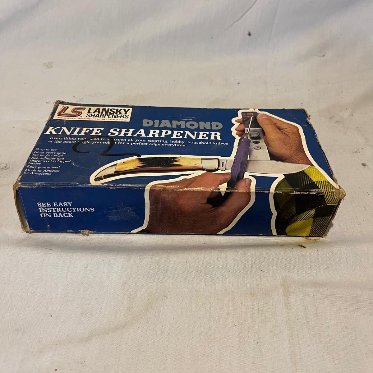 Lot includes Norton multi-oil stone, Lansky Diamond sharpener system, Smiths Tri Hone and a Diamond sharpener stone. Multi oilstone measures 5.5” x 19” x 5”.