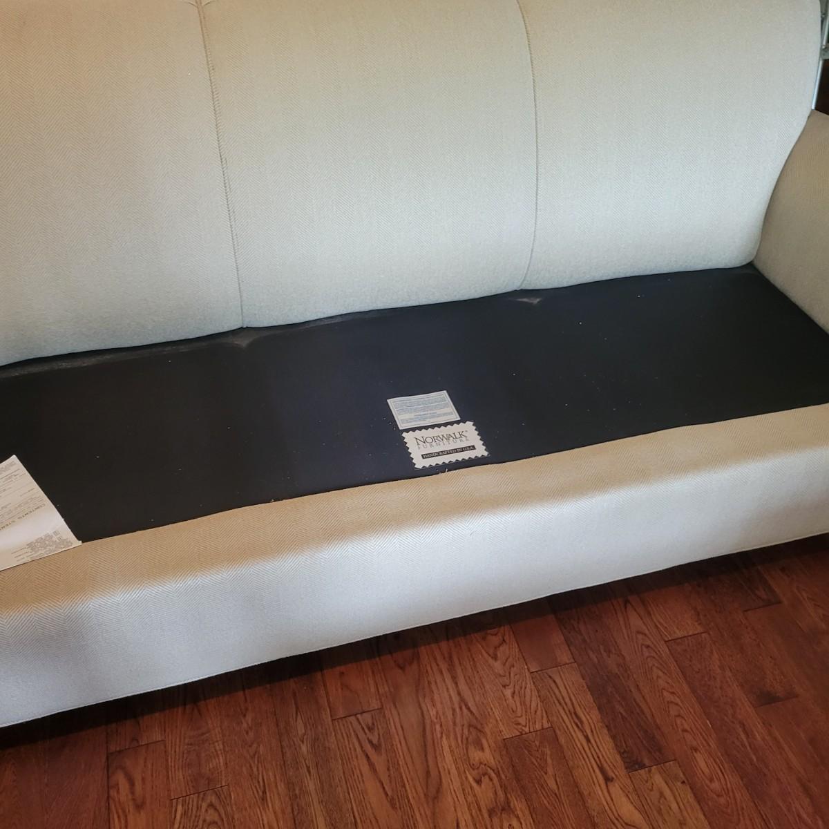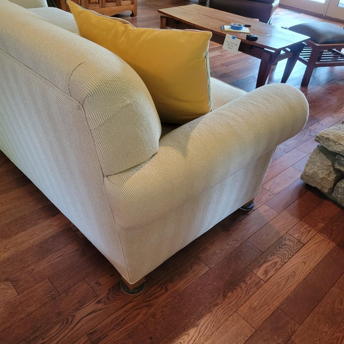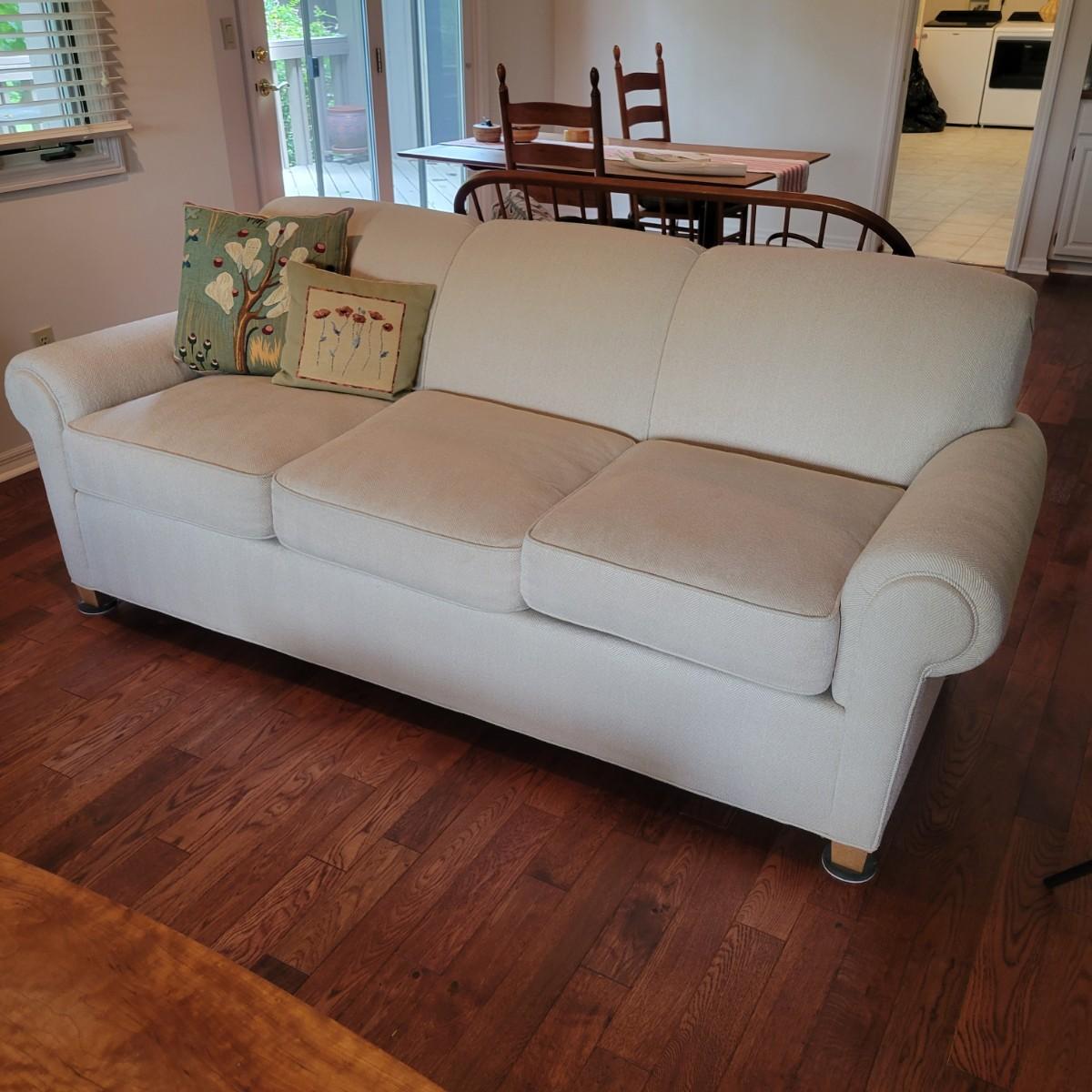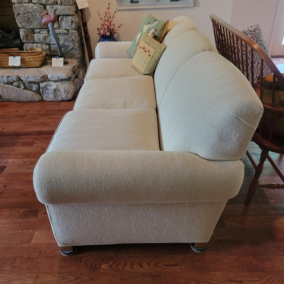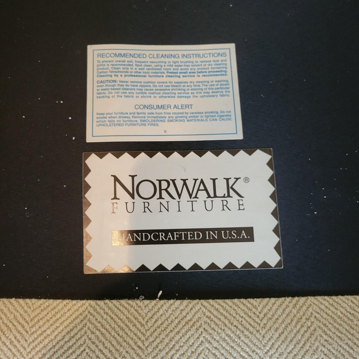 A Norwalk Furniture couch that that is upholstered in a cream/beige colored fabric with a chevron pattern. Included are two accent pillows that have an embroidered style to them. One features a poppy design and the other is olives and a tree. The couch measures approximately 84" x 34" x 25"H with a seat heightof 18".. Local pickup only. Winning bidder must bring assistance to help move and load this item due to its weight and/or size.