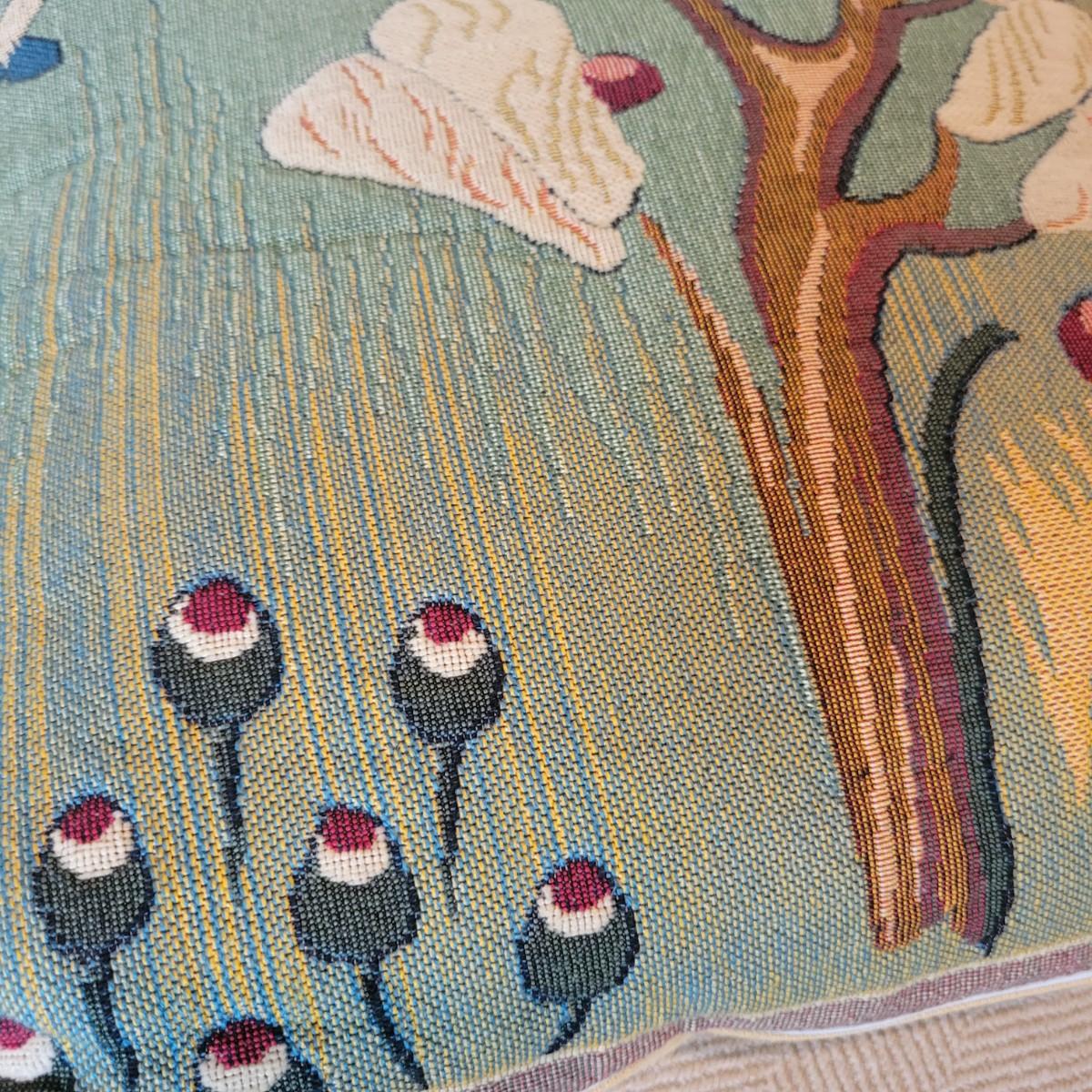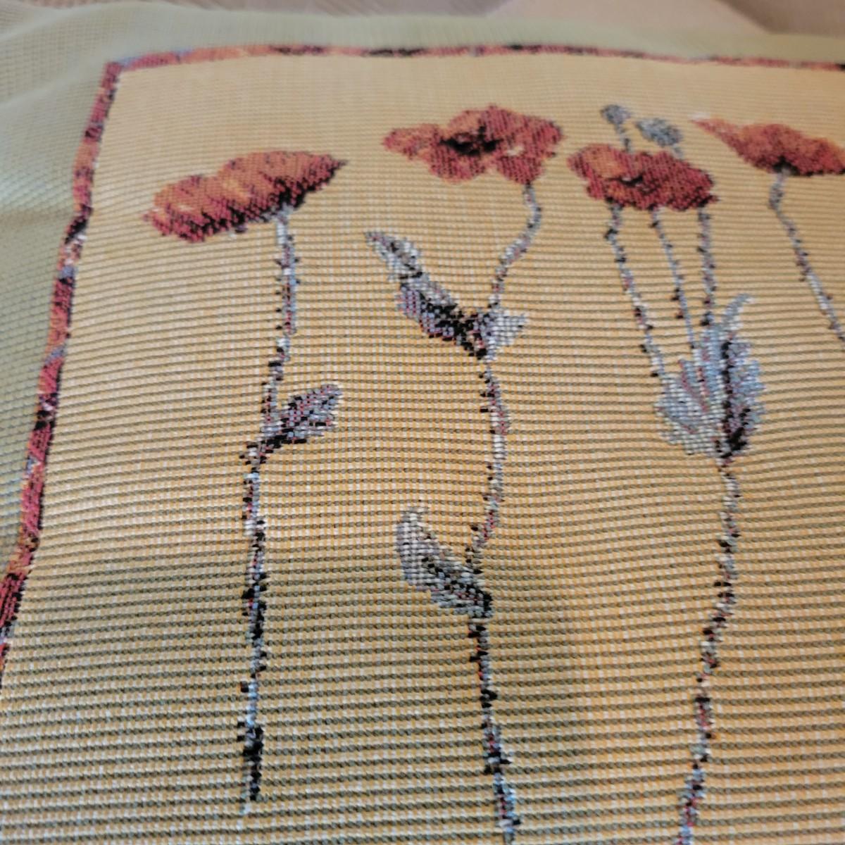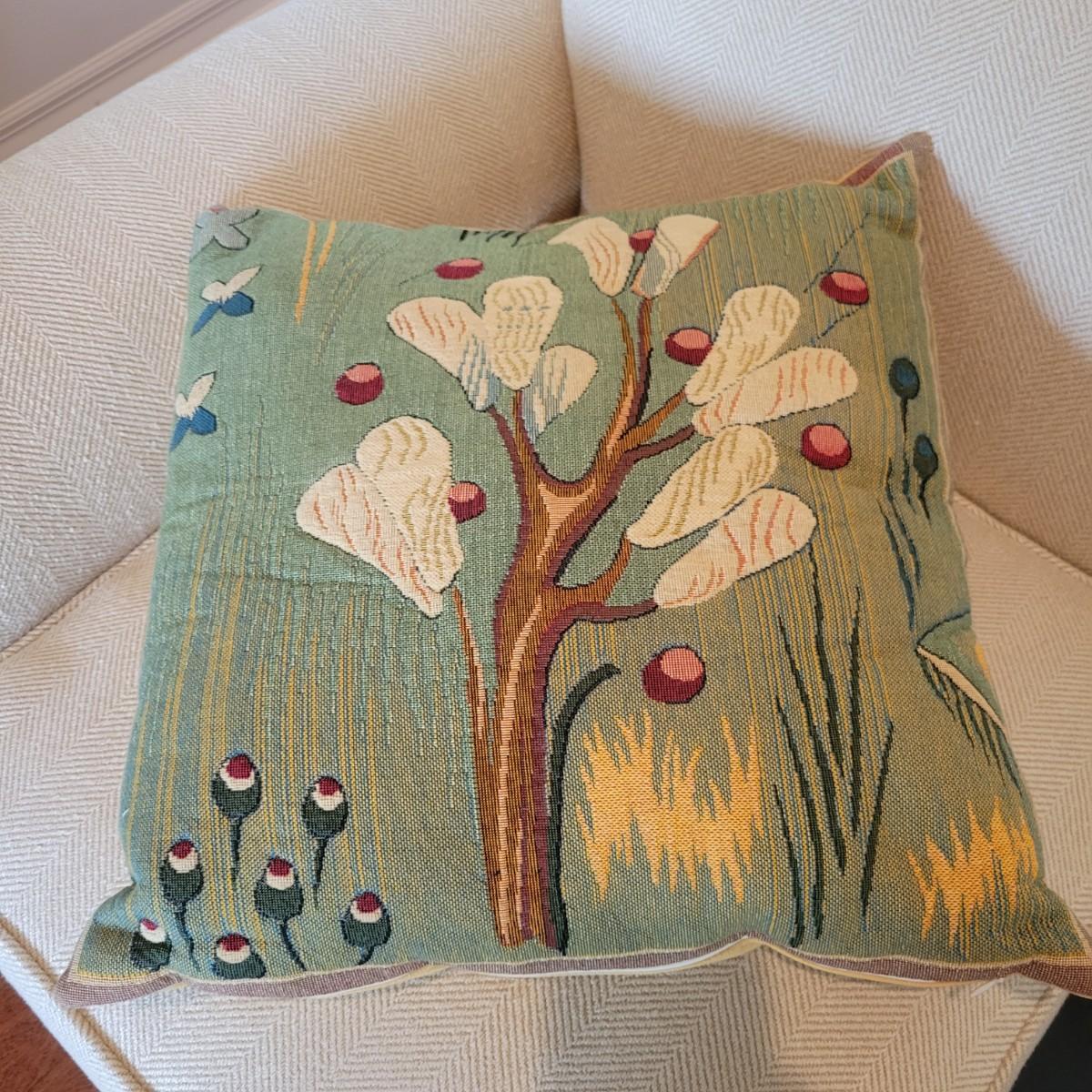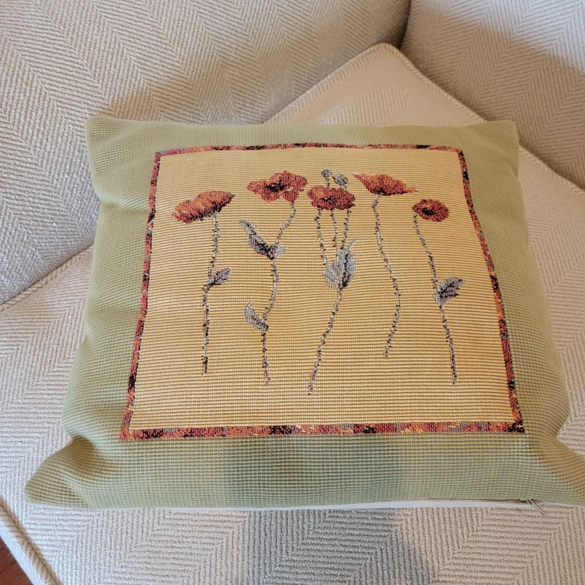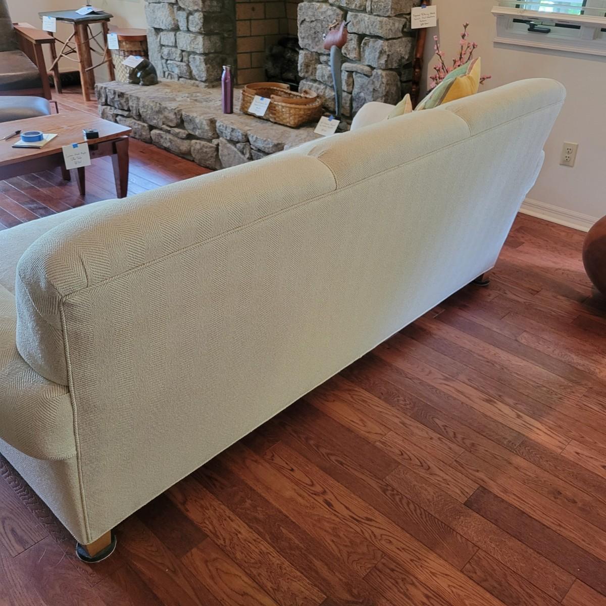 A Norwalk Furniture couch that that is upholstered in a cream/beige colored fabric with a chevron pattern. Included are two accent pillows that have an embroidered style to them. One features a poppy design and the other is olives and a tree. The couch measures approximately 84" x 34" x 25"H with a seat heightof 18".. Local pickup only. Winning bidder must bring assistance to help move and load this item due to its weight and/or size.