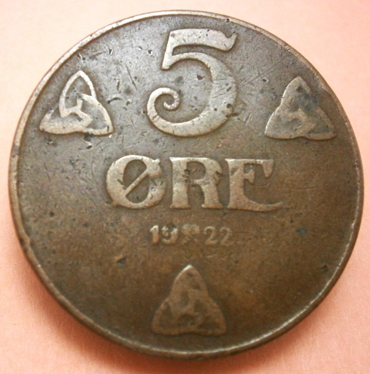 NORWAY 1922 5 ORE Copper Coin