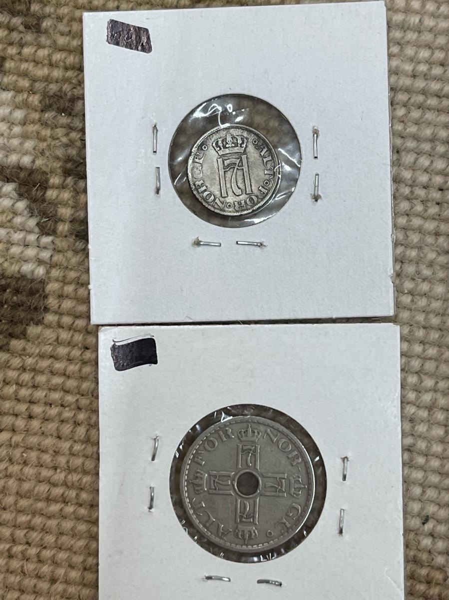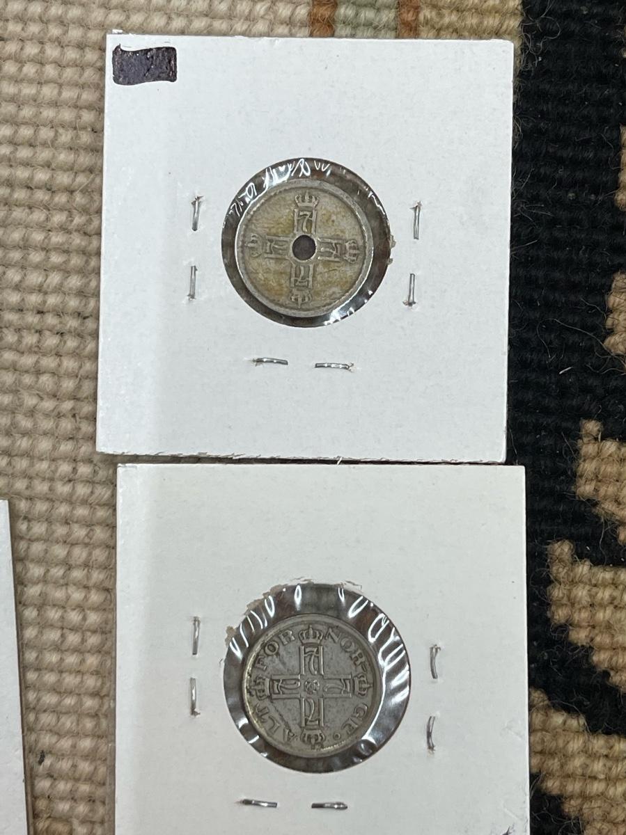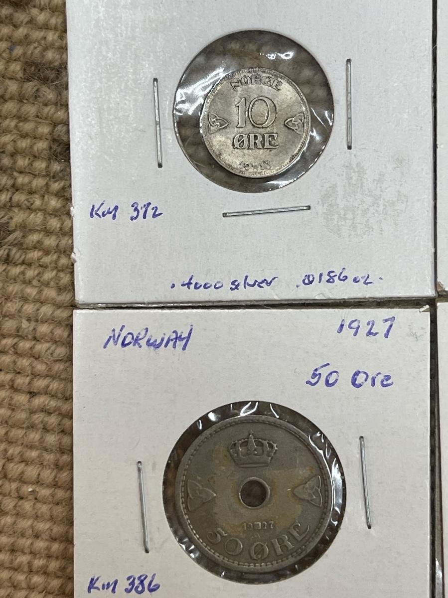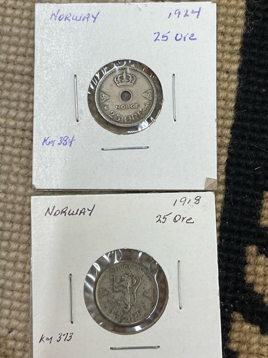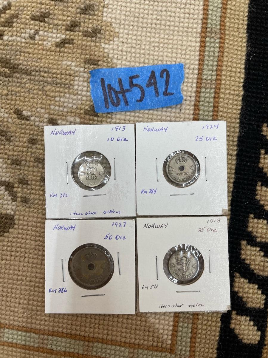 (4) vintage Norway coins - 1913 10 ore, 1924 25 ore, 1927 50 ore, 1918 25 ore.