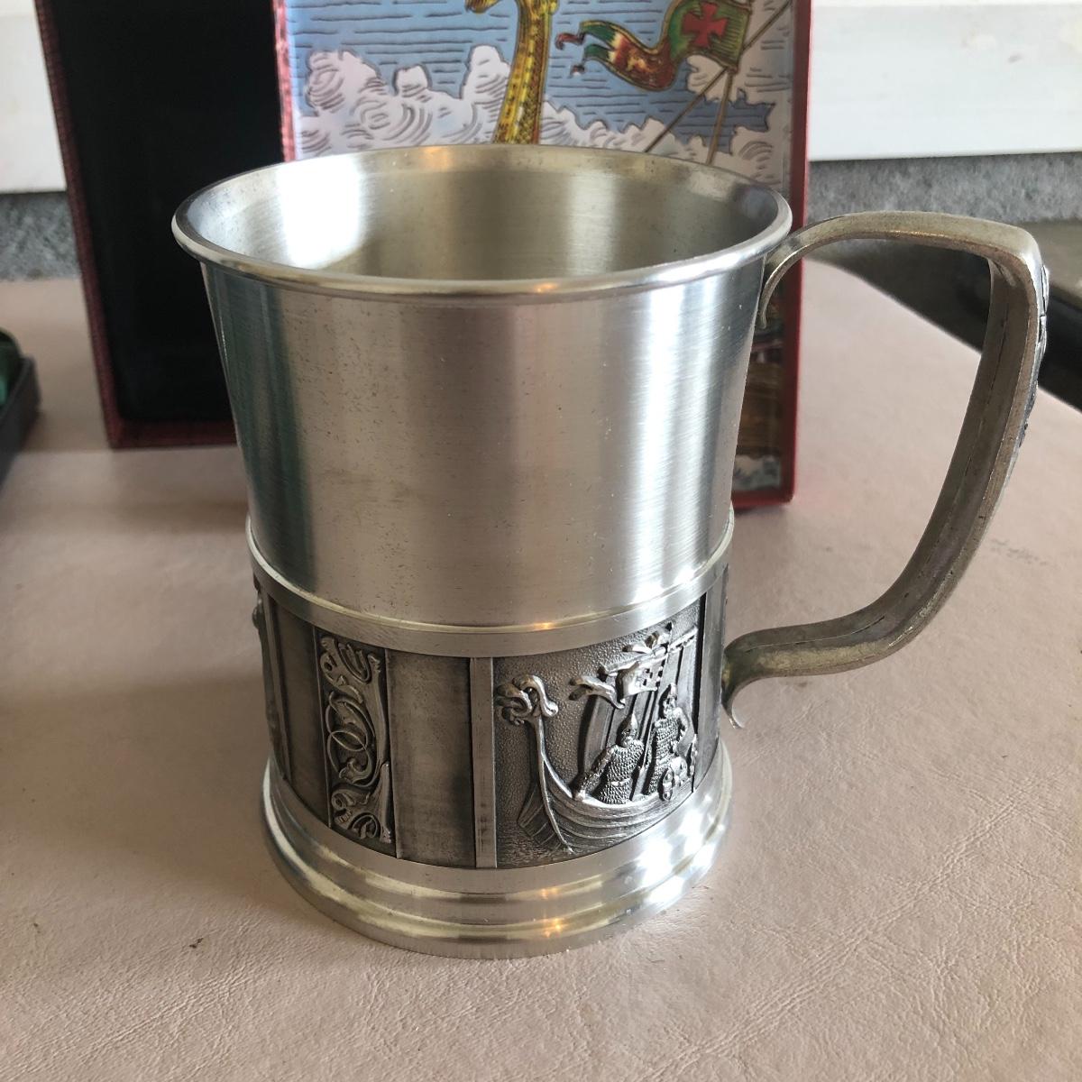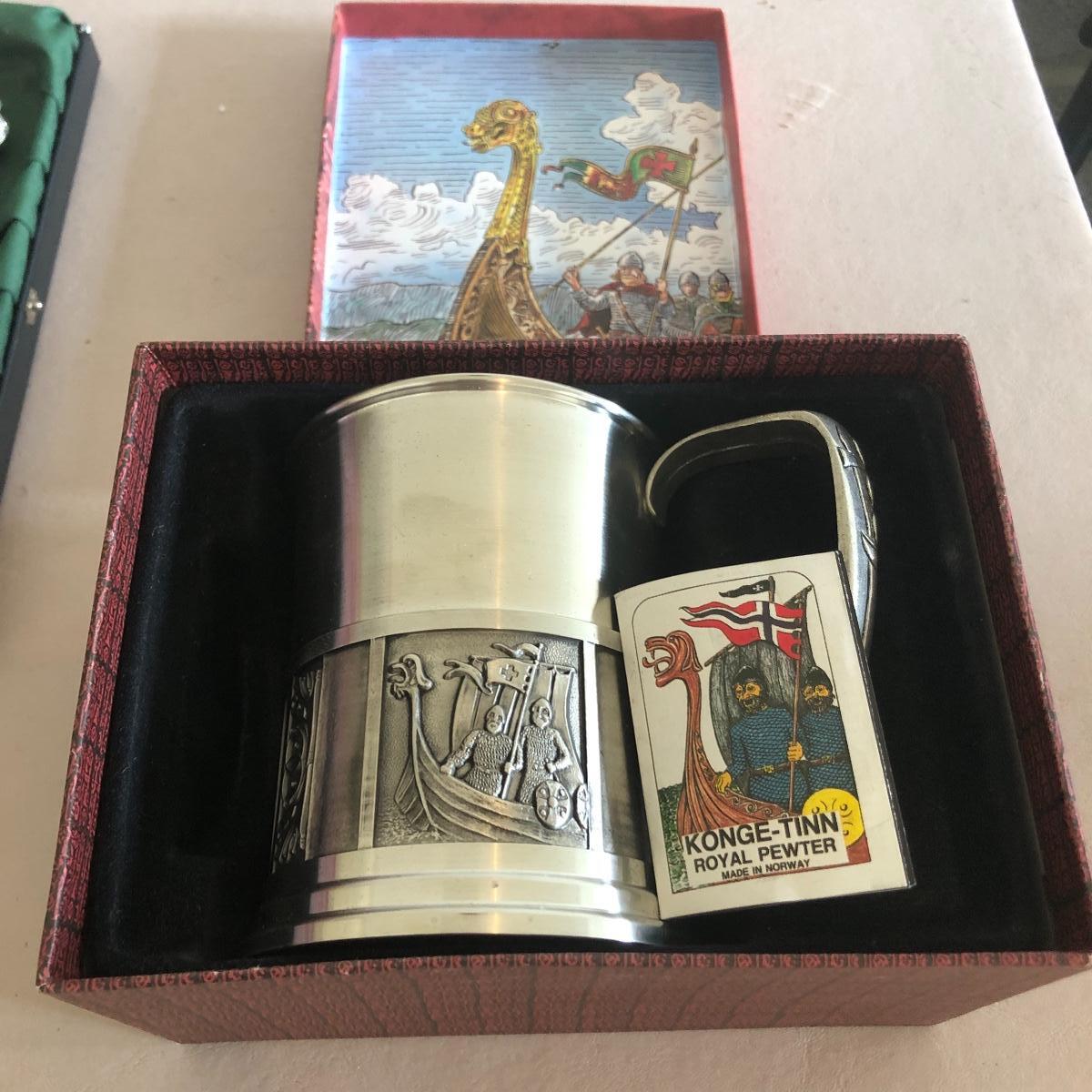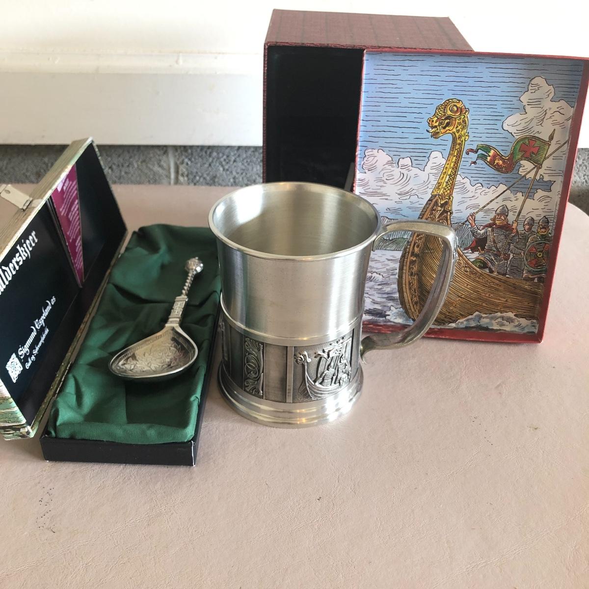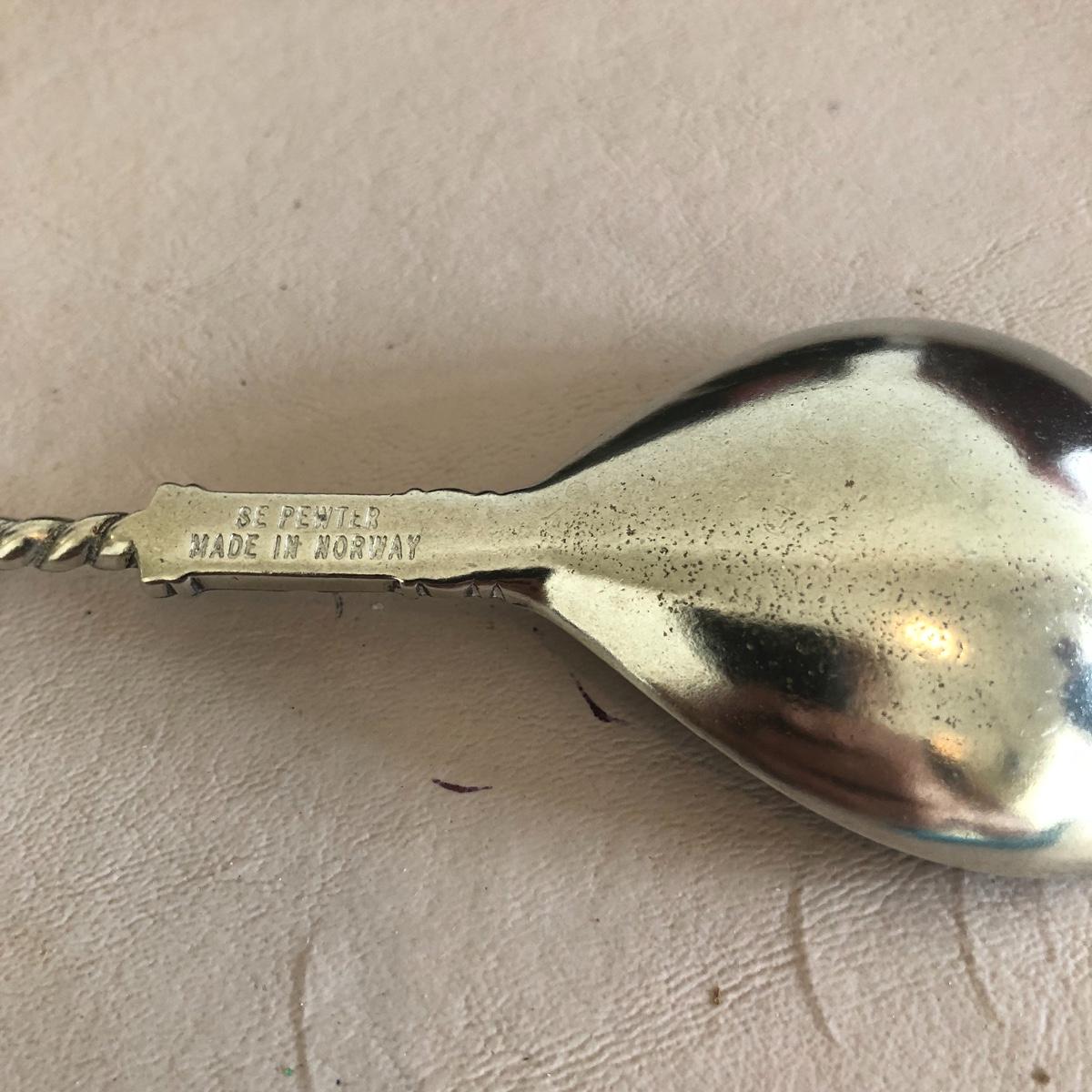 Both the spoon and the mug have stamps that say Norway and pewter. Mug measures 3.5” d x 4.5” tall.
