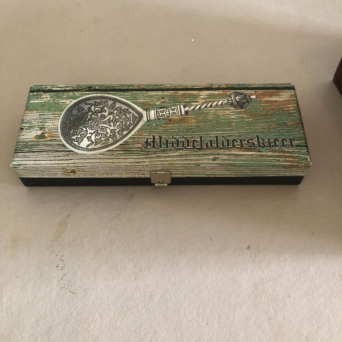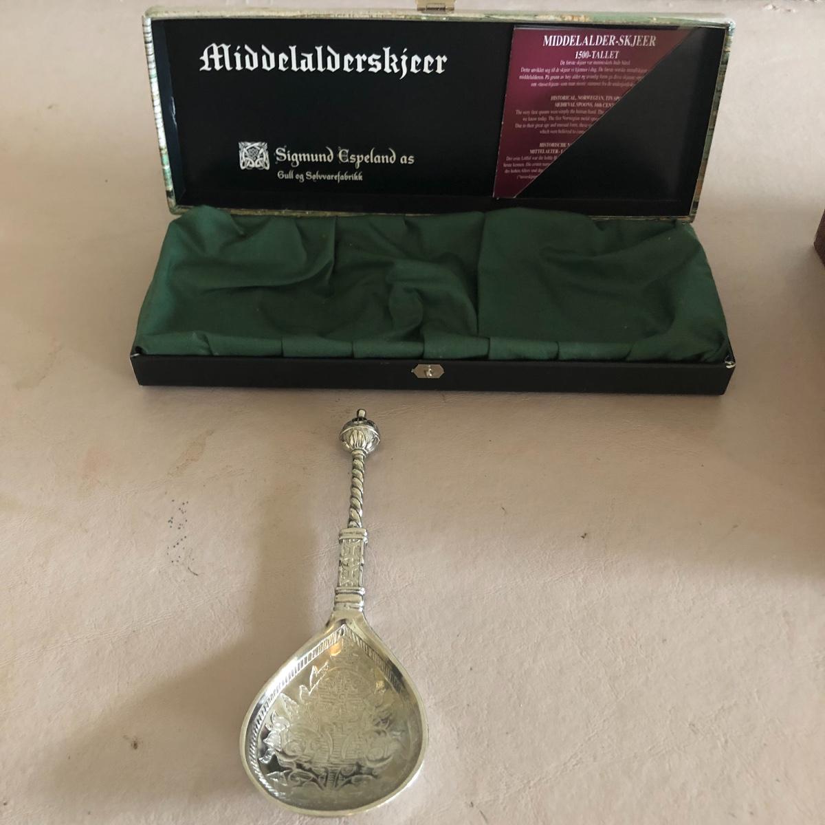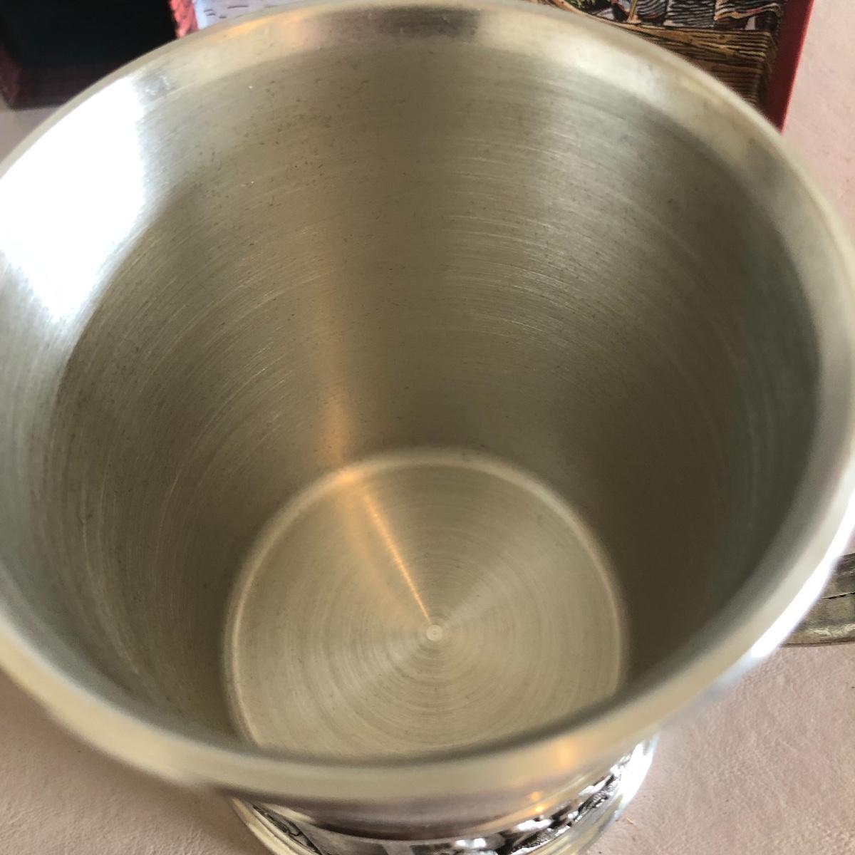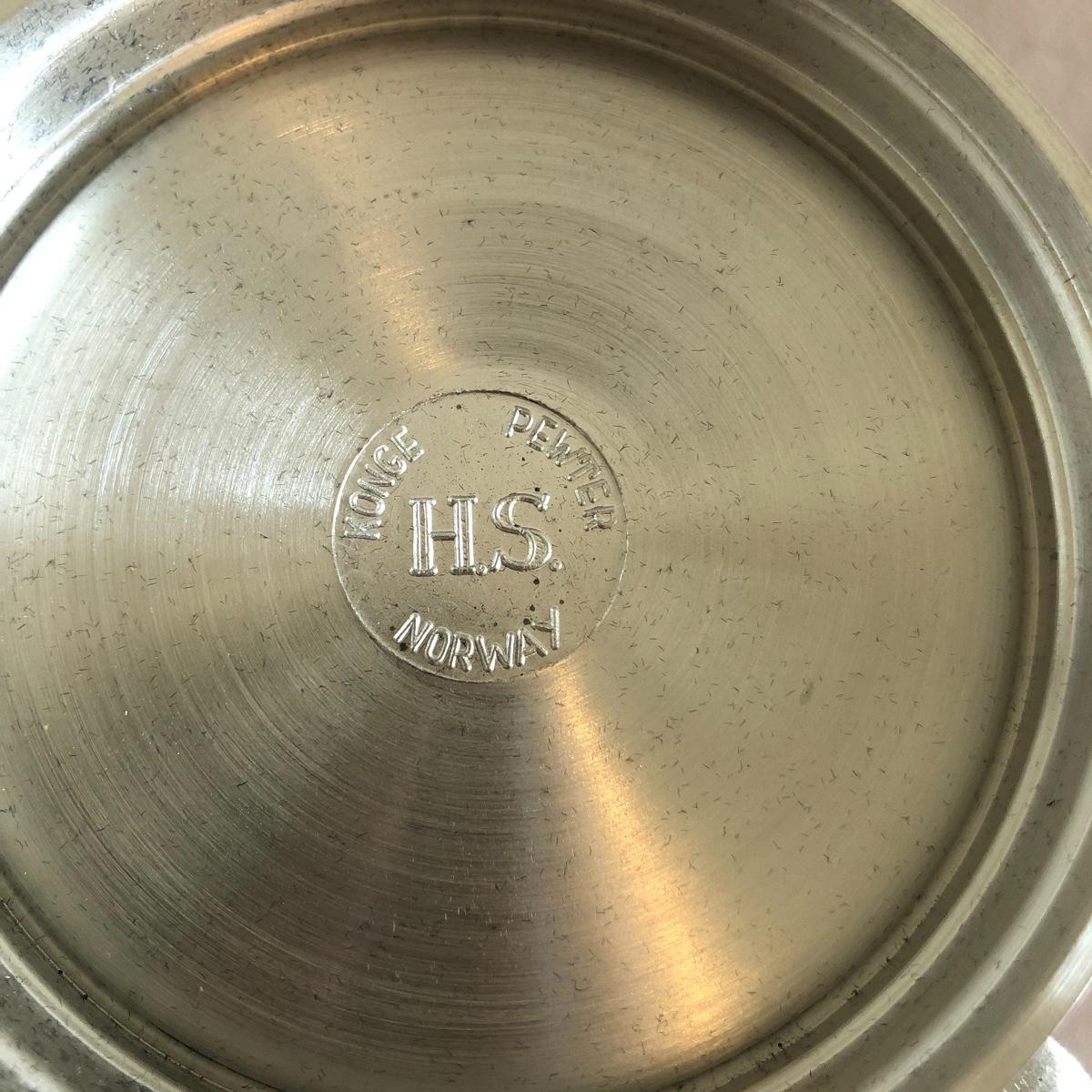 Both the spoon and the mug have stamps that say Norway and pewter. Mug measures 3.5” d x 4.5” tall.