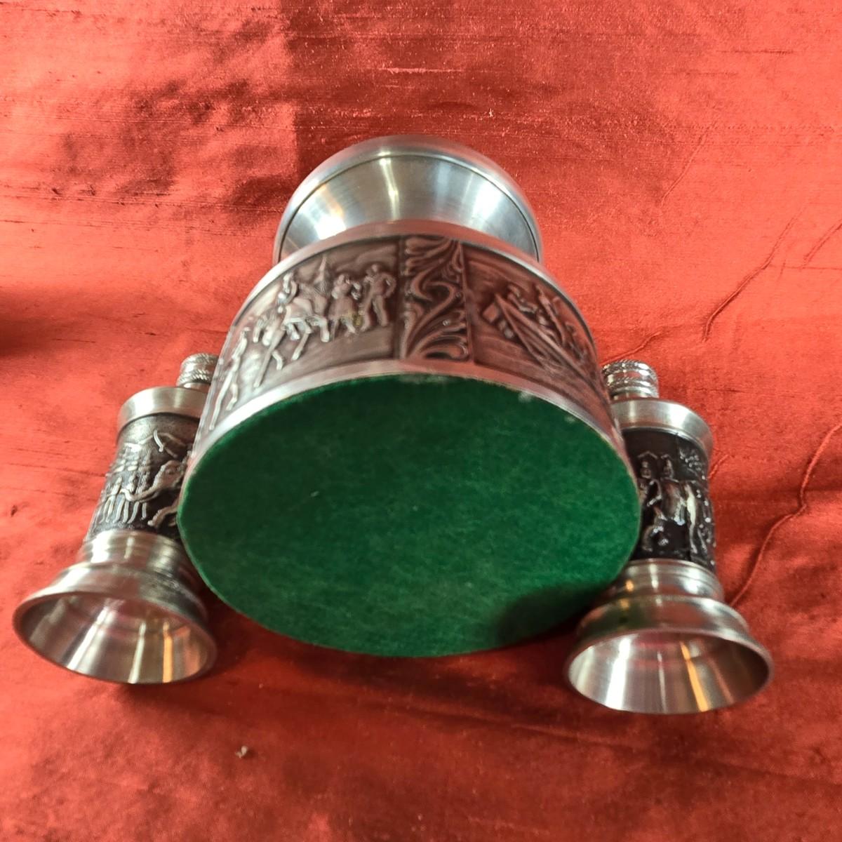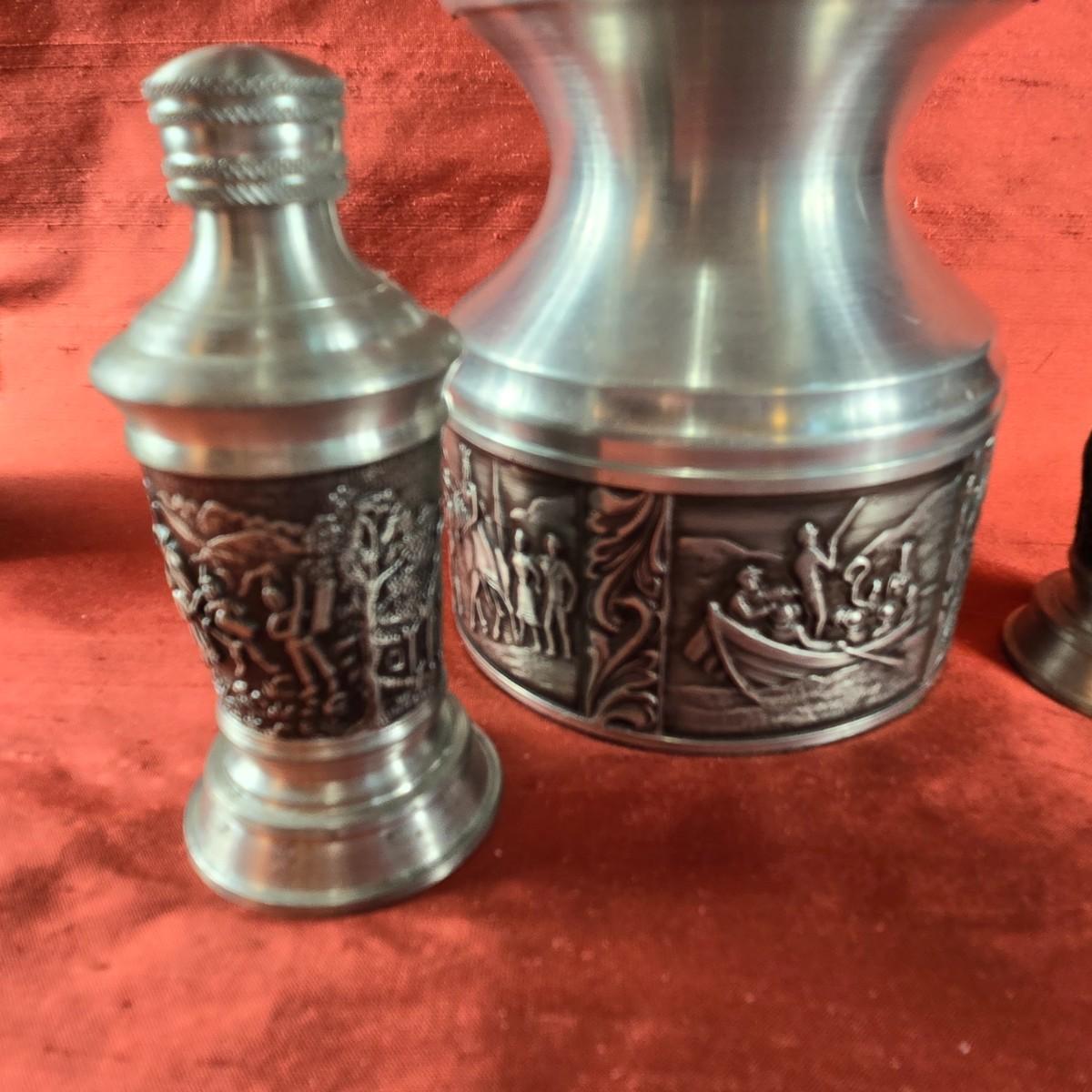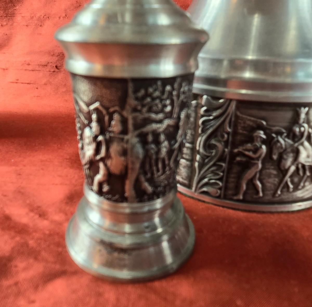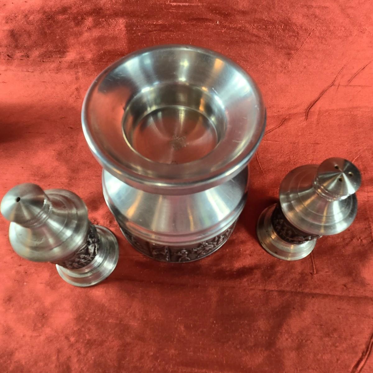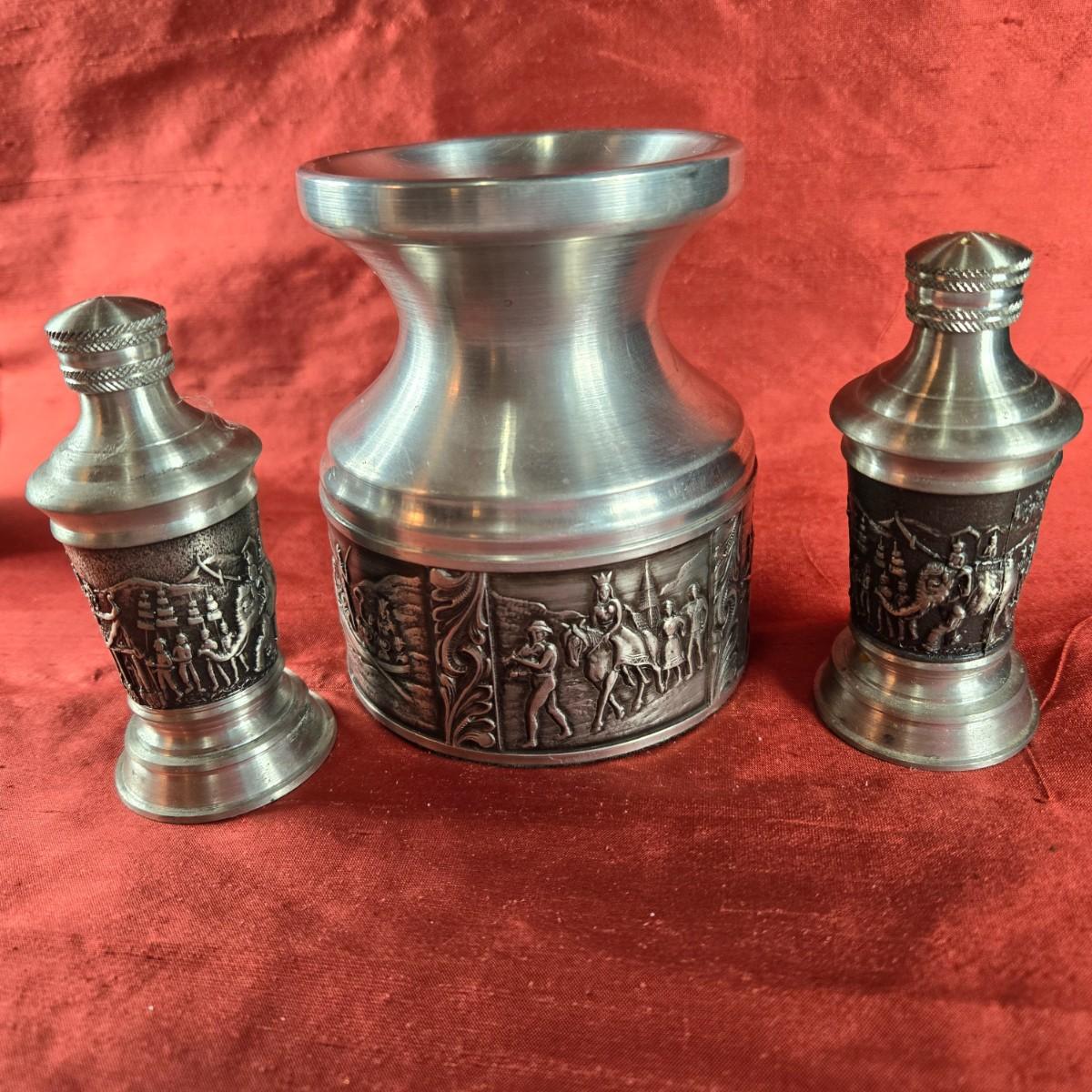 This auction lot is for a Norwegian Pewter Salt, Pepper and Candle Holder. This is a nicely crafted set with good detail and would look good sitting on most any table. Candle holder is 3-1/2 inches in diameter x 4 inches tall. The salt/pepper set is 1-3/4 inches in diameter x 3-3/4 inches tall, each. Great for a nice intimate, romantic meal coupled with other special serving items.