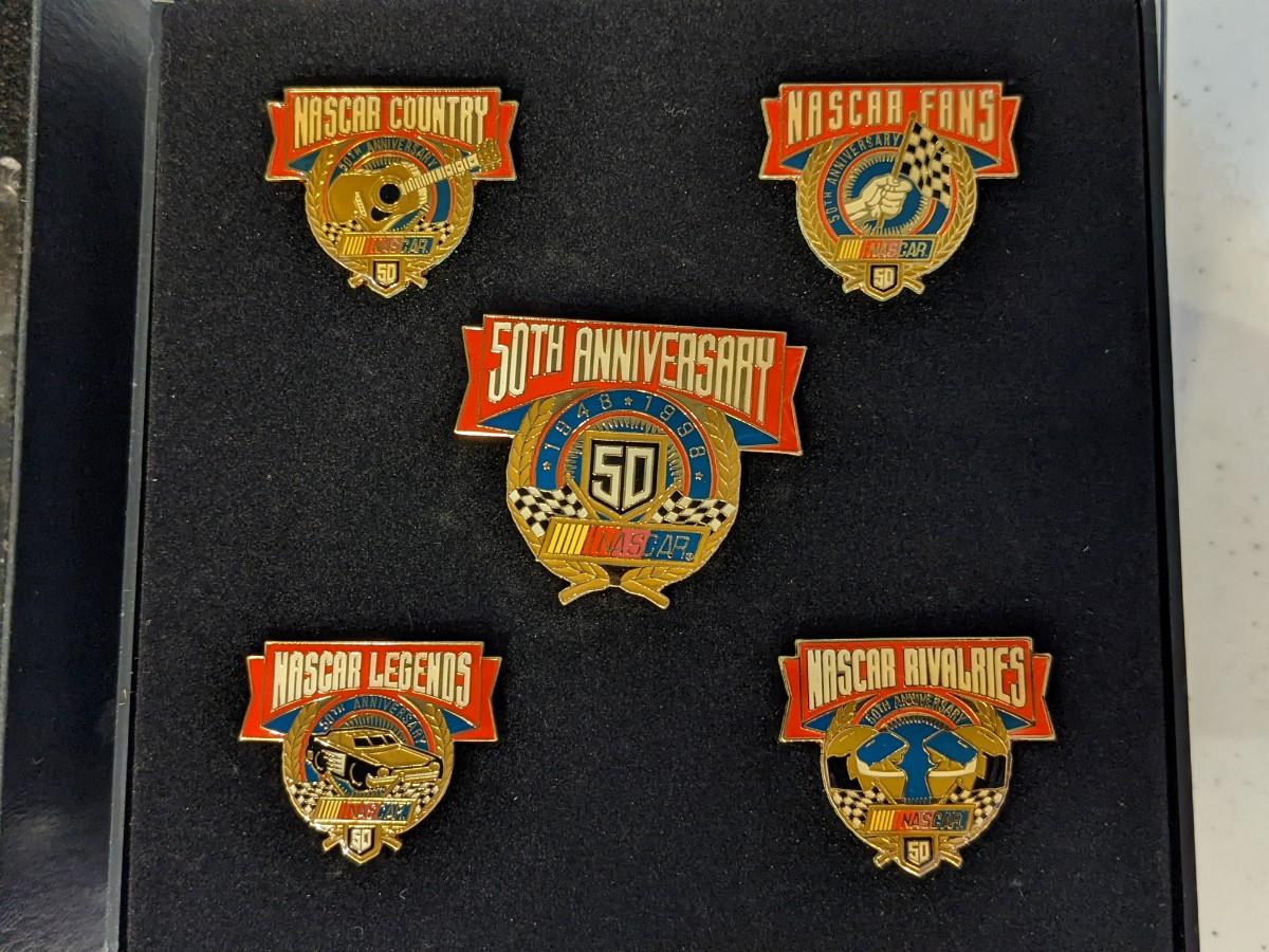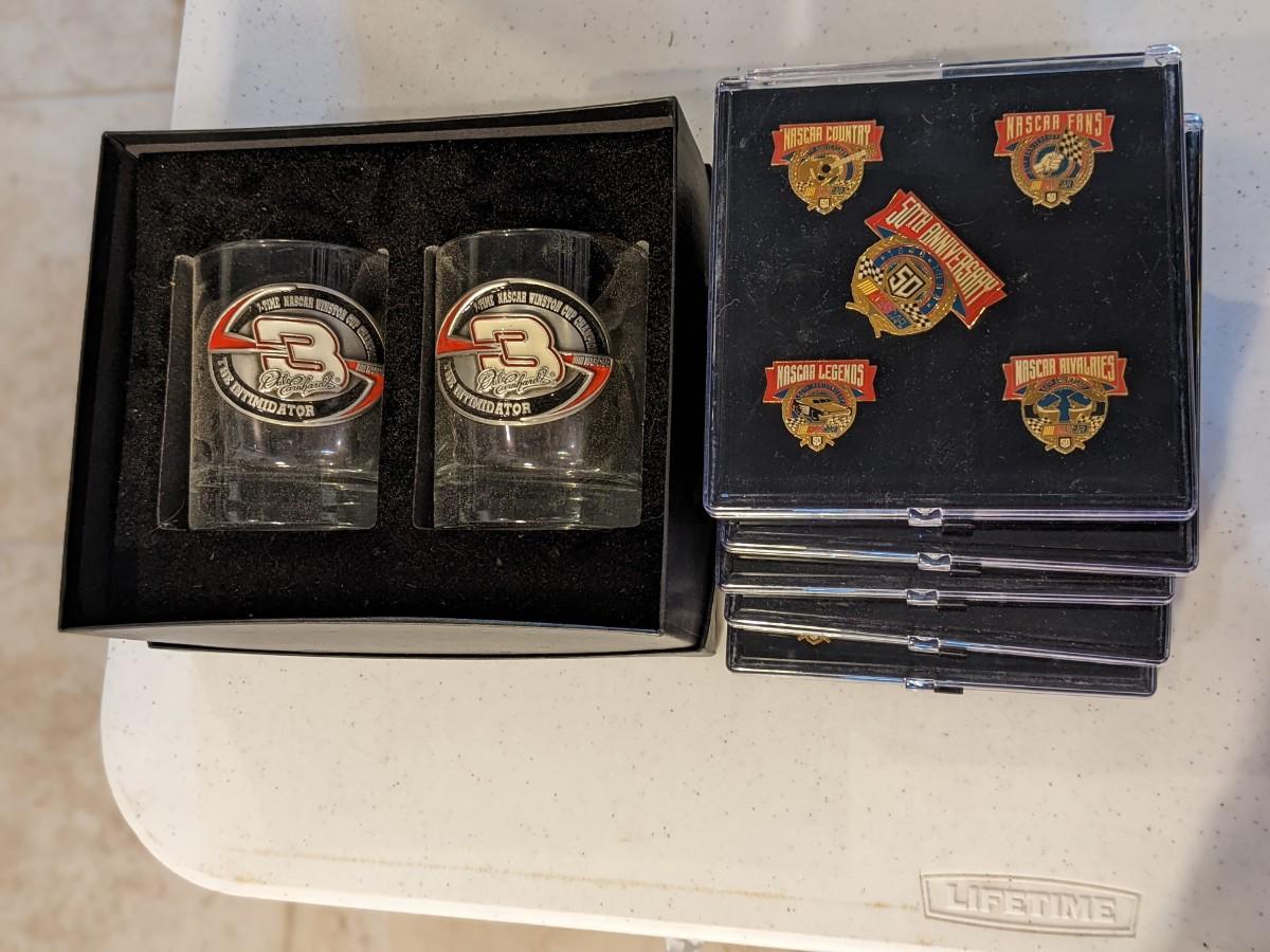 NOS Dale Earnhardt Tumblers and 5 Sets of 50th Anniversary Nascar Pins