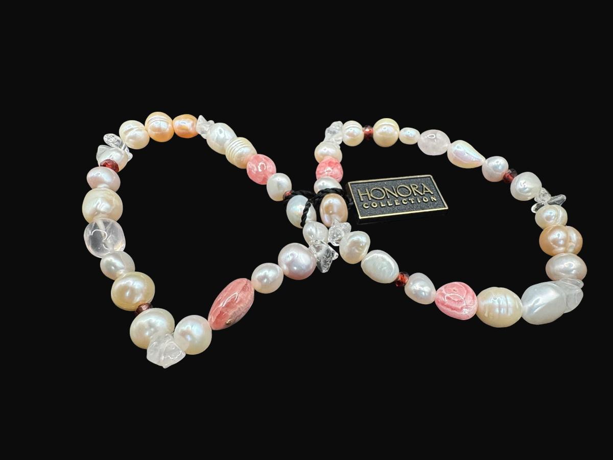 Includes a bracelet with Baroque pearls and rhodonite, and a bracelet with Baroque pearls, colored pearls, and semi-precious stones. Includes original boxes and bags. [AG]