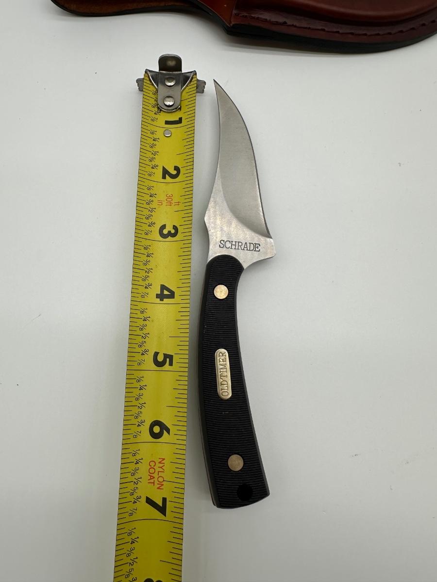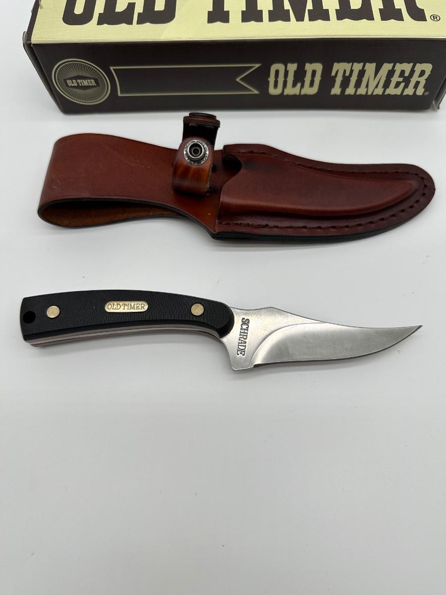Brand new Old Timer fixed-blade hunting knife, model 152OT, by Schrade. Features a curved clip-point blade, full tang construction, and black handled grip with brass pins. Comes with original leather sheath and original Old Timer box. Never used—excellent gift or collection piece.