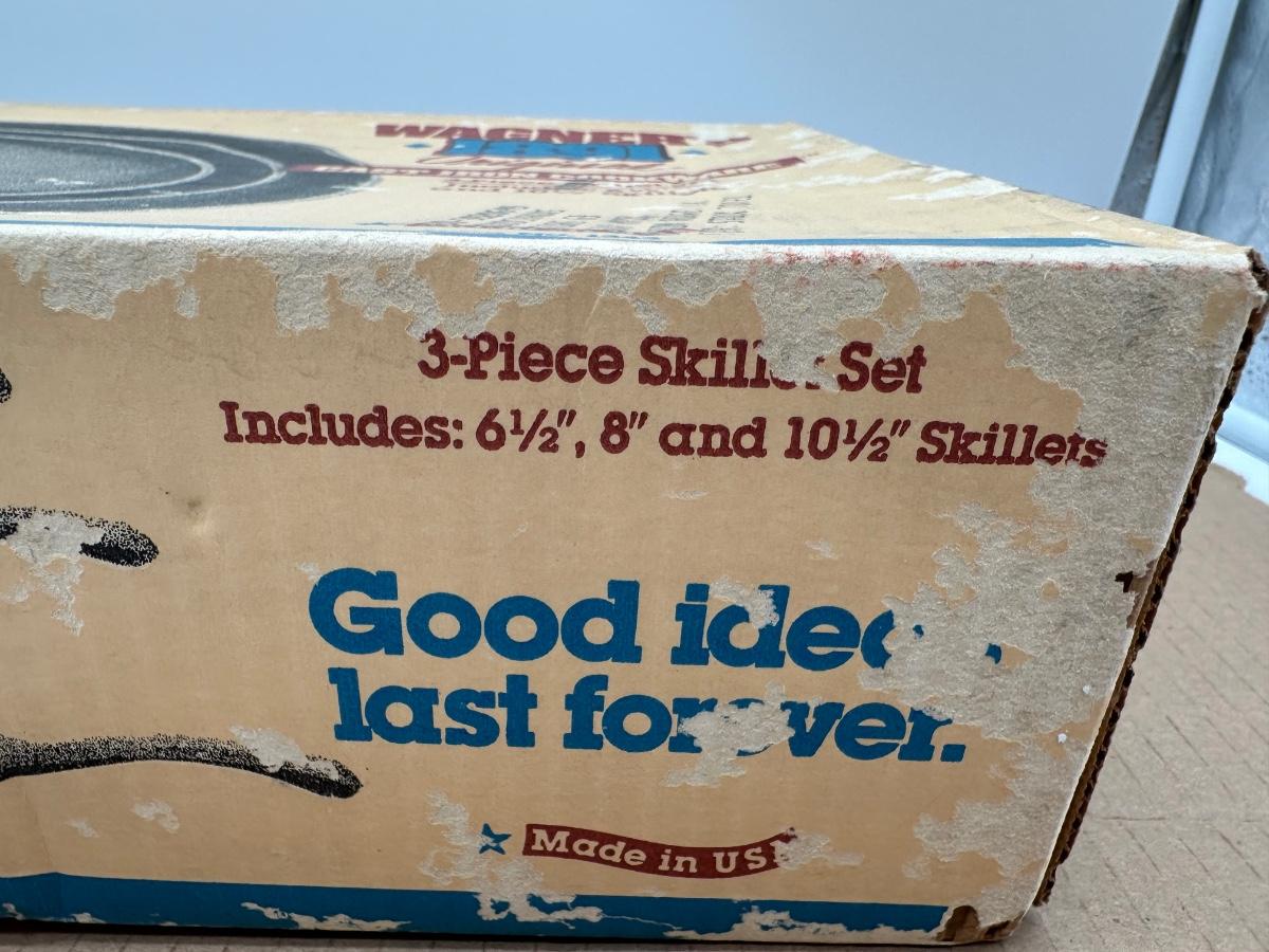 Vintage Wagner’s 1891 Original cast iron cookware 3-piece skillet set, Made in USA, in the original factory box. Set includes 6½” , 8” , and 10½” skillets. Box features classic Wagner graphics and slogan “Good ideas last forever.” A great collectible cast iron set or upgrade for a serious home cook.