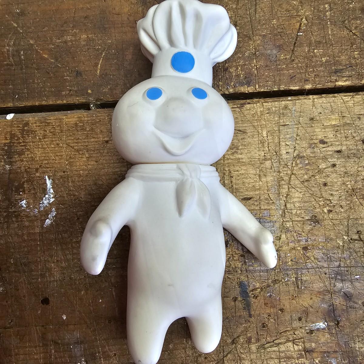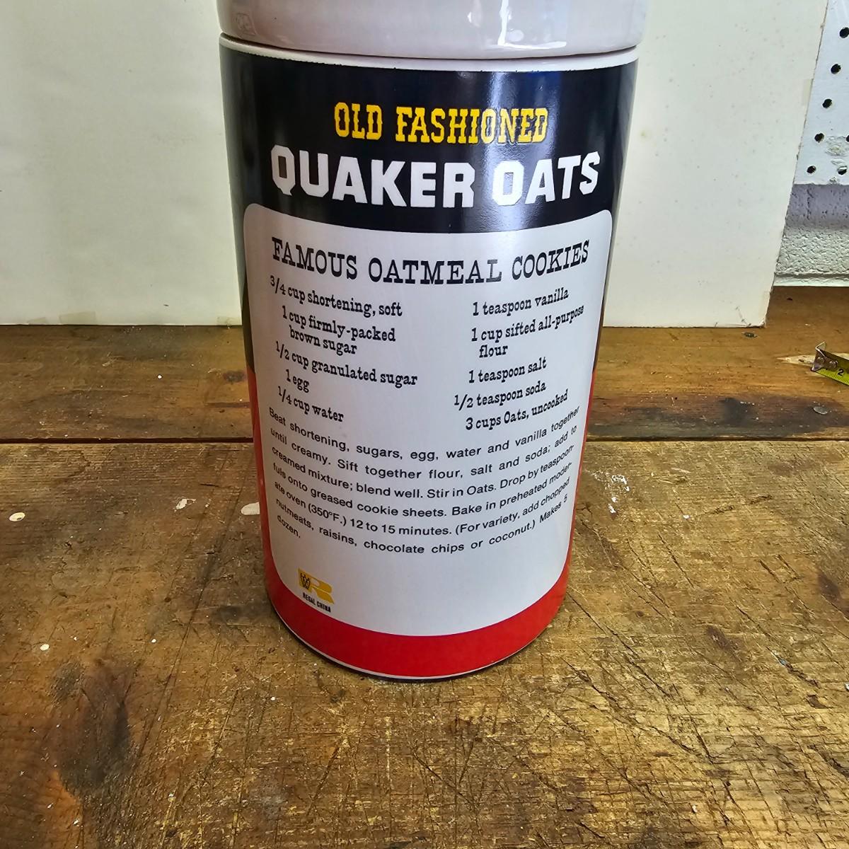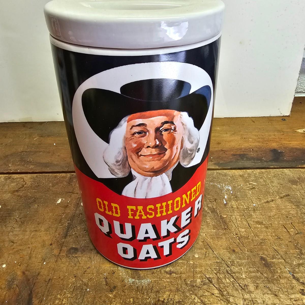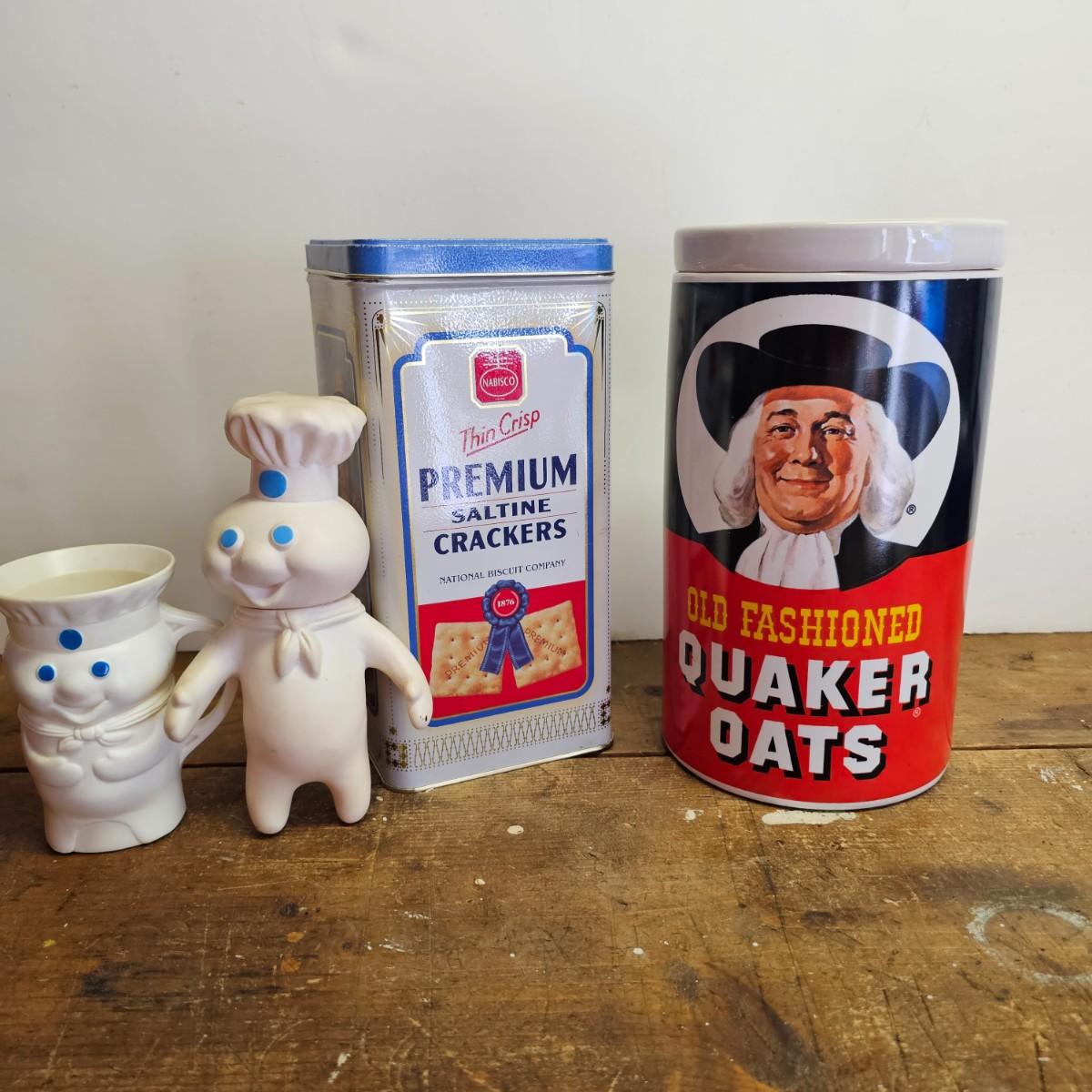 Favorites from the past. One Nabisco saltine tin, 4.5"sq x 9.5"H. Two Pillsbury dough boy items, a small handled plastic cup, 3" x 4.5", and a squeezable rubber figure, 4" x 7"H. Also a Quaker Oats ceramic cooke jar with lid, 5.5"D x 9.5"H. See photos for details. Shipping available
