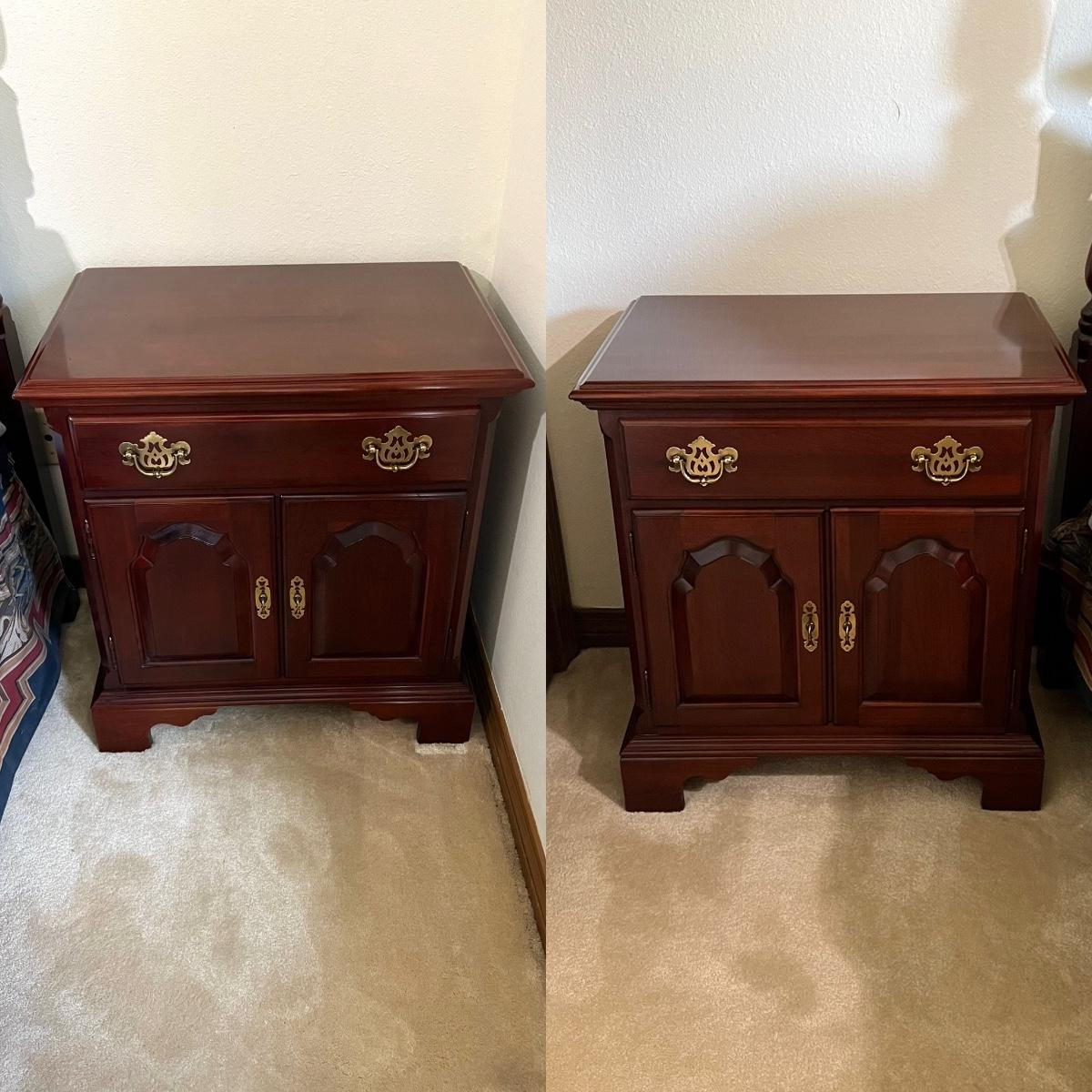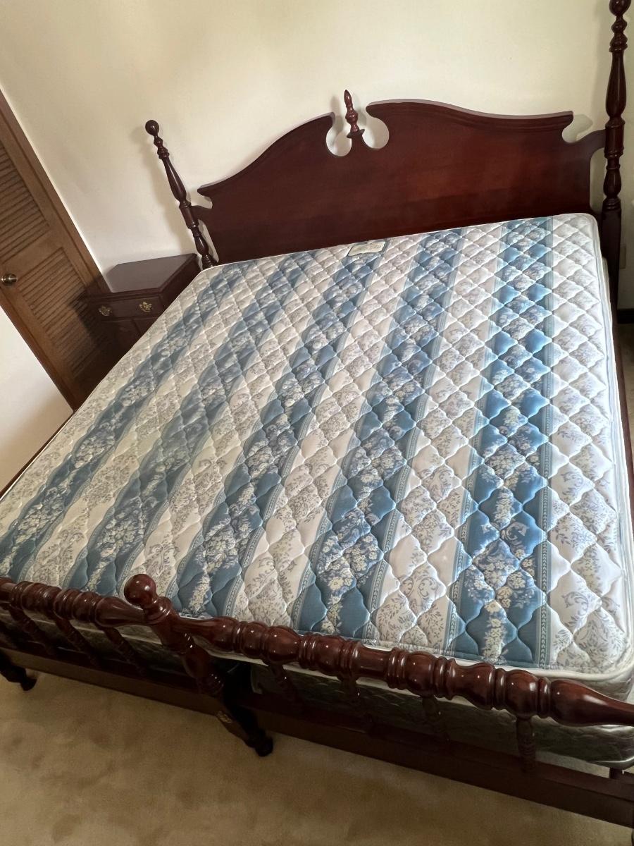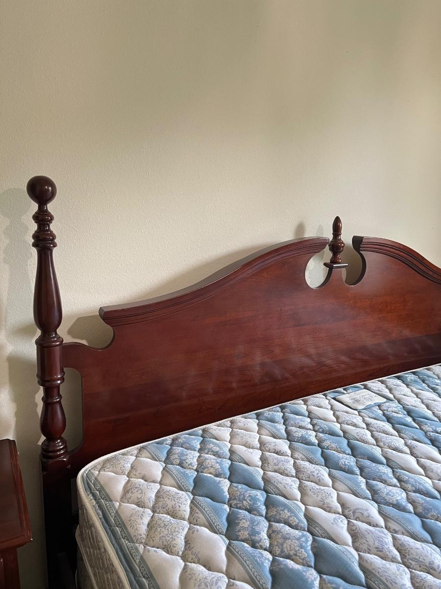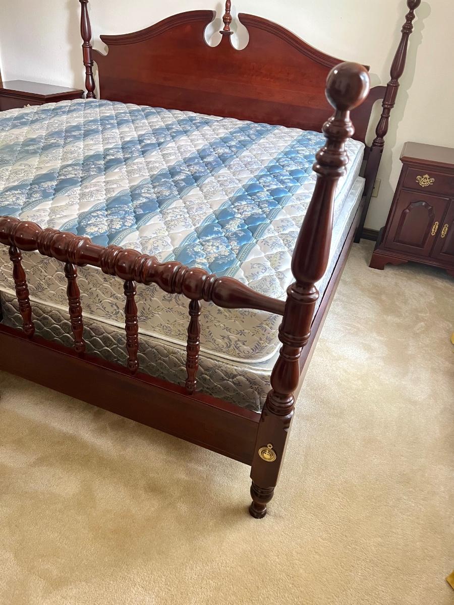 Set includes ~ 1 King bed ~ 2 nightstands ~ King SEALY Mattress ~ 2 Box Springs. Headboard = 54” H ~ Both nightstands = 26” H x 24” W x 16” D ~ No Brand Name Found