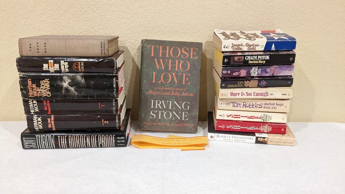 16 varied hardcover and softback novel assortment. Includes Herman Wouk, Robert Shea, and more! 2 Books include personal messages and signatures from the respective author. Neat stuff!