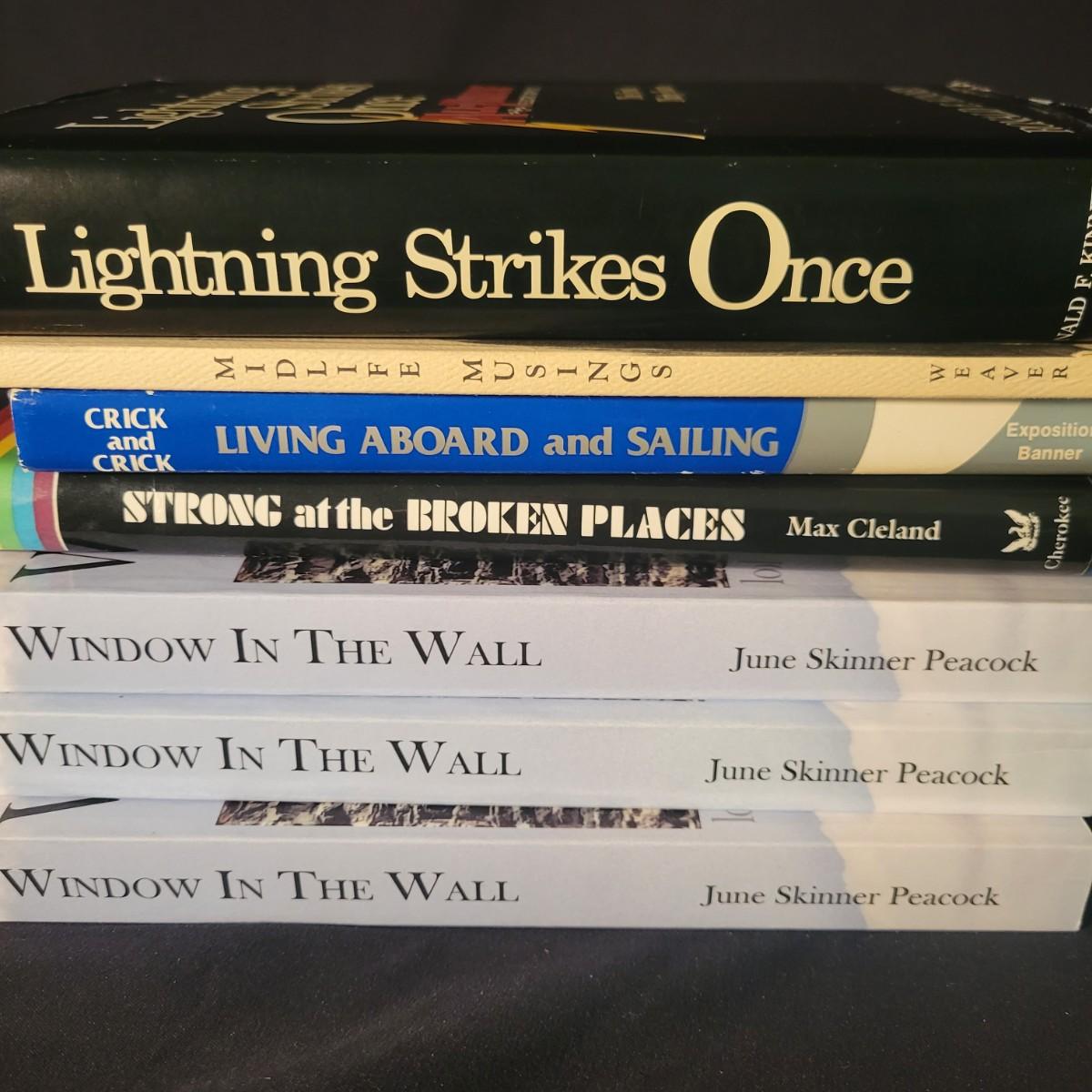 A collection of seven novels in good condition. Includes three signed copies of Window in the Wall by June Skinner Peacock and books also by Robald F Kinney, Max Cleland and More. Shipping available.