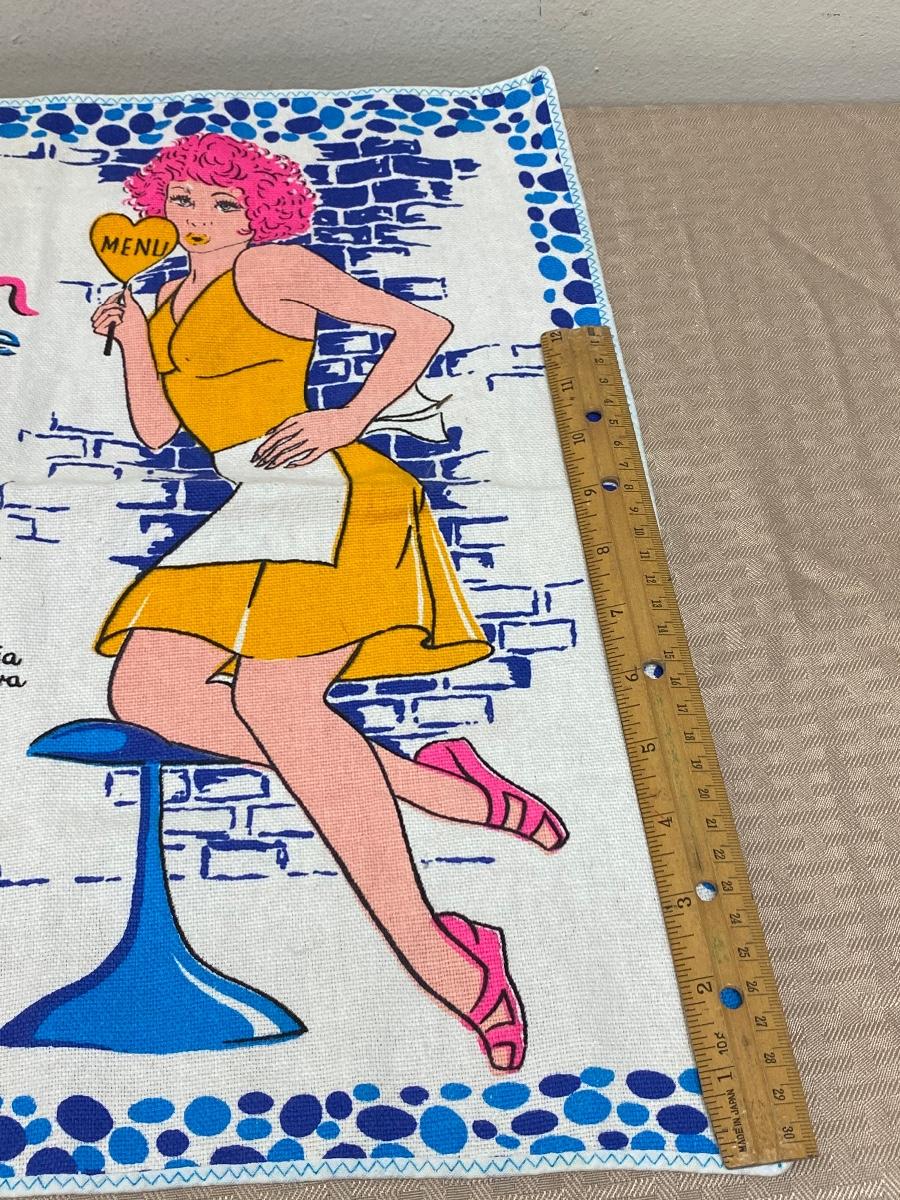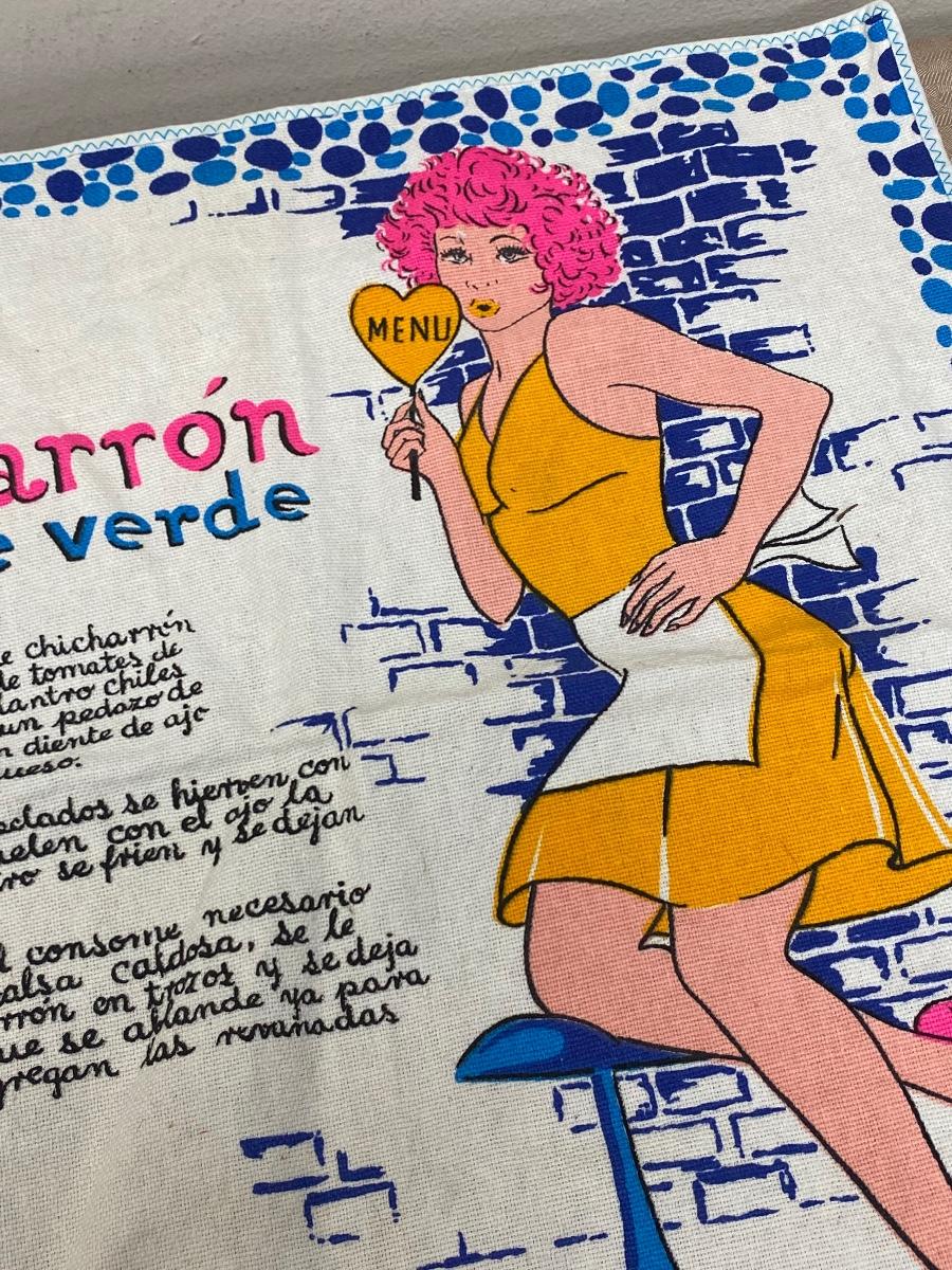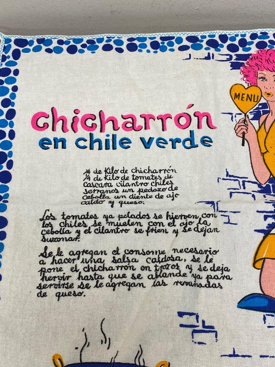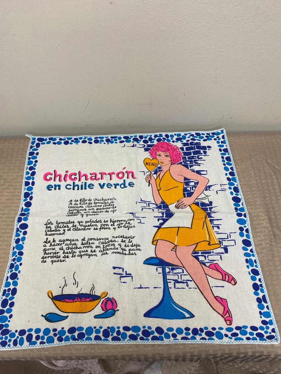 Colorful novelty kitchen towel. Chicharron en Chile Verde recipe in Spanish with a woman in short dress. In good condition. Has a small loop at the corner for convenient hanging use. About 16" square.