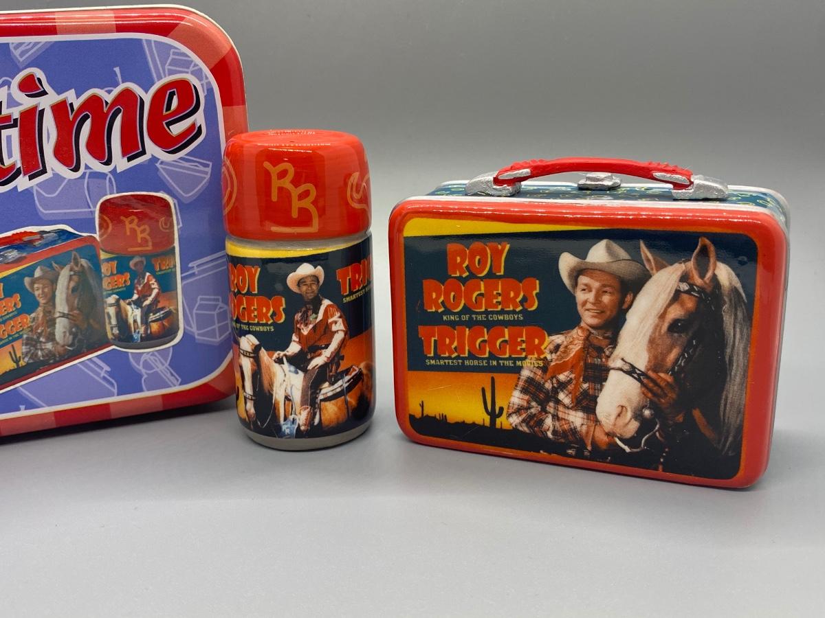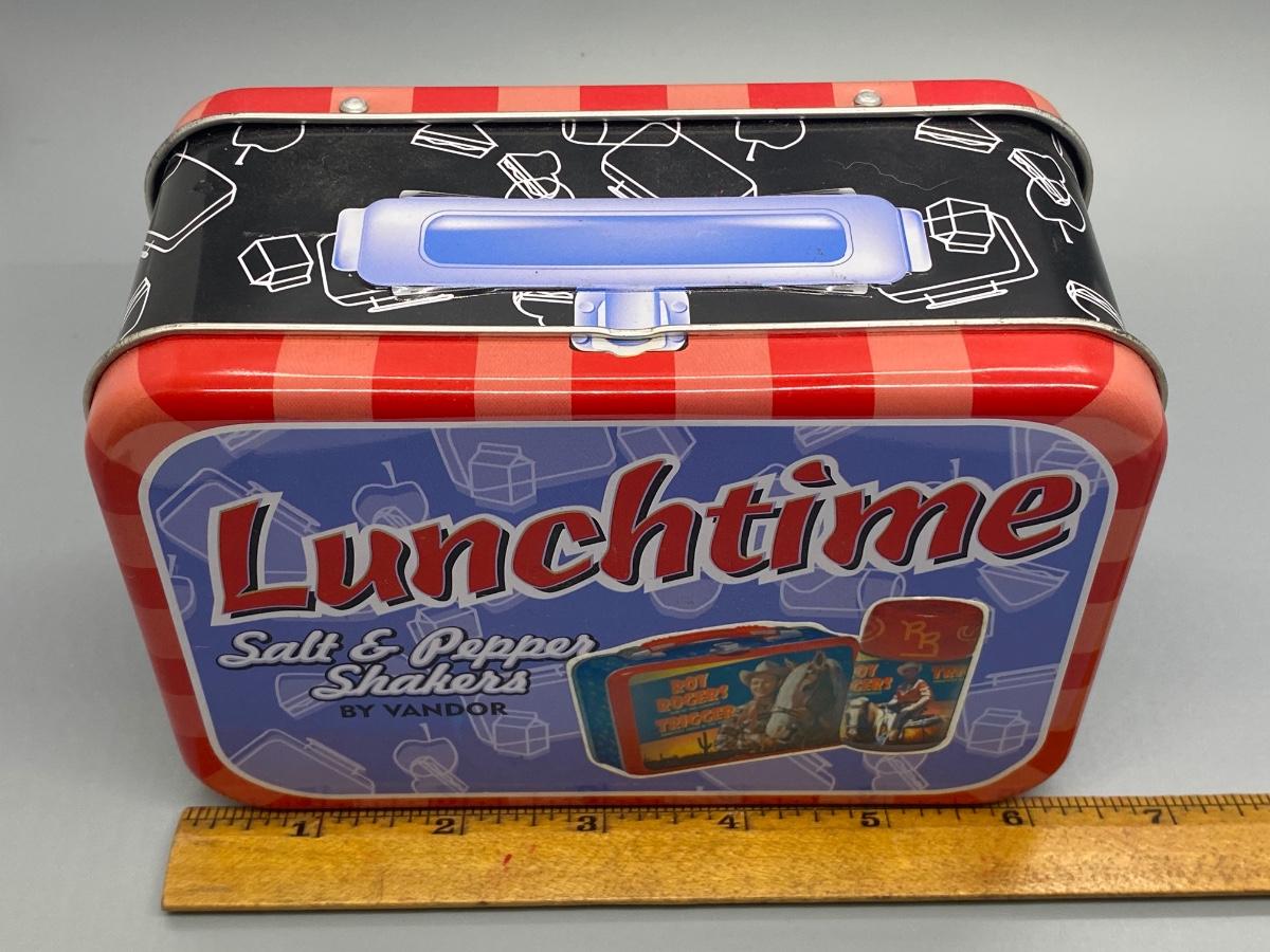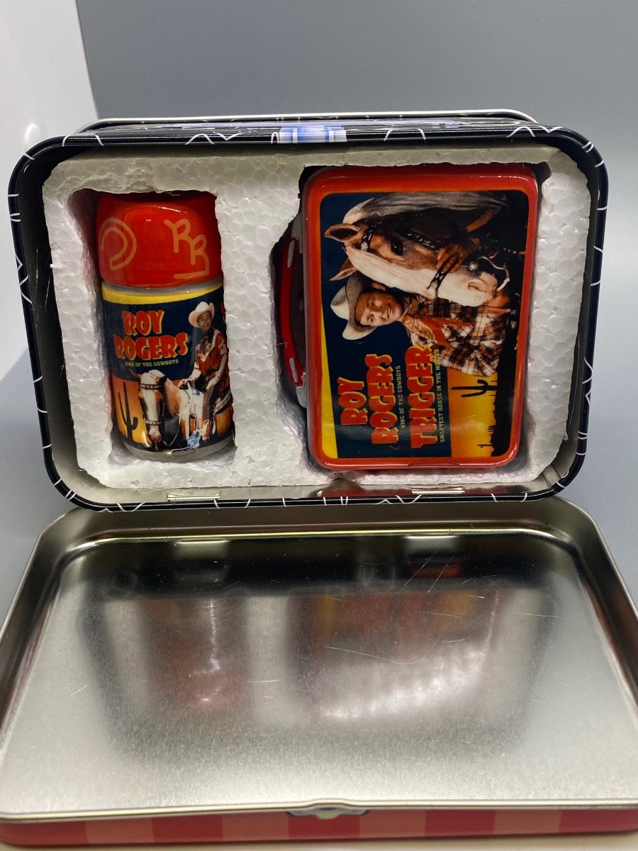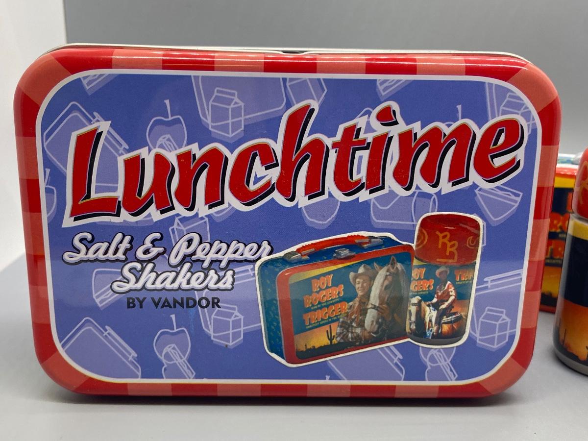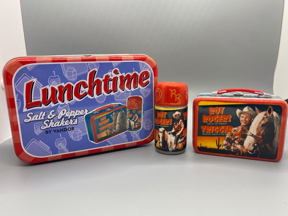 Novelty Roy Rogers lunchbox salt and pepper shakers. Ceramic shakers, one like a lunchbox, one like a thermos. Come packaged in a small tin lunchbox. All items look unused, foam protective holder inside of metal lunchbox to hold shakers.