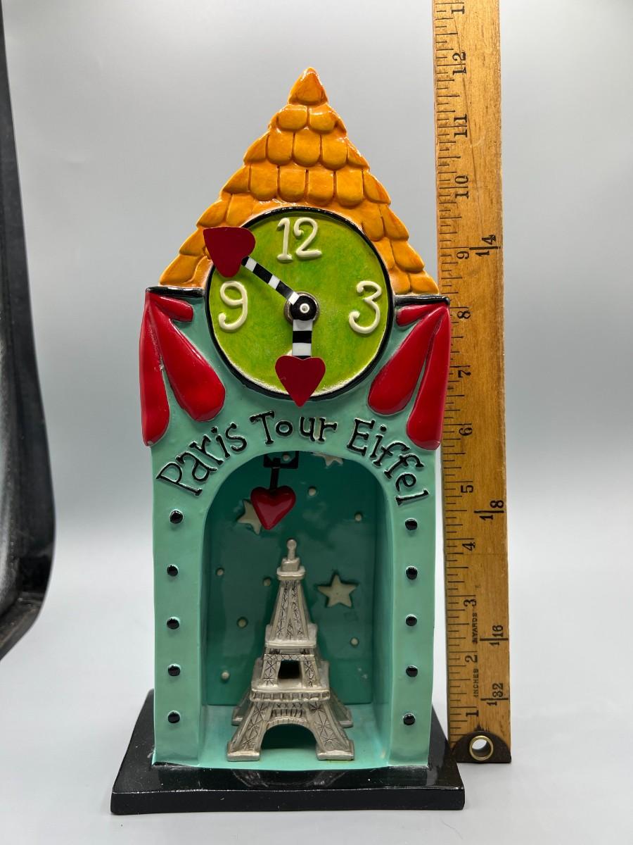 Eiffel Tower novelty clock souvenir. Shelf sitting battery operated clock. Untested but battery terminal is clean. Good condition, about 12" size. Back piece is held in place with small magnets covering battery terminal.