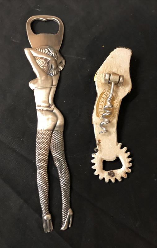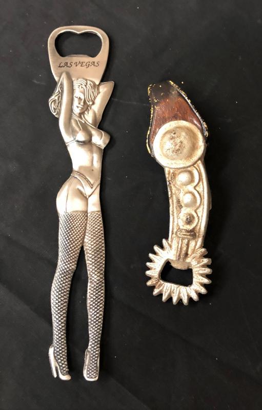 A pair of western novelty bottle openers...Las Vegas and Spurs...