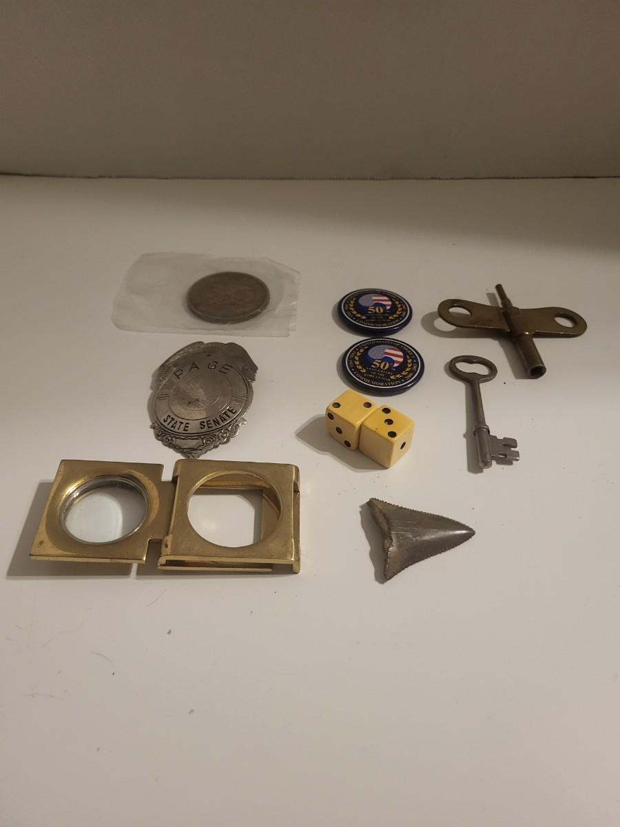 NRA COIN, STATE SENATE BADGE, VINTAGE DICE, SKELETON KEY AND MORE